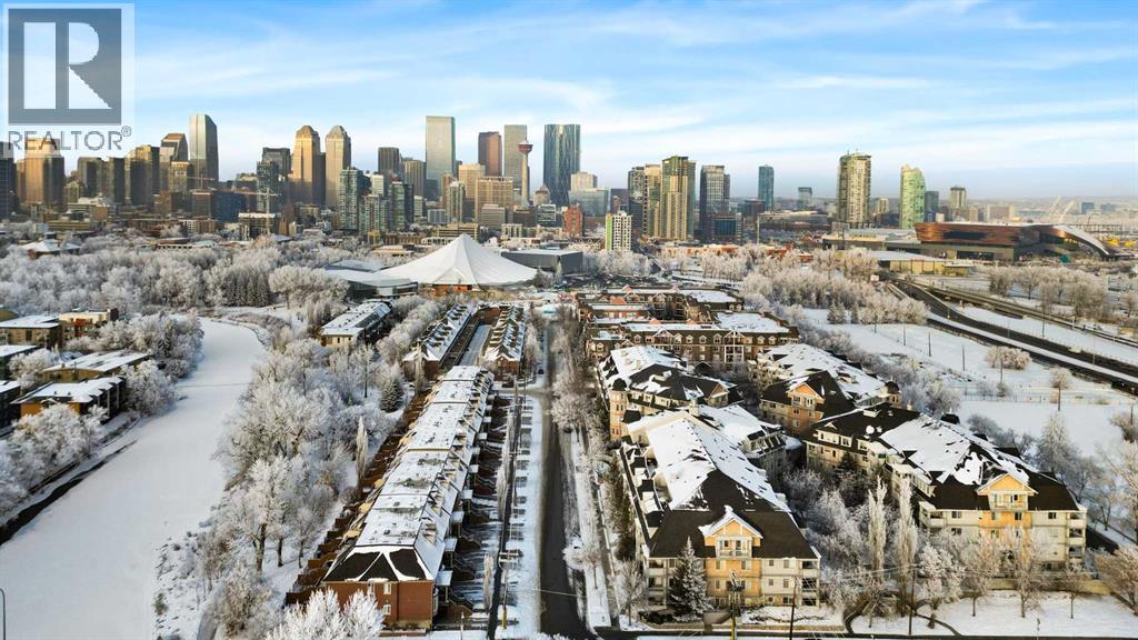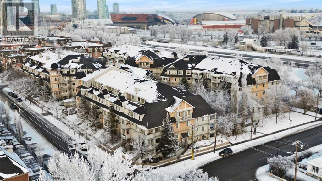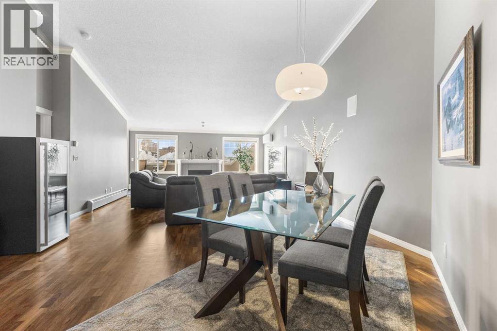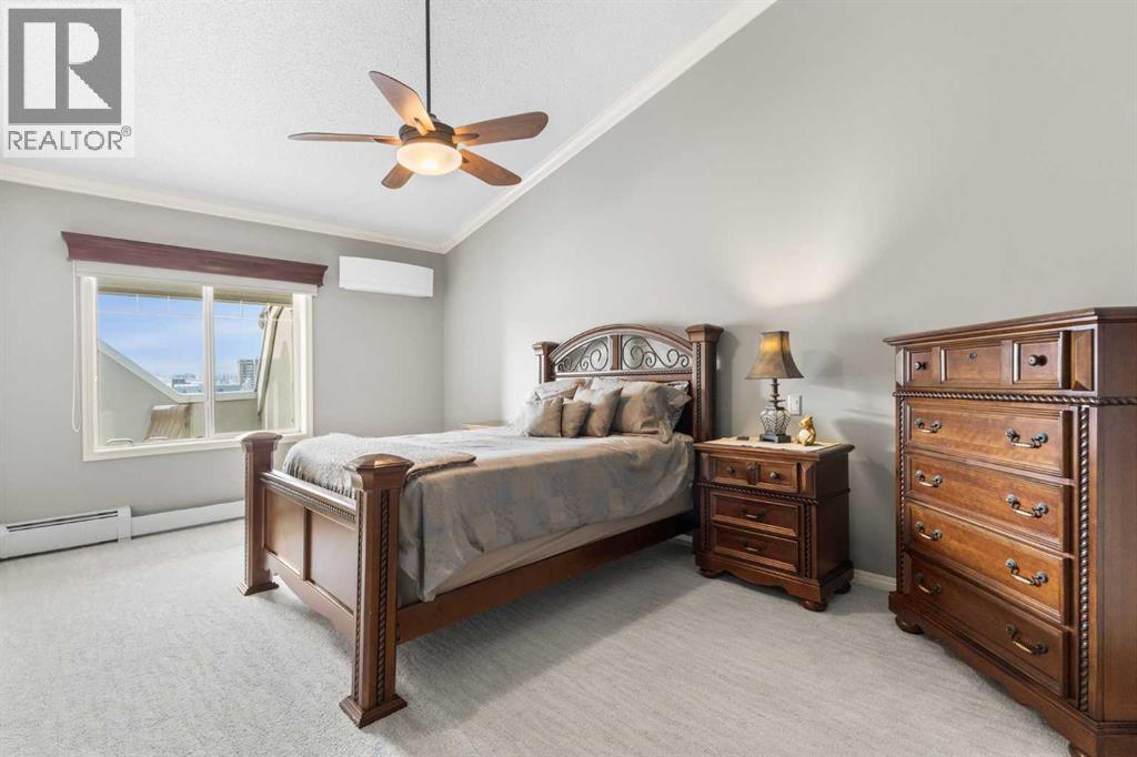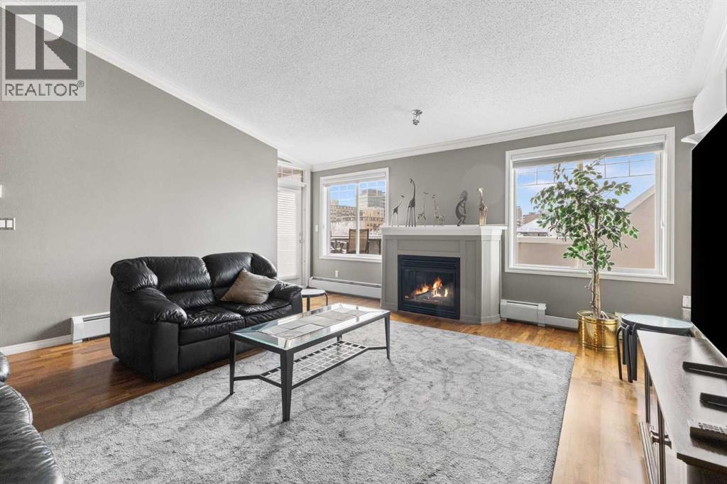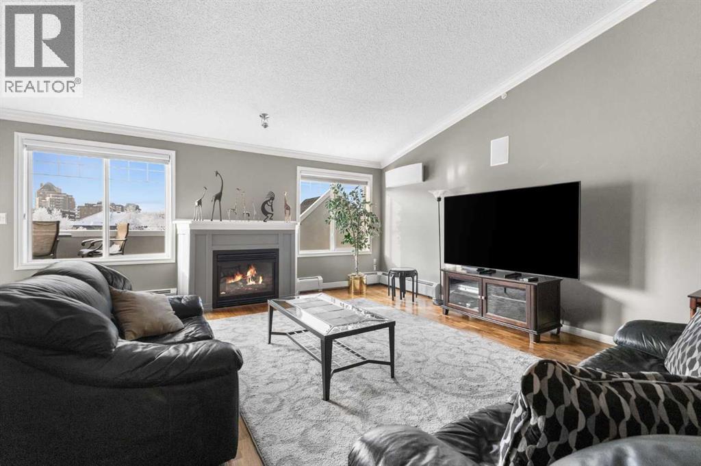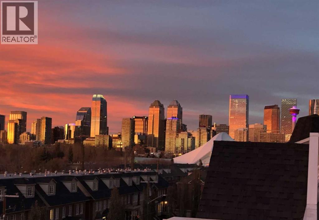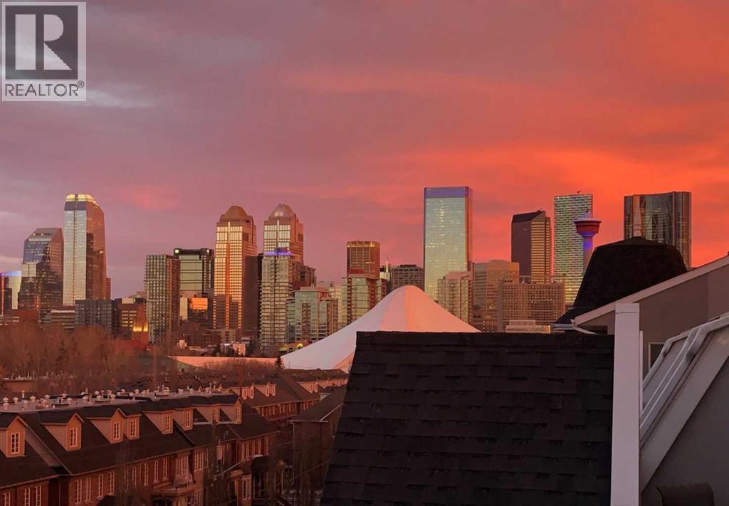 Expansive Top Floor End Unit with City and Downtown Views! This beautifully maintained 2-bedroom, 2.5-bath top floor end unit offers stunning city and downtown vistas, reflecting pride of ownership in every detail. Its open concept design showcases elegant hardwood flooring, vaulted ceilings, and crown moulding, with abundant natural light illuminating the space. The kitchen is tastefully appointed with granite countertops, an island/eating bar, and generous storage solutions including a walk-in pantry. Recent upgrades feature newer appliances, highlighted by a high-end Miele dishwasher. The adjacent dining area provides ample room for entertaining family and friends. The welcoming living room, complete with a feature fireplace, serves as an ideal gathering space for relaxation and socializing. The expansive primary bedroom is enhanced by built-in cabinetry and a custom walk-in closet crafted by California Closets. The private five-piece ensuite features dual sinks, a luxurious soaker tub, and a rejuvenating steam shower. Perfect for use as a home office, the second bedroom includes balcony access, two Murphy beds (one queen, one twin), a walk-in closet by California Closets, and its own private four-piece ensuite. Other notable features include in-suite laundry with additional storage, updated flooring installed in 2016, a Daikin air conditioning unit added in fall 2020, front entrance closet designed by California Closets, spacious deck offering panoramic city and downtown views, and three parking stalls—one titled, two leased—plus a dedicated storage space. This residence is perfectly situated just steps away from the Erlton-Stampede C-train station, the picturesque Elbow River pathways and close to several amenities, including Stampede Park, MNP Community & Sport Centre, the serene Reader Rock Gardens, schools, shopping, and is within walking distance to downtown. (31500153)