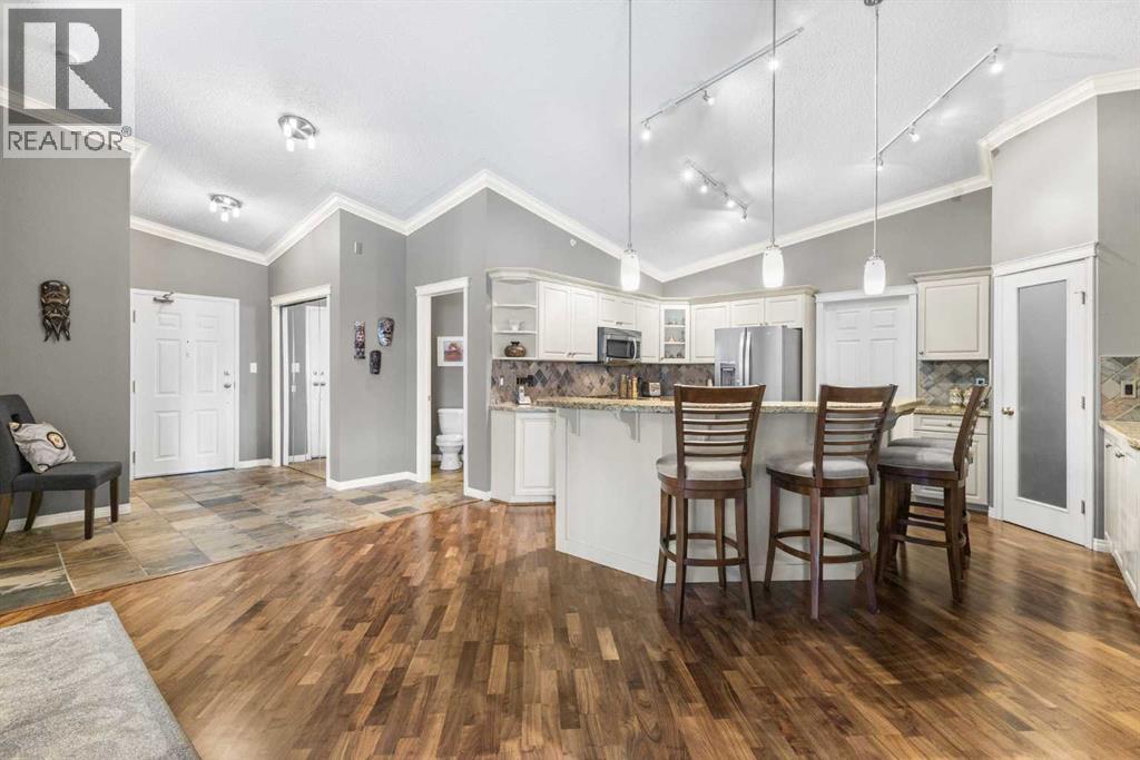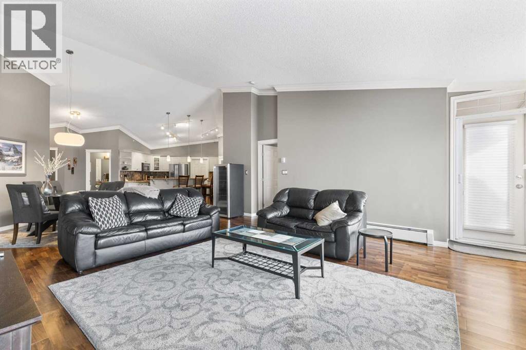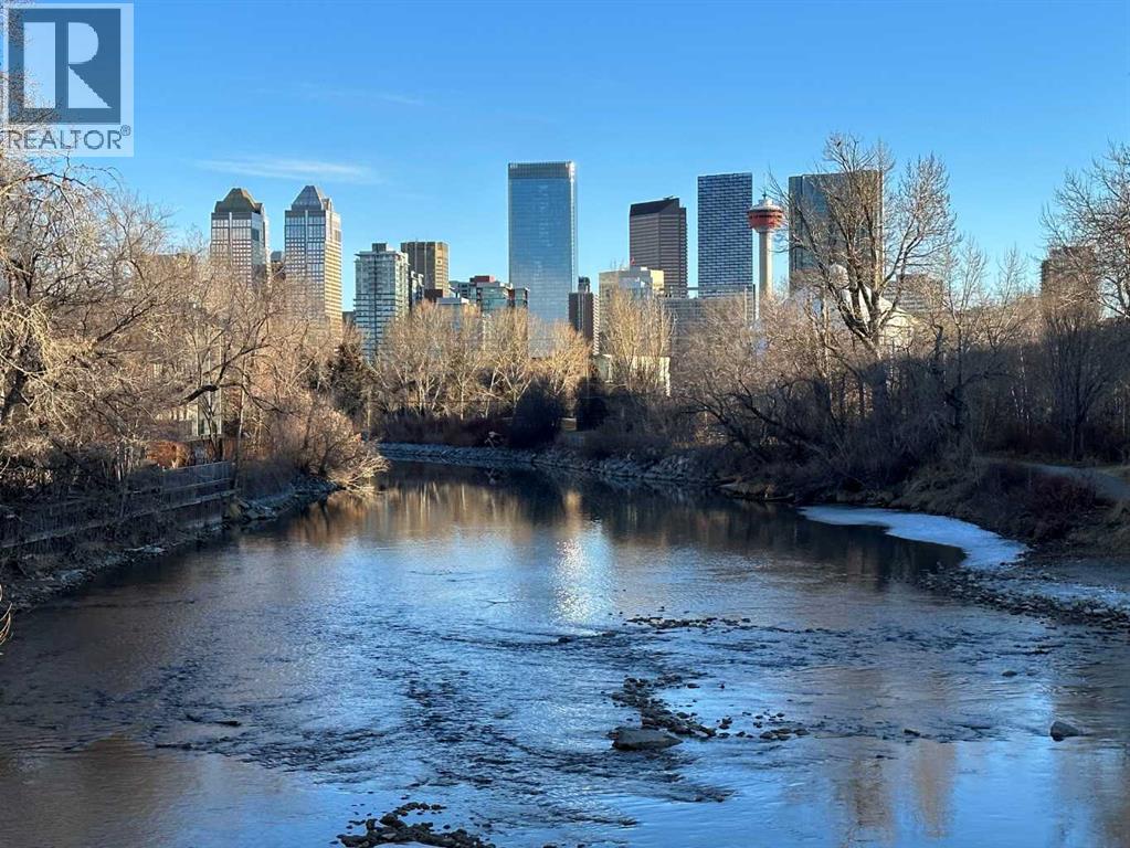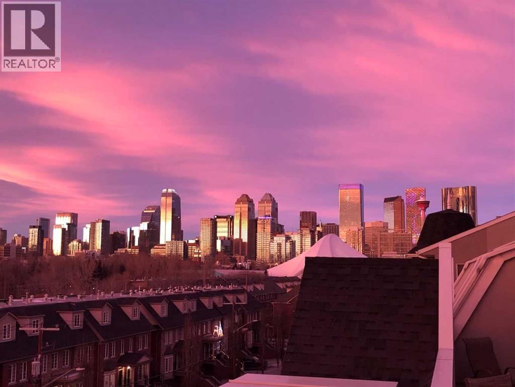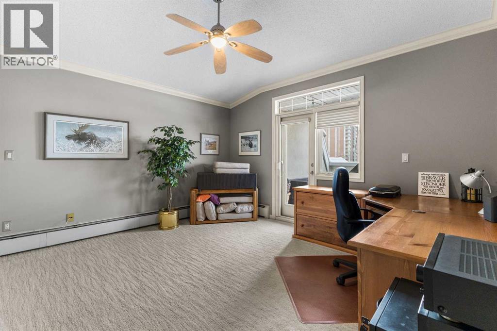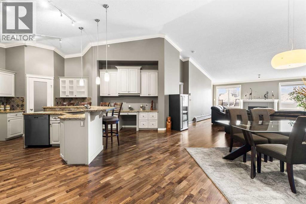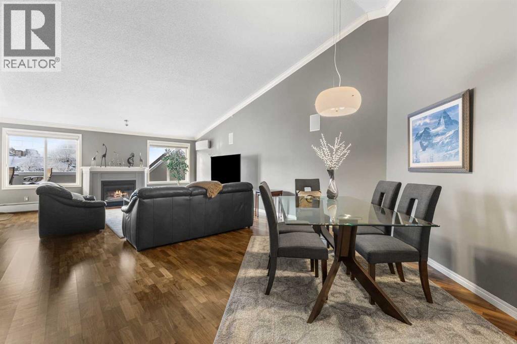 Expansive Top Floor End Unit with City and Downtown Views! This beautifully maintained 2-bedroom, 2.5-bath top floor end unit offers stunning city and downtown vistas, reflecting pride of ownership in every detail. Its open concept design showcases elegant hardwood flooring, vaulted ceilings, and crown moulding, with abundant natural light illuminating the space. The kitchen is tastefully appointed with granite countertops, an island/eating bar, and generous storage solutions including a walk-in pantry. Recent upgrades feature newer appliances, highlighted by a high-end Miele dishwasher. The adjacent dining area provides ample room for entertaining family and friends. The welcoming living room, complete with a feature fireplace, serves as an ideal gathering space for relaxation and socializing. The expansive primary bedroom is enhanced by built-in cabinetry and a custom walk-in closet crafted by California Closets. The private five-piece ensuite features dual sinks, a luxurious soaker tub, and a rejuvenating steam shower. Perfect for use as a home office, the second bedroom includes balcony access, two Murphy beds (one queen, one twin), a walk-in closet by California Closets, and its own private four-piece ensuite. Other notable features include in-suite laundry with additional storage, updated flooring installed in 2016, a Daikin air conditioning unit added in fall 2020, front entrance closet designed by California Closets, spacious deck offering panoramic city and downtown views, and three parking stalls—one titled, two leased—plus a dedicated storage space. This residence is perfectly situated just steps away from the Erlton-Stampede C-train station, the picturesque Elbow River pathways and close to several amenities, including Stampede Park, MNP Community & Sport Centre, the serene Reader Rock Gardens, schools, shopping, and is within walking distance to downtown. (31500153)