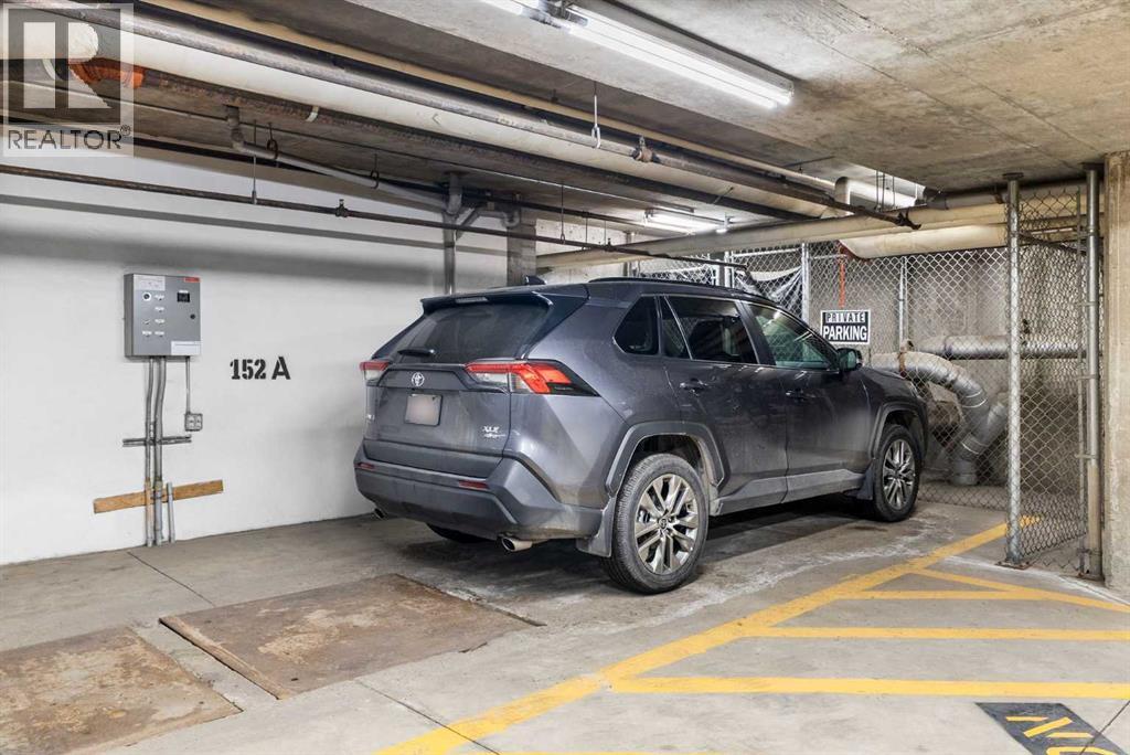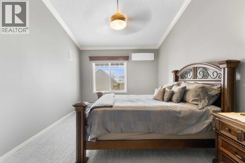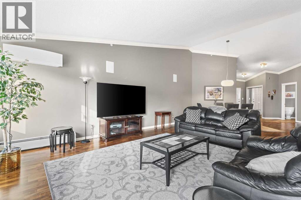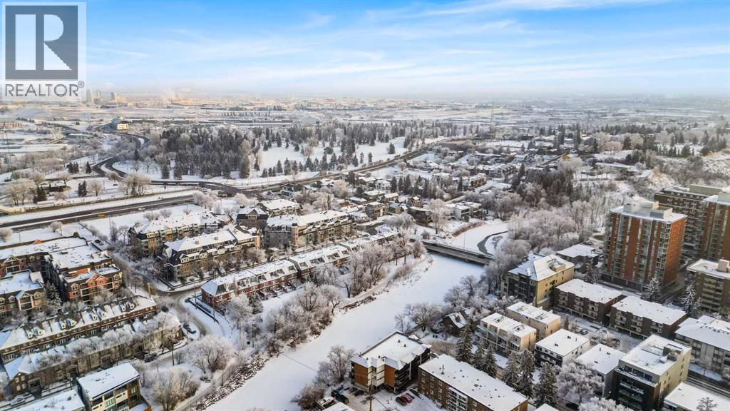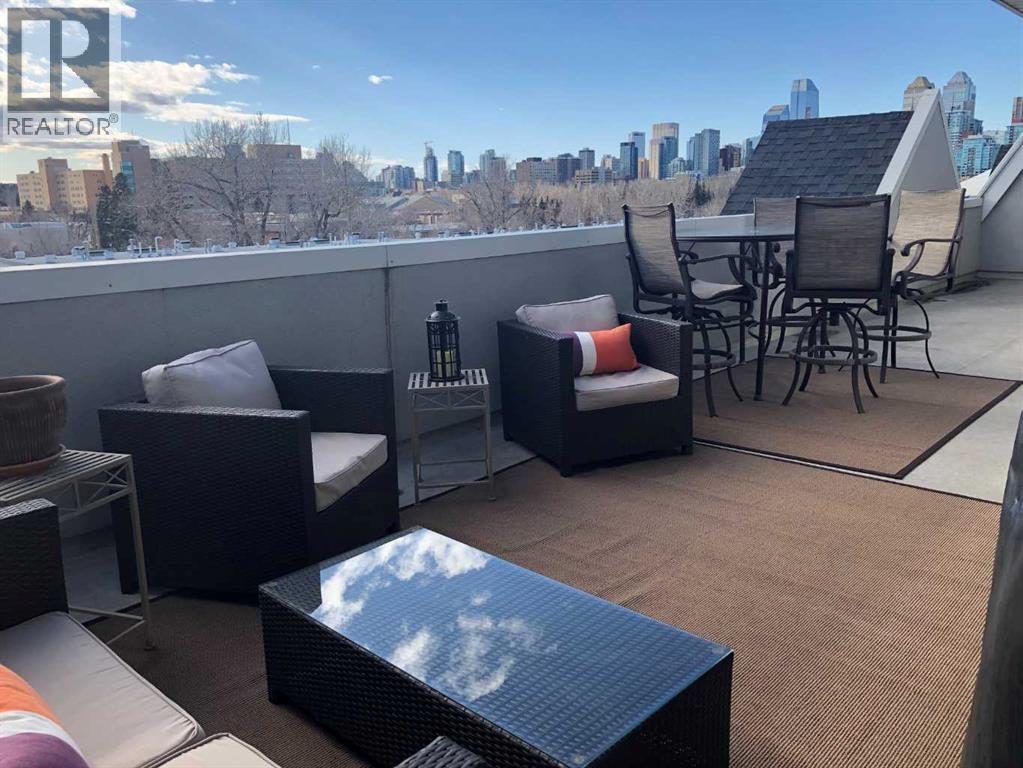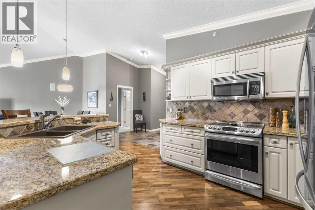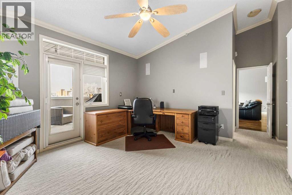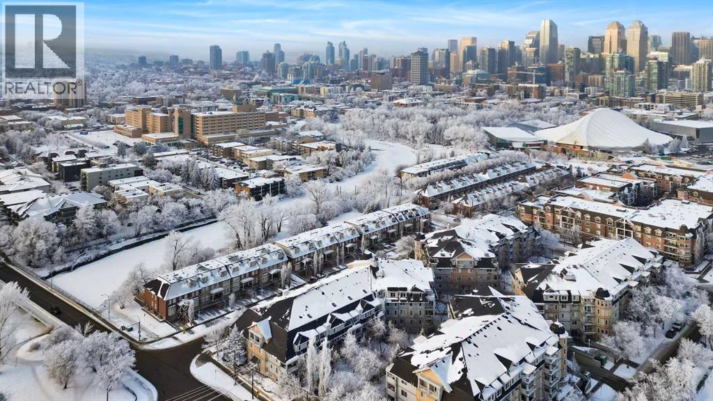 Expansive Top Floor End Unit with City and Downtown Views! This beautifully maintained 2-bedroom, 2.5-bath top floor end unit offers stunning city and downtown vistas, reflecting pride of ownership in every detail. Its open concept design showcases elegant hardwood flooring, vaulted ceilings, and crown moulding, with abundant natural light illuminating the space. The kitchen is tastefully appointed with granite countertops, an island/eating bar, and generous storage solutions including a walk-in pantry. Recent upgrades feature newer appliances, highlighted by a high-end Miele dishwasher. The adjacent dining area provides ample room for entertaining family and friends. The welcoming living room, complete with a feature fireplace, serves as an ideal gathering space for relaxation and socializing. The expansive primary bedroom is enhanced by built-in cabinetry and a custom walk-in closet crafted by California Closets. The private five-piece ensuite features dual sinks, a luxurious soaker tub, and a rejuvenating steam shower. Perfect for use as a home office, the second bedroom includes balcony access, two Murphy beds (one queen, one twin), a walk-in closet by California Closets, and its own private four-piece ensuite. Other notable features include in-suite laundry with additional storage, updated flooring installed in 2016, a Daikin air conditioning unit added in fall 2020, front entrance closet designed by California Closets, spacious deck offering panoramic city and downtown views, and three parking stalls—one titled, two leased—plus a dedicated storage space. This residence is perfectly situated just steps away from the Erlton-Stampede C-train station, the picturesque Elbow River pathways and close to several amenities, including Stampede Park, MNP Community & Sport Centre, the serene Reader Rock Gardens, schools, shopping, and is within walking distance to downtown. (31500153)