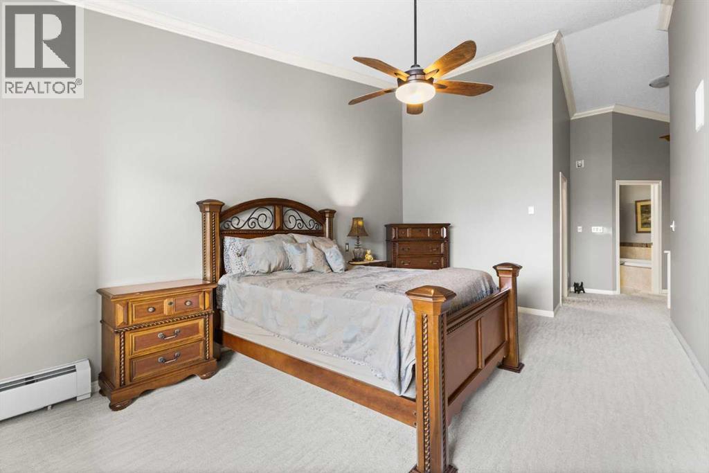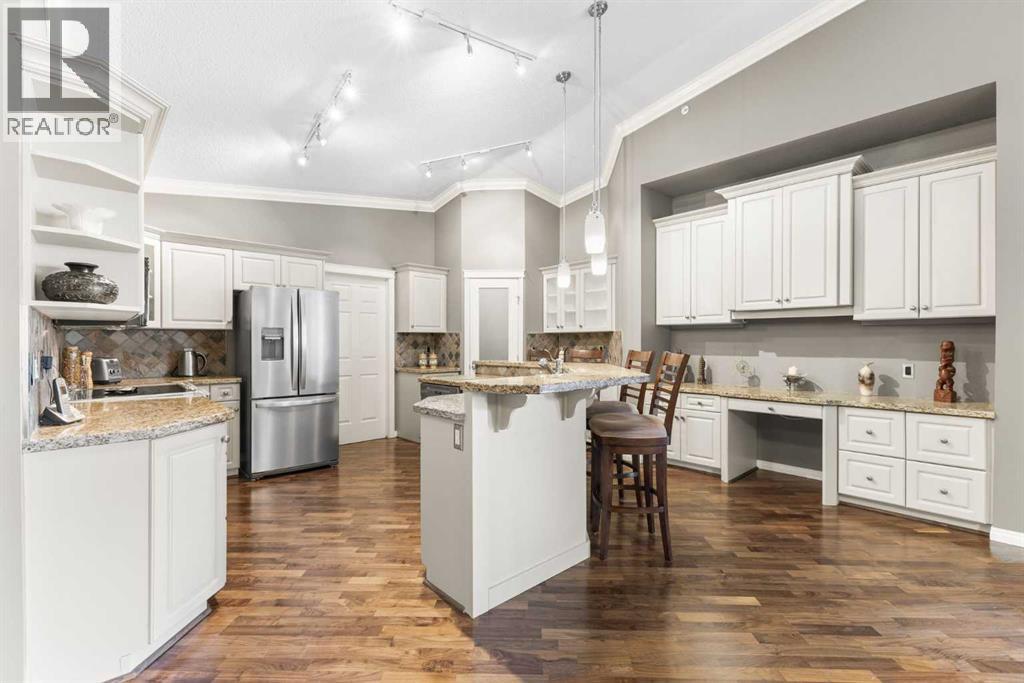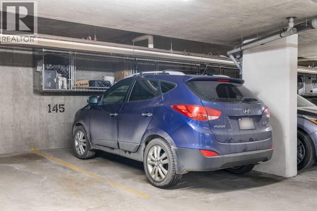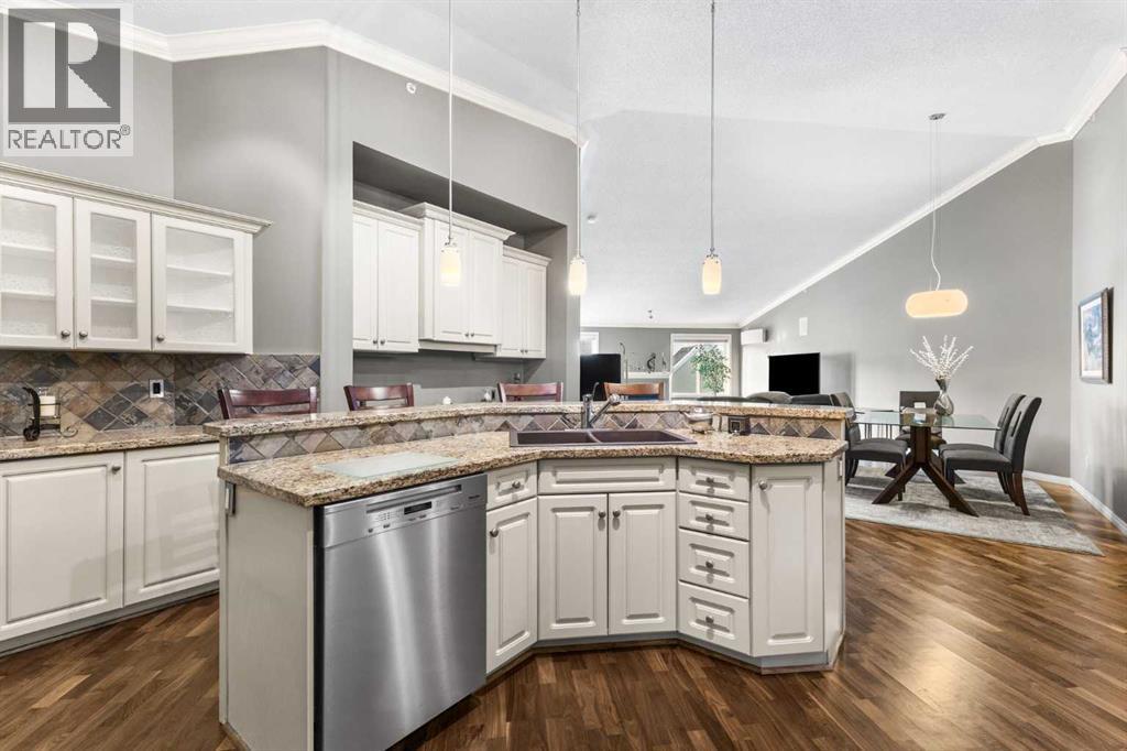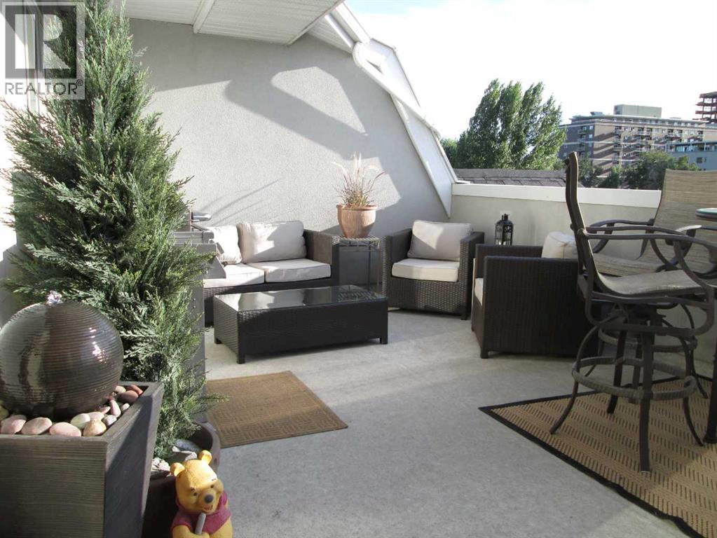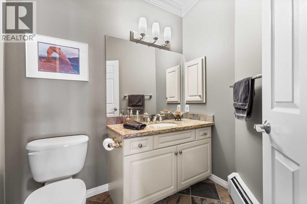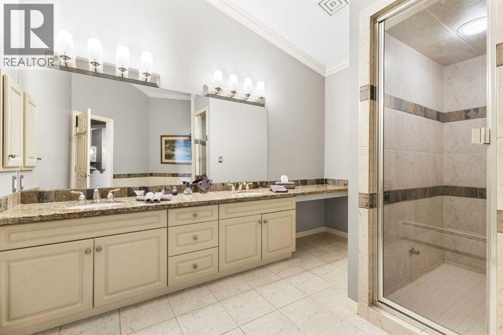 Expansive Top Floor End Unit with City and Downtown Views! This beautifully maintained 2-bedroom, 2.5-bath top floor end unit offers stunning city and downtown vistas, reflecting pride of ownership in every detail. Its open concept design showcases elegant hardwood flooring, vaulted ceilings, and crown moulding, with abundant natural light illuminating the space. The kitchen is tastefully appointed with granite countertops, an island/eating bar, and generous storage solutions including a walk-in pantry. Recent upgrades feature newer appliances, highlighted by a high-end Miele dishwasher. The adjacent dining area provides ample room for entertaining family and friends. The welcoming living room, complete with a feature fireplace, serves as an ideal gathering space for relaxation and socializing. The expansive primary bedroom is enhanced by built-in cabinetry and a custom walk-in closet crafted by California Closets. The private five-piece ensuite features dual sinks, a luxurious soaker tub, and a rejuvenating steam shower. Perfect for use as a home office, the second bedroom includes balcony access, two Murphy beds (one queen, one twin), a walk-in closet by California Closets, and its own private four-piece ensuite. Other notable features include in-suite laundry with additional storage, updated flooring installed in 2016, a Daikin air conditioning unit added in fall 2020, front entrance closet designed by California Closets, spacious deck offering panoramic city and downtown views, and three parking stalls—one titled, two leased—plus a dedicated storage space. This residence is perfectly situated just steps away from the Erlton-Stampede C-train station, the picturesque Elbow River pathways and close to several amenities, including Stampede Park, MNP Community & Sport Centre, the serene Reader Rock Gardens, schools, shopping, and is within walking distance to downtown. (31500153)