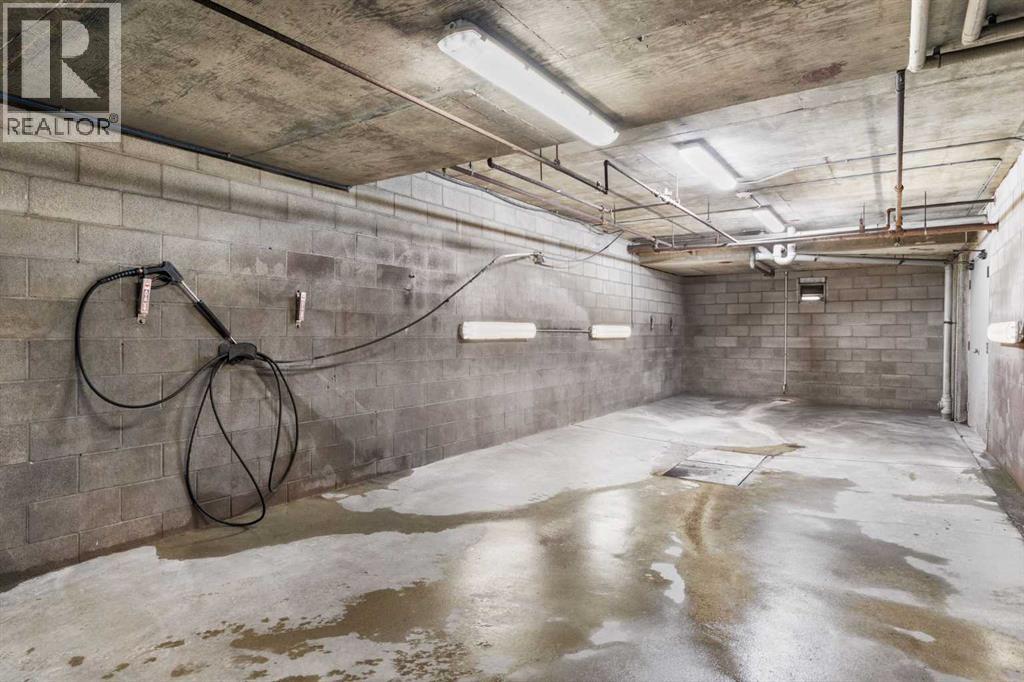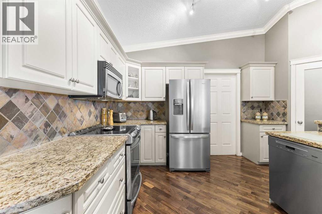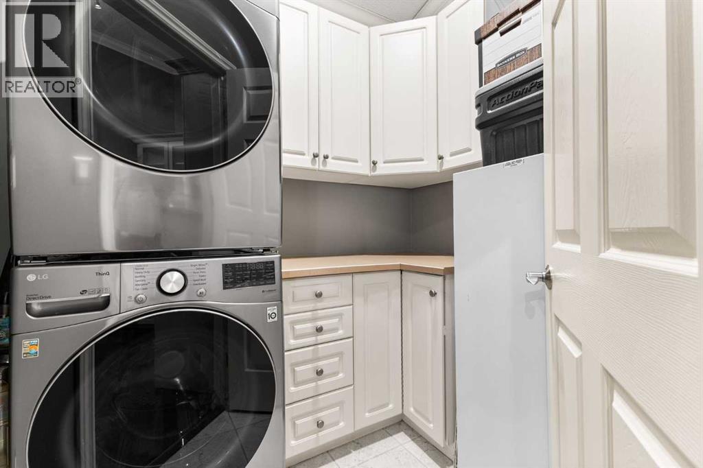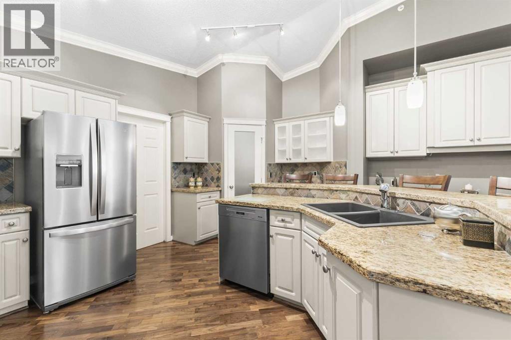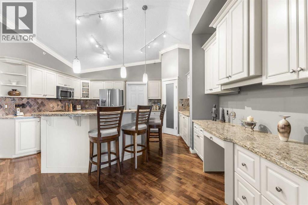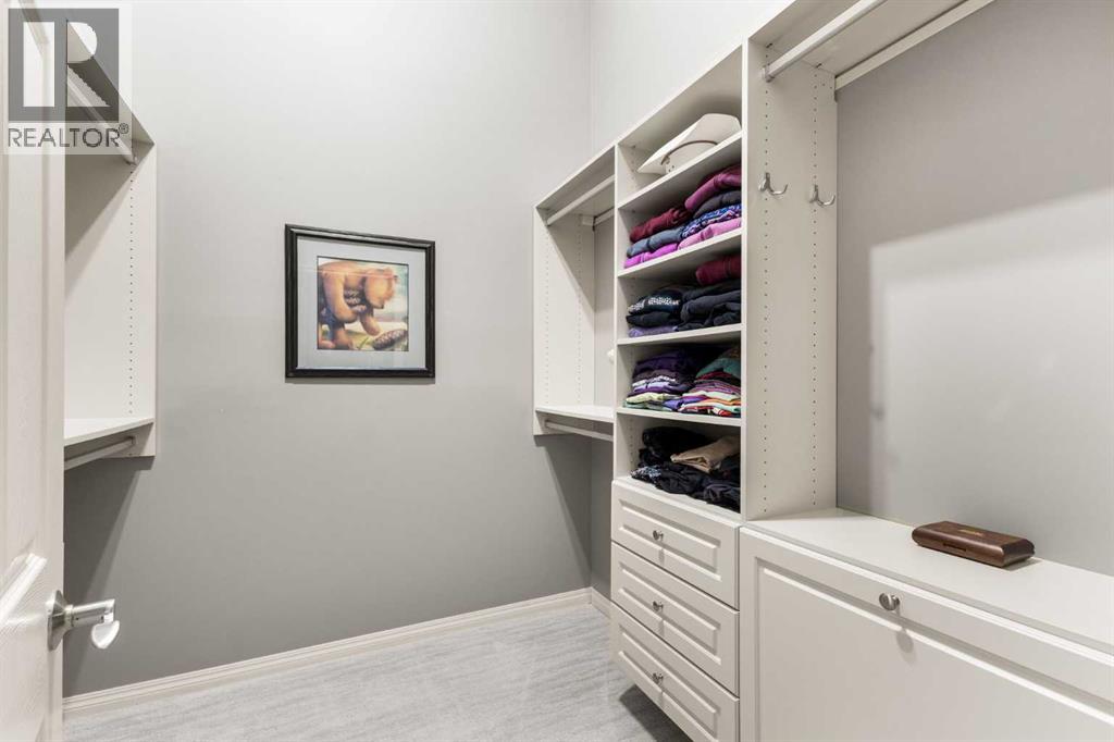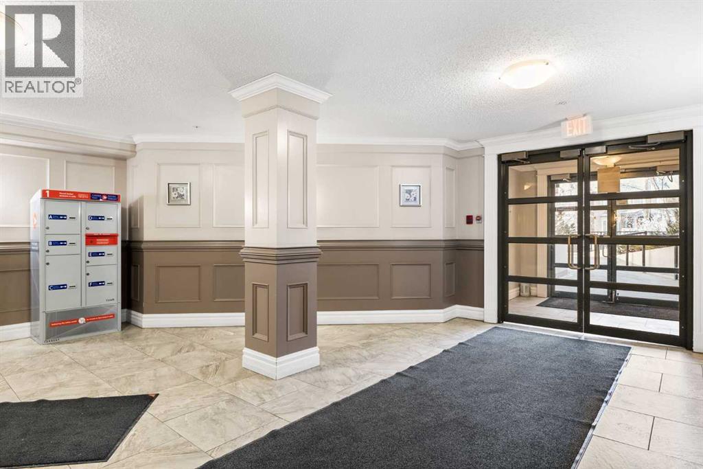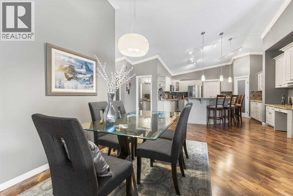 Expansive Top Floor End Unit with City and Downtown Views! This beautifully maintained 2-bedroom, 2.5-bath top floor end unit offers stunning city and downtown vistas, reflecting pride of ownership in every detail. Its open concept design showcases elegant hardwood flooring, vaulted ceilings, and crown moulding, with abundant natural light illuminating the space. The kitchen is tastefully appointed with granite countertops, an island/eating bar, and generous storage solutions including a walk-in pantry. Recent upgrades feature newer appliances, highlighted by a high-end Miele dishwasher. The adjacent dining area provides ample room for entertaining family and friends. The welcoming living room, complete with a feature fireplace, serves as an ideal gathering space for relaxation and socializing. The expansive primary bedroom is enhanced by built-in cabinetry and a custom walk-in closet crafted by California Closets. The private five-piece ensuite features dual sinks, a luxurious soaker tub, and a rejuvenating steam shower. Perfect for use as a home office, the second bedroom includes balcony access, two Murphy beds (one queen, one twin), a walk-in closet by California Closets, and its own private four-piece ensuite. Other notable features include in-suite laundry with additional storage, updated flooring installed in 2016, a Daikin air conditioning unit added in fall 2020, front entrance closet designed by California Closets, spacious deck offering panoramic city and downtown views, and three parking stalls—one titled, two leased—plus a dedicated storage space. This residence is perfectly situated just steps away from the Erlton-Stampede C-train station, the picturesque Elbow River pathways and close to several amenities, including Stampede Park, MNP Community & Sport Centre, the serene Reader Rock Gardens, schools, shopping, and is within walking distance to downtown. (31500153)
