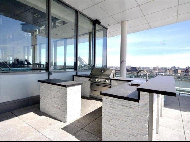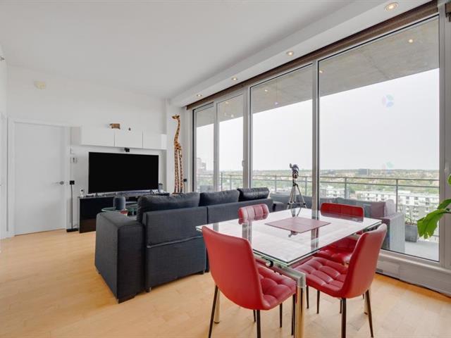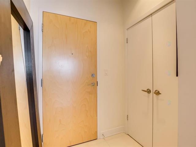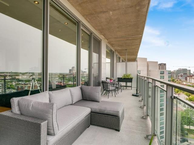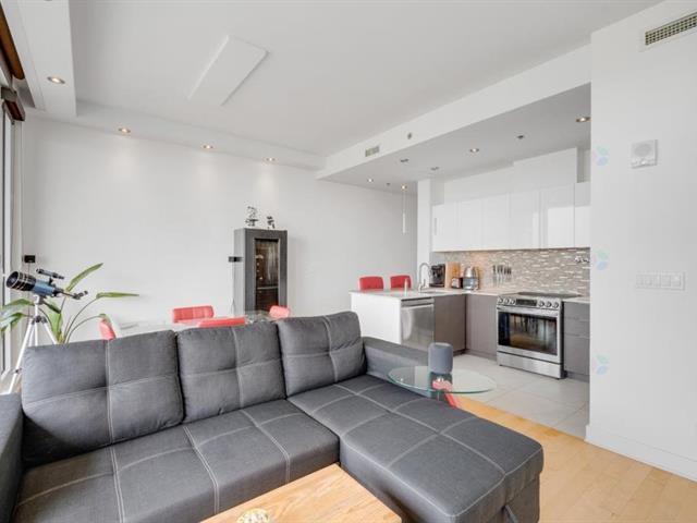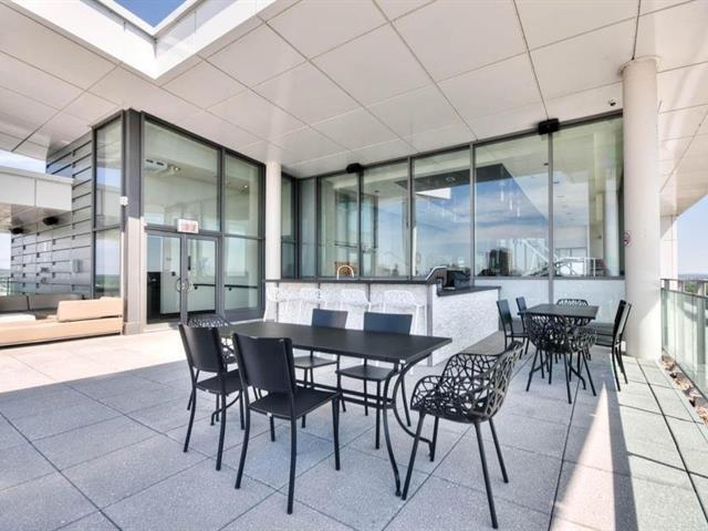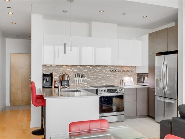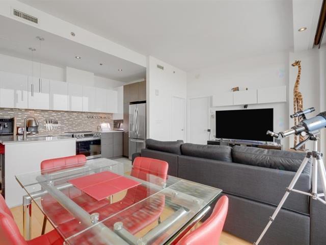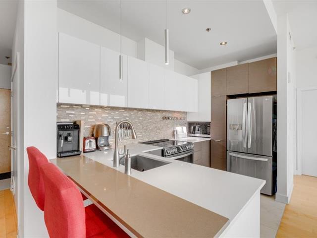 Beautiful one bedroom condo offering spectacular views, located in the prestigious Le Viu complex. Filled with natural light, this elegant unit combines comfort and modern design to meet all your needs. Features include central air conditioning, motorized blinds with rechargeable batteries, and high-end appliances. The modern kitchen showcases sleek contemporary cabinetry and quartz countertops, while the bedroom offers equally stunning views and a spacious walk-in closet. Enjoy a large private balcony extending the full length of the condo, perfect for relaxing or entertaining. The unit also includes one indoor parking space (56313540)