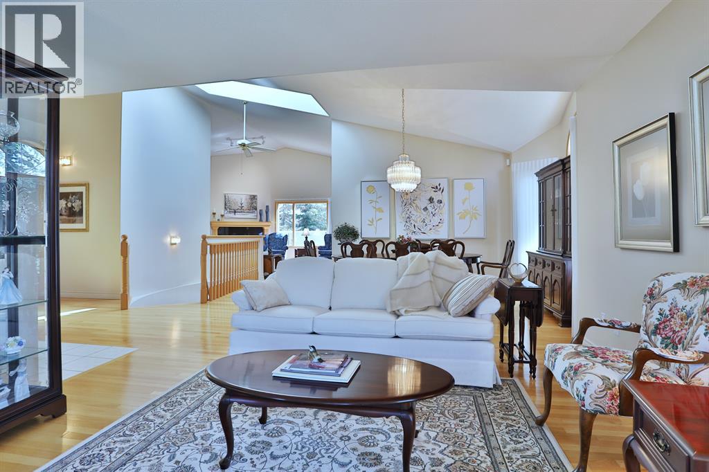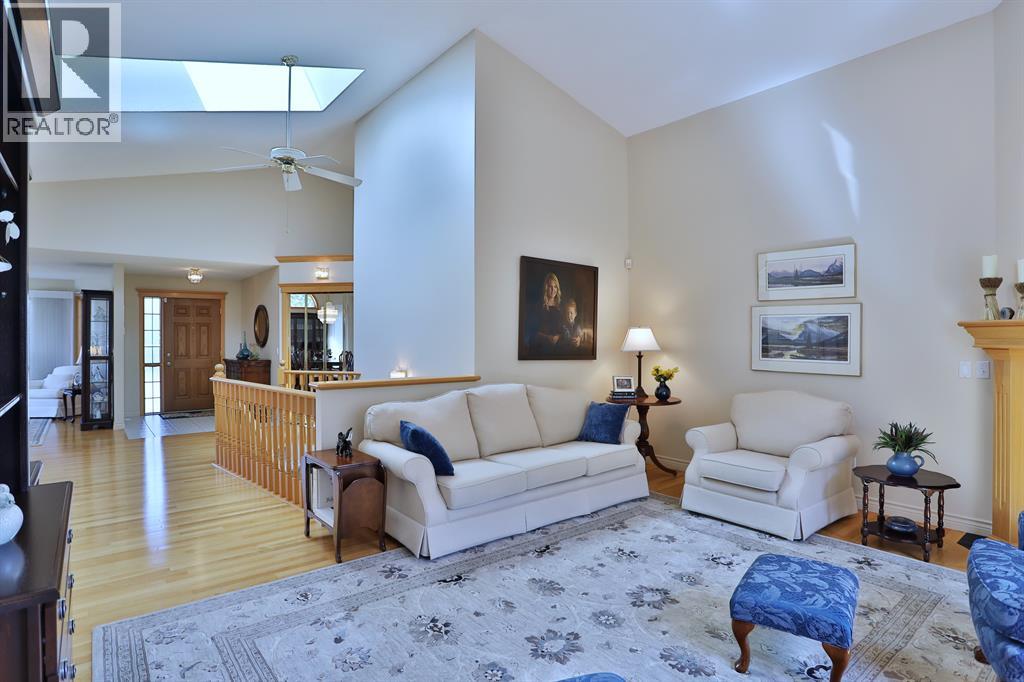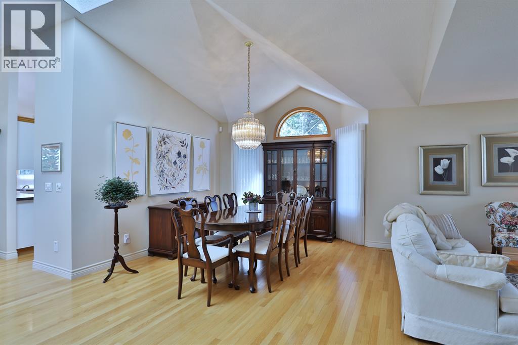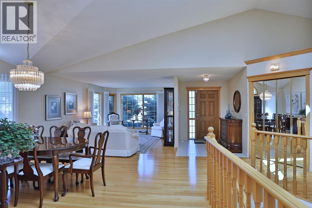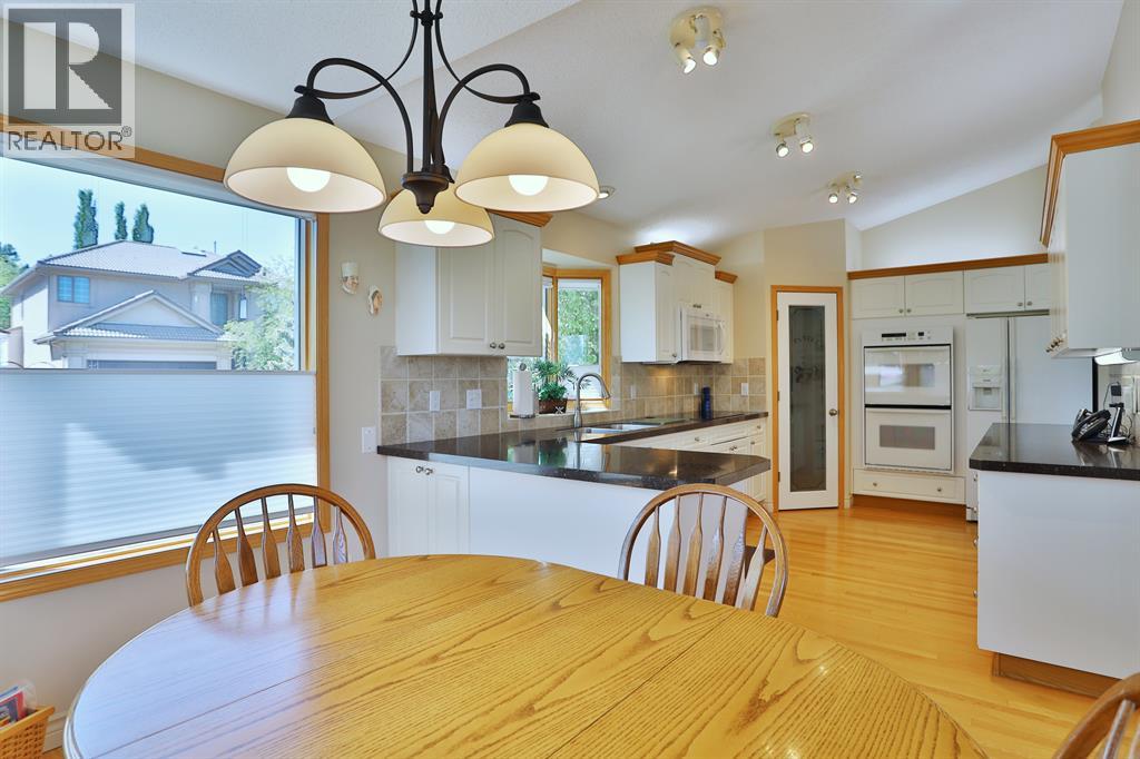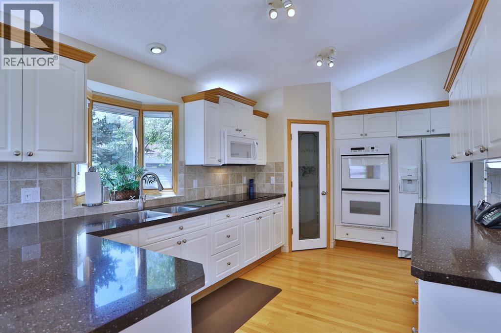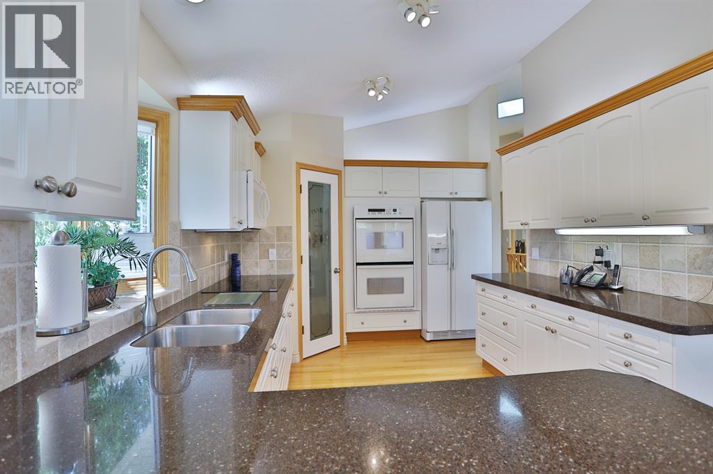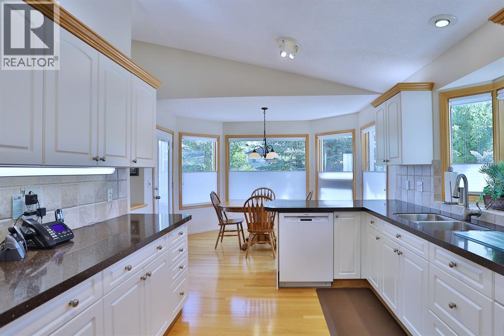 Backing onto a park in exclusive Hamptons Square is where you’ll find this beautifully maintained home in the highly-desirable golf course community of the Hamptons. Built by Calbridge on this wonderful corner lot, this mint condition walkout bungalow enjoys gleaming hardwood floors & skylights, 4 bedrooms & 3 full bathrooms, renovated white kitchen with granite countertops & fabulous walkout level with sensational enclosed patio. You will just love the warm & inviting design of the air-conditioned main floor with its expanse of vaulted ceilings & windows, featuring the West-facing living room with wraparound windows, open concept formal dining room with bay window & sun-drenched family room with new fireplace (2022). The beautiful updated kitchen has granite counters, walk-in pantry & the upgraded appliances include cooktop stove, double built-in convection ovens & Bosch dishwasher. Two bedrooms & 2 full baths on the main floor highlighted by the private owners' retreat with large walk-in closet & jetted tub ensuite with heated floors, skylight & separate shower. The 2nd bathroom - also with heated floors, is conveniently right across from the 2nd bedroom. The walkout level is finished with 2 big bedrooms, full bath with oversized walk-in shower, huge open games/rec room with fireplace & fabulous enclosed patio with access onto a 2nd patio in the private treed backyard. Main floor laundry room complete with sink, lots of closet space & Bosch washer & dryer. Additional features & extras include Hunter Douglas blinds, NEST thermostats & CO/smoke detectors, motion & hue lights, underground sprinklers, heat lamps in the main & walkout bathrooms, oversized 2 car garage with built-in cabinets & central vacuflo system with 3 hoses (2 for the house & 1 for the garage). Other improvements: clay tile roof (2022), renovated bathrooms with quartz counters (2015), hot water tank (2019), both furnaces (2017), water softener (2014) & window glass (2017). Prime location within wal king distance to bus stops & tennis courts, only a few short minutes to shopping at Hamptons Co-op & Edgemont Superstore, plus quick easy access to Nose Hill Park, Crowfoot Centre & LRT, major retail centers, University of Calgary, hospitals & downtown. (31499347)