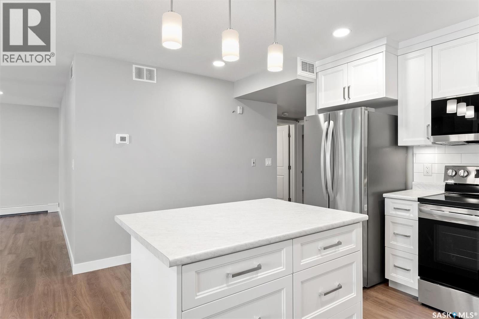 Welcome to #202 - 318 108th Street in Sutherland! This is a beauty! If you’re seeking a brand new condo in a prime location near the University of Saskatchewan and the upcoming SaskPolytech, this might be the perfect fit for you! Featuring light grey walls, barnwood-style vinyl plank flooring, and crisp white cabinets, this unit boasts a timeless color palette. This second-floor corner unit offers two spacious bedrooms, one of which includes a convenient 2pc ensuite. Upon entering the suite, you'll be greeted by a generous foyer complete with a large front entry closet. The kitchen is equipped with plenty of cabinetry, tiled back splash, under cabinet lighting, brand new stainless steel appliances, and an island featuring stylish pendant lighting. From the dining area, you can access a balcony that includes a natural gas BBQ hookup. The living area is filled with natural light, thanks to an abundance of windows facing a peaceful residential area. This home features vinyl plank flooring throughout the primary living spaces and bedrooms, while the entryway and bathrooms are finished with linoleum for easy maintenance. Call your favorite Realtor® today to take a look at this lovely condo! (29251832)