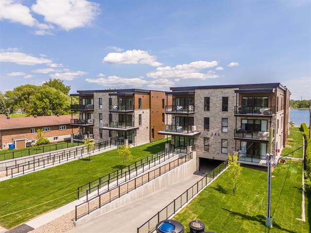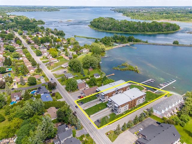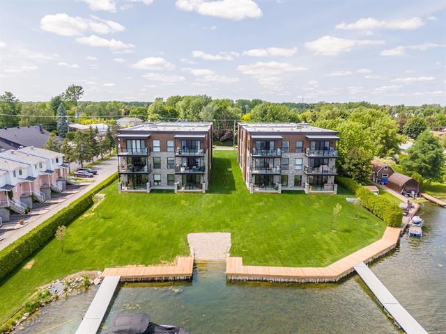 This 1,865 sq. ft. condo offers a partial view of Lake St. François. This unit features two bedrooms, two bathrooms, one of which is adjoining the master bedroom, a walk-in pantry, quartz countertops (bathrooms and kitchen), two balconies, and an open-concept space offering optimal brightness. Enjoy several amenities, including indoor parking, an elevator, and a private dock for your boats. GST/QST must be added to the asking price (45406916)