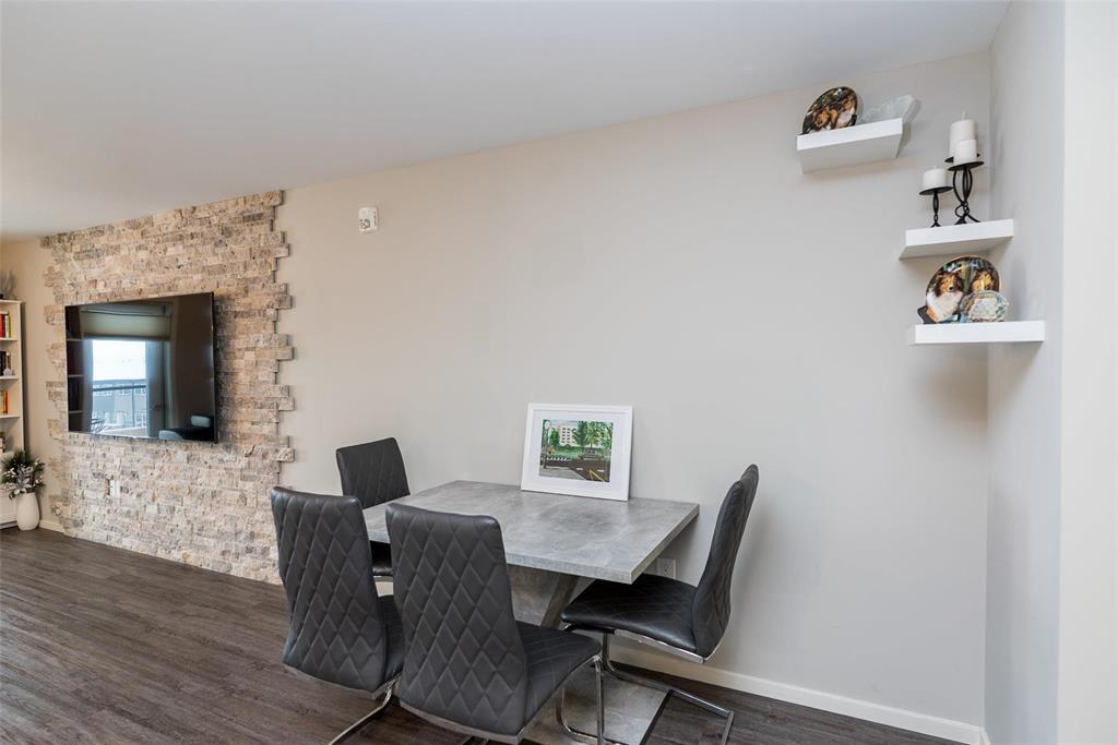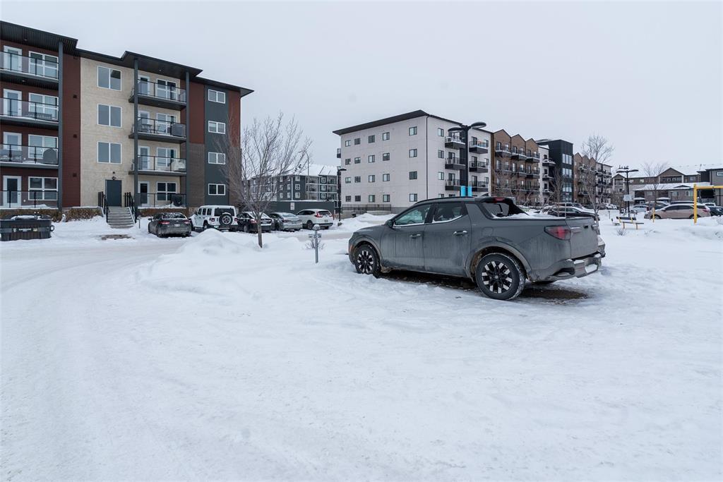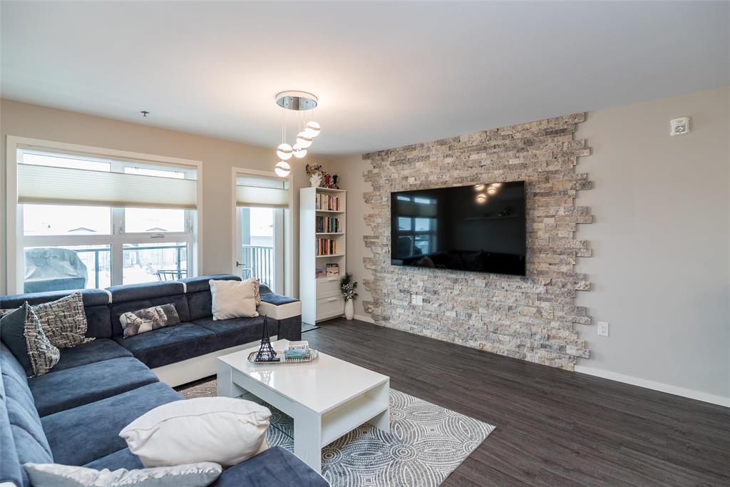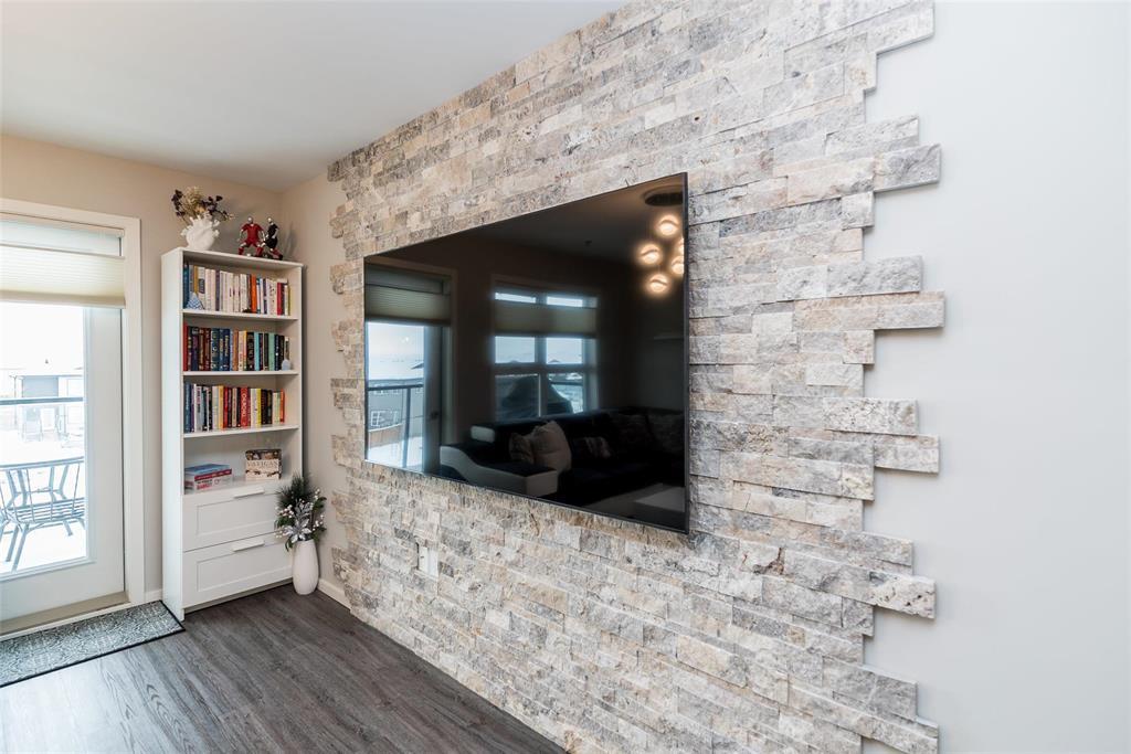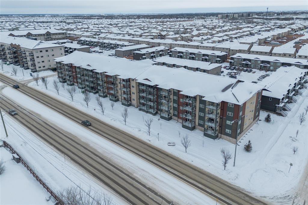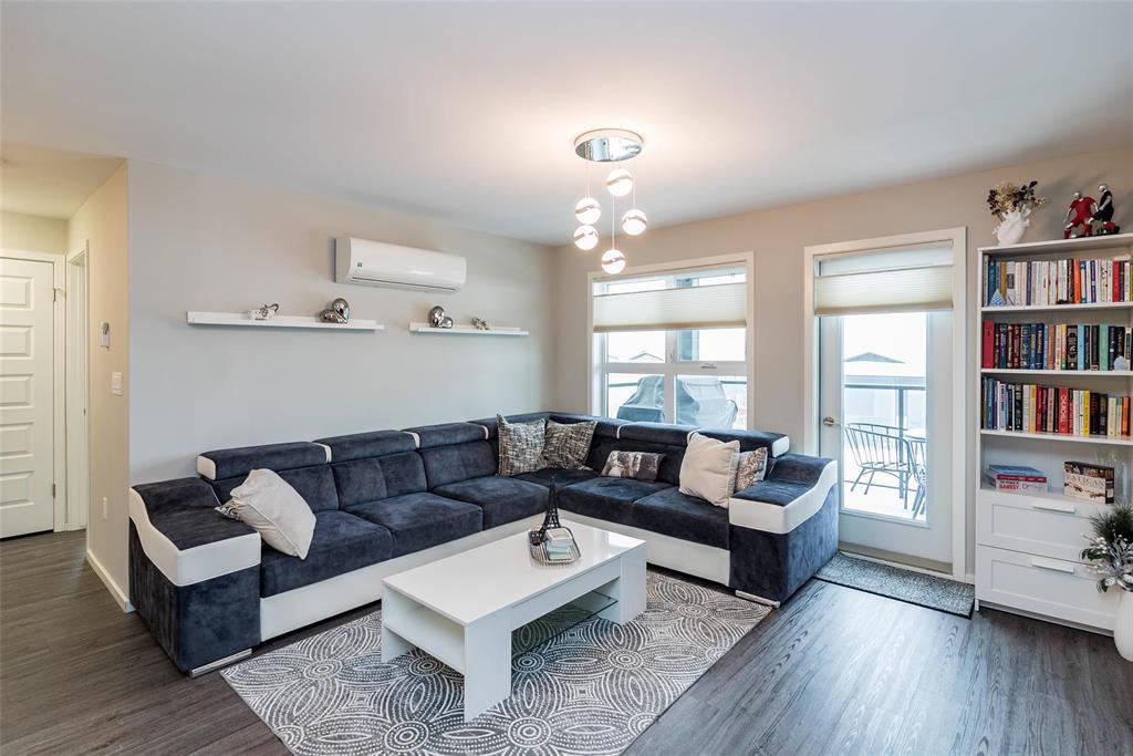 3K//Winnipeg/Offers as received. Welcome to this well-appointed 2-bedroom, 2-bathroom corner unit offering a bright and functional layout. The open-concept kitchen features white thermofoil cabinetry, white quartz countertops, an undermount sink, tiled backsplash, under-cabinet lighting, and stainless steel appliances. Luxury vinyl plank flooring runs throughout the kitchen, dining, and living areas, with carpeted bedrooms for added comfort.The living room showcases a beautiful natural stone feature wall, adding warmth and character to the space. A wall-mounted air conditioning unit ensures comfort during the summer months. Enjoy morning sun on the east-facing balcony.This unit includes two parking stalls one heated underground and one outdoor plus a storage locker. The building offers excellent amenities, including large amenity rooms and a gym.Conveniently located near Costco, KP Mall, public transit, shopping, schools, parks, a nearby dog park, and playground. Pet-friendly building. (231828741)