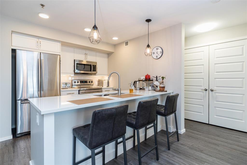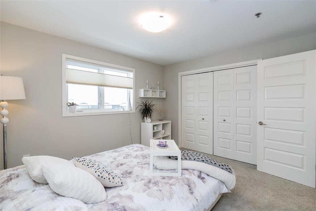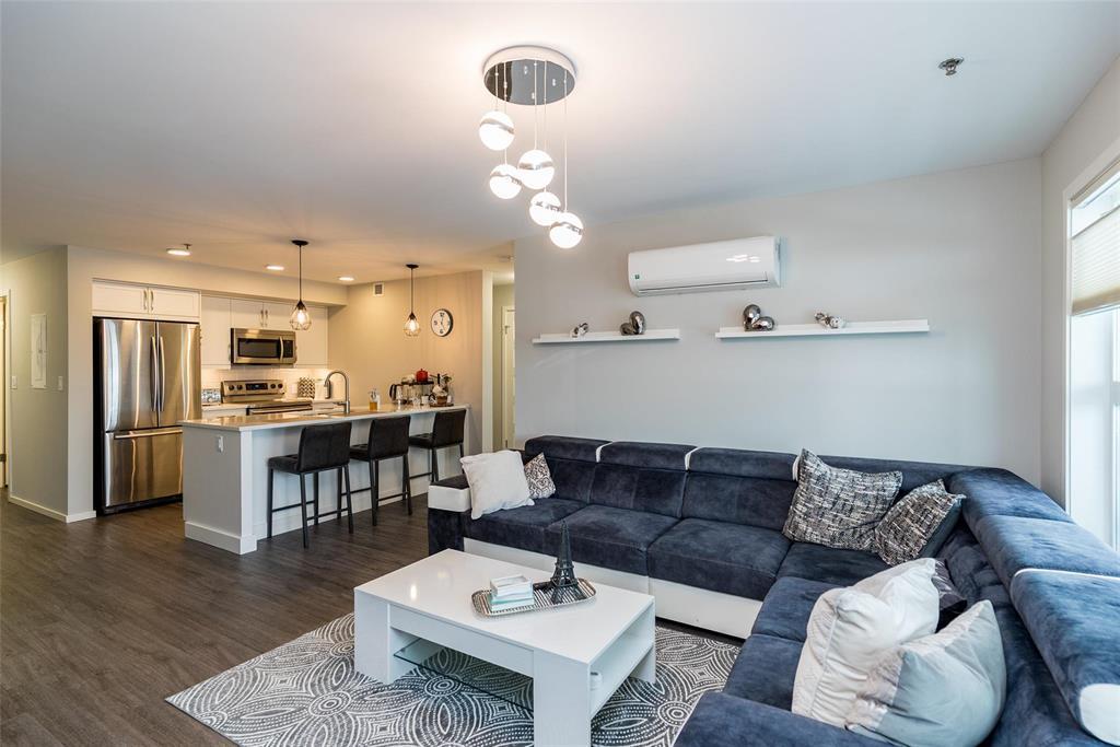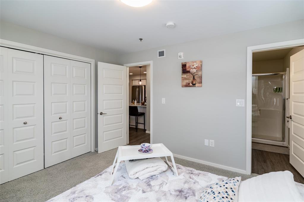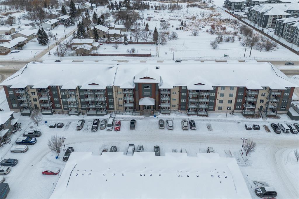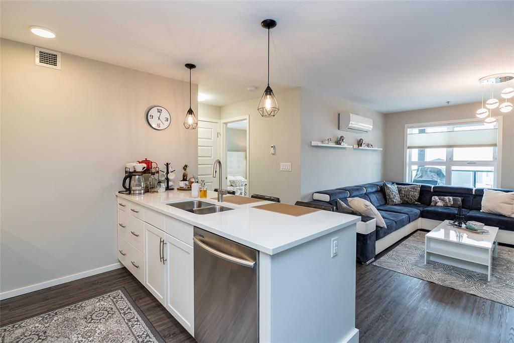 3K//Winnipeg/Offers as received. Welcome to this well-appointed 2-bedroom, 2-bathroom corner unit offering a bright and functional layout. The open-concept kitchen features white thermofoil cabinetry, white quartz countertops, an undermount sink, tiled backsplash, under-cabinet lighting, and stainless steel appliances. Luxury vinyl plank flooring runs throughout the kitchen, dining, and living areas, with carpeted bedrooms for added comfort.The living room showcases a beautiful natural stone feature wall, adding warmth and character to the space. A wall-mounted air conditioning unit ensures comfort during the summer months. Enjoy morning sun on the east-facing balcony.This unit includes two parking stalls one heated underground and one outdoor plus a storage locker. The building offers excellent amenities, including large amenity rooms and a gym.Conveniently located near Costco, KP Mall, public transit, shopping, schools, parks, a nearby dog park, and playground. Pet-friendly building. (231828741)