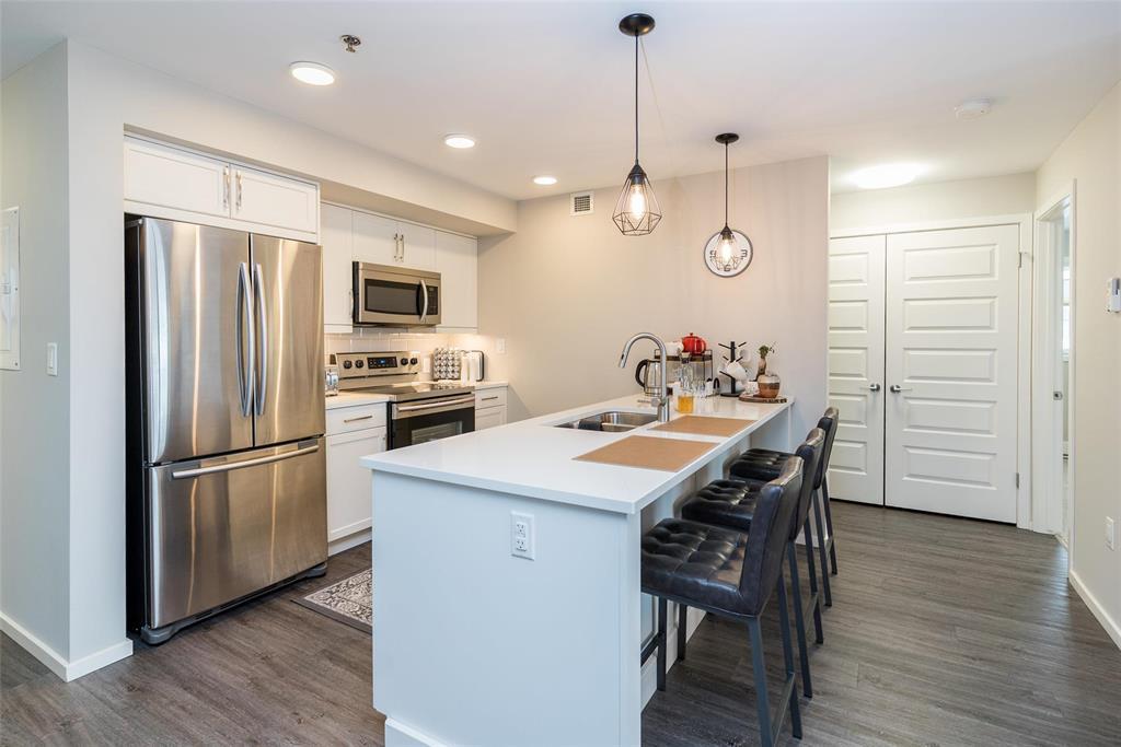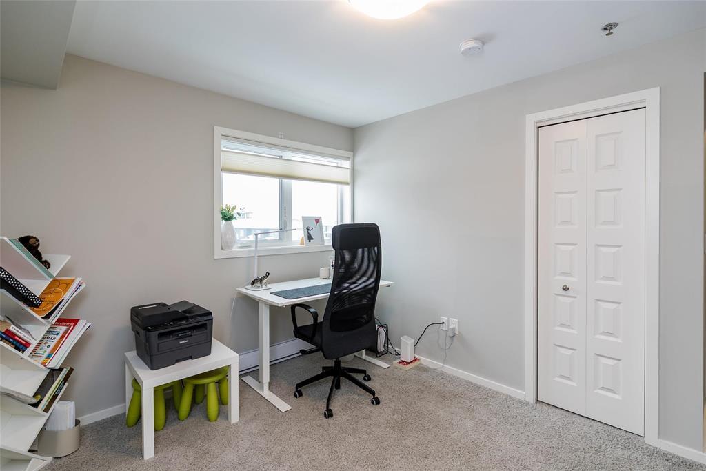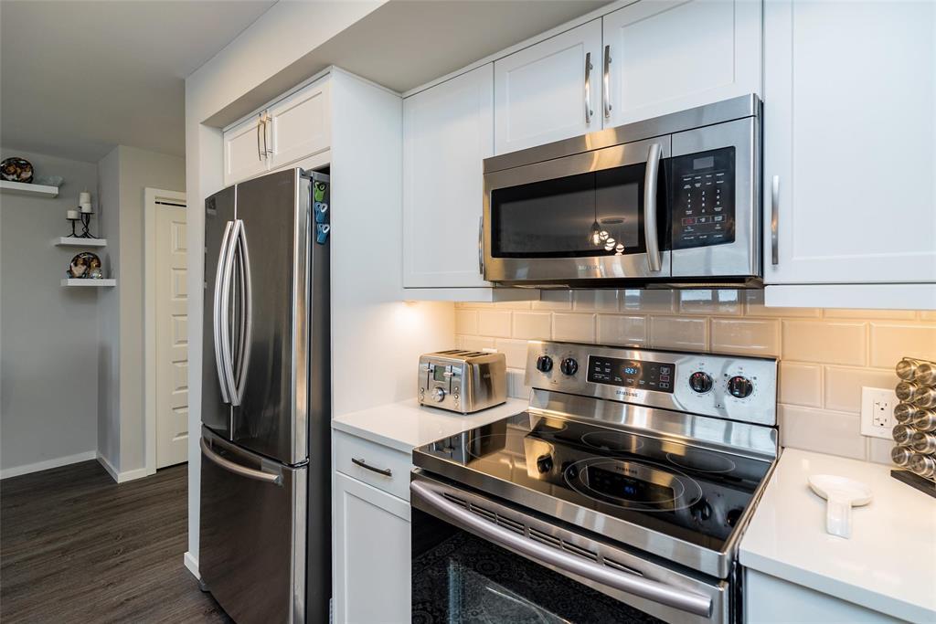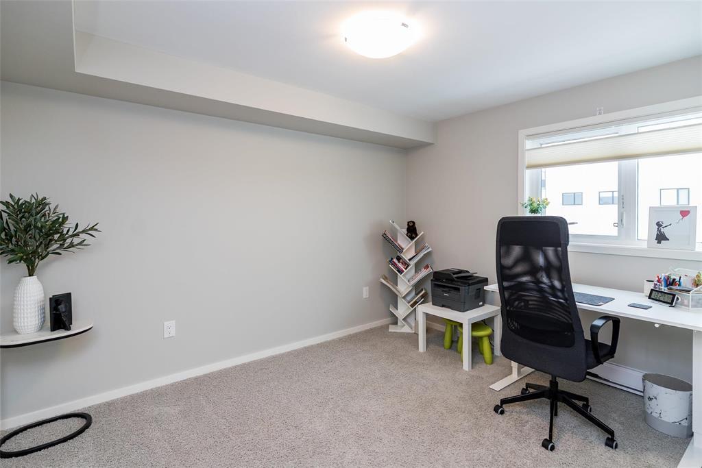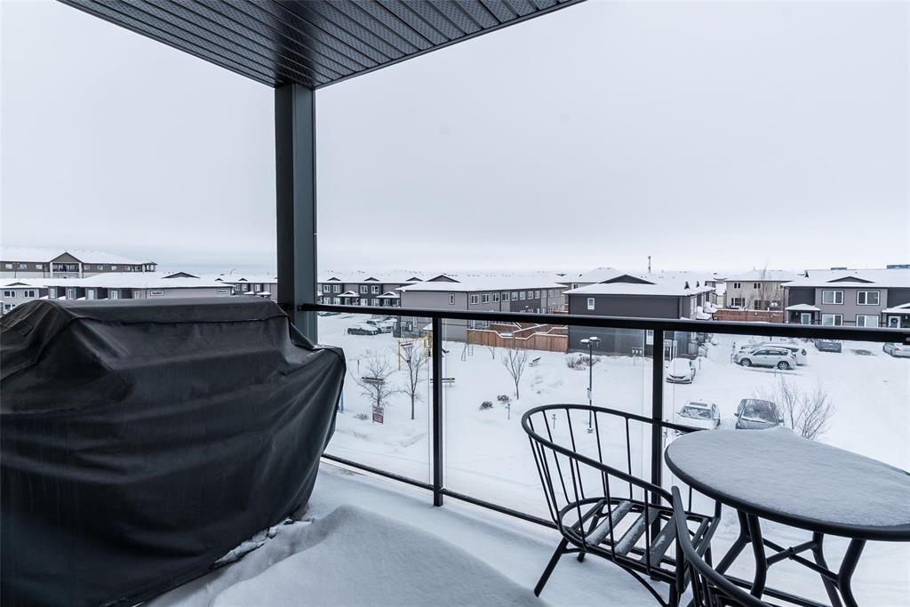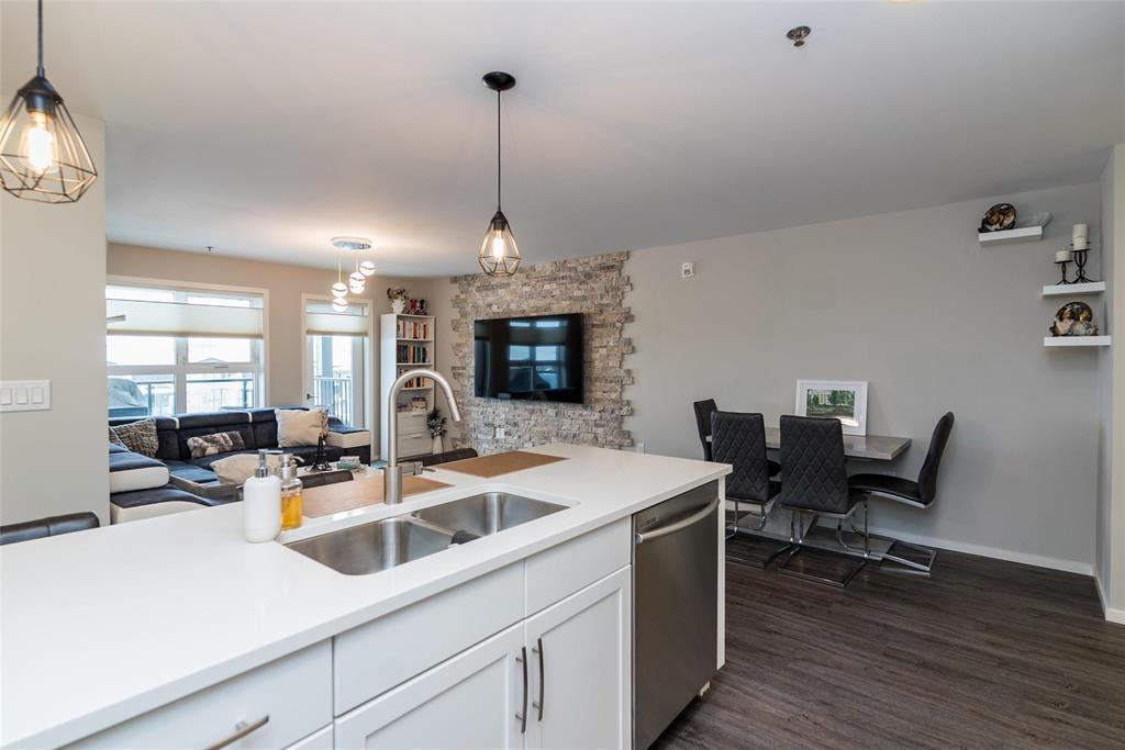 3K//Winnipeg/Offers as received. Welcome to this well-appointed 2-bedroom, 2-bathroom corner unit offering a bright and functional layout. The open-concept kitchen features white thermofoil cabinetry, white quartz countertops, an undermount sink, tiled backsplash, under-cabinet lighting, and stainless steel appliances. Luxury vinyl plank flooring runs throughout the kitchen, dining, and living areas, with carpeted bedrooms for added comfort.The living room showcases a beautiful natural stone feature wall, adding warmth and character to the space. A wall-mounted air conditioning unit ensures comfort during the summer months. Enjoy morning sun on the east-facing balcony.This unit includes two parking stalls one heated underground and one outdoor plus a storage locker. The building offers excellent amenities, including large amenity rooms and a gym.Conveniently located near Costco, KP Mall, public transit, shopping, schools, parks, a nearby dog park, and playground. Pet-friendly building. (231828741)