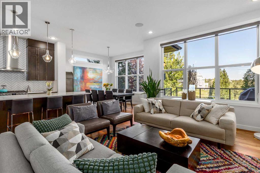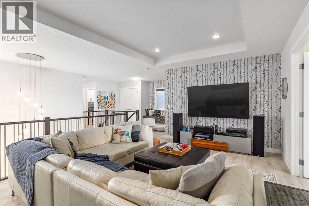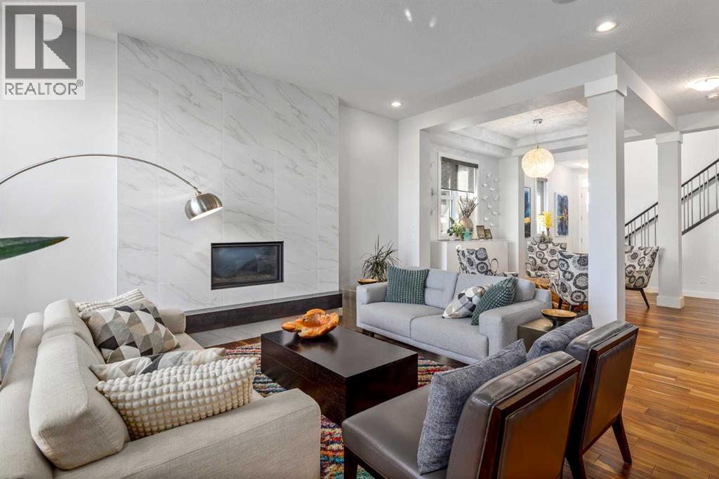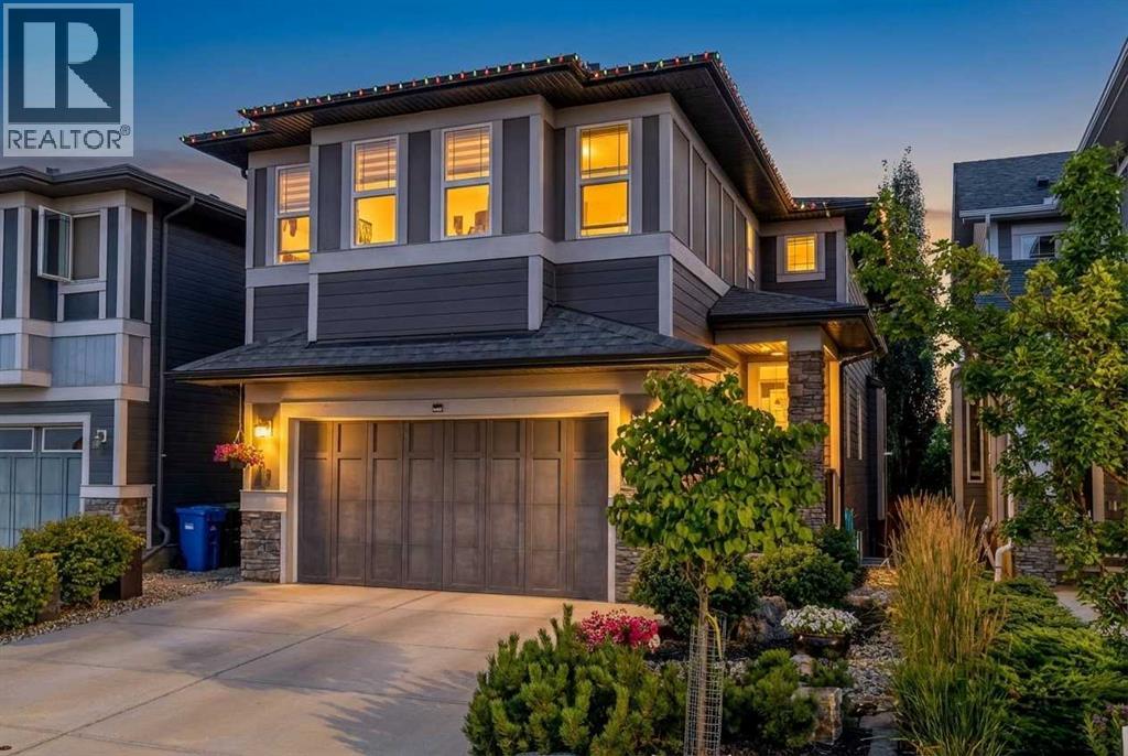 **Open House Saturday February 7th 1-4PM** From the moment you step inside, this stunning home feels like something out of a Pinterest board or a high-end interior design magazine. Every detail has been thoughtfully selected & expertly executed, making it a true showstopper that shows 10 out of 10. Located in the prestigious community of Riverstone in Cranston, this 2,500 sq ft two-storey home offers an unbeatable lifestyle—BACKING DIRECTLY onto a tranquil NATURAL RESERVE & fronting onto a kid-friendly playground. It’s the ideal combination of luxury, functionality, & location. Inside, you’re greeted by 10' ceilings, acacia hardwood floors, & a layout that flows effortlessly. The front dining room features a double tray ceiling & a striking designer light fixture, while the expansive rear living room is anchored by a gas fireplace wrapped in marble-style tile with a lower hearth. Large windows along the back wall frame serene views of the green space beyond, bringing the outdoors in. The chef’s kitchen is a showpiece—featuring full-height dark-stained cabinetry with bar pulls, white quartz counters, upgraded appliances, & a stunning herringbone tile backsplash that extends to the ceiling around the hood fan. A cabinet-style pantry wraps into a coffee bar nook for added function & flair. The back mudroom connects seamlessly to the oversized garage & includes locker-style built-ins. A beautifully wallpapered 2-piece powder room adds a touch of charm. Upstairs, the large bonus room is wrapped in modern railing & showcases a birch forest wallpaper feature wall, built-in ceiling speakers, & laminate floors that continue throughout the upper level (carpet only on the stairs). A convenient built-in desk area outside the kids’ bedrooms creates a perfect zone for homework or study sessions, while a built-in bench at the top of the stairs offers a cozy reading nook. All three bedrooms include custom California Closet-style built-ins for thoughtful storage. The primary suite o verlooks the peaceful reserve & features a spa-like ensuite with a large soaker tub framed by a picture window, a massive glass shower, dual sinks with a dedicated vanity space, & a barn-style door leading to the generous walk-in closet. The professionally finished basement, completed by the builder, extends the living space with durable laminate floors, a spacious rec room, a bright fourth bedroom with a wallpaper feature wall, a 4-piece bathroom, & a sleek wet bar complete with sink & mini fridge—ideal for entertaining or relaxing movie nights. Step outside to discover your private oasis. The beautifully landscaped backyard is designed for both comfort & calm, with mature trees providing privacy & a two-tiered deck perfect for hosting or unwinding. A cozy hot tub area invites you to relax year-round, while thoughtful details like under-deck storage and low-maintenance landscaping enhance the functionality. (31506559)