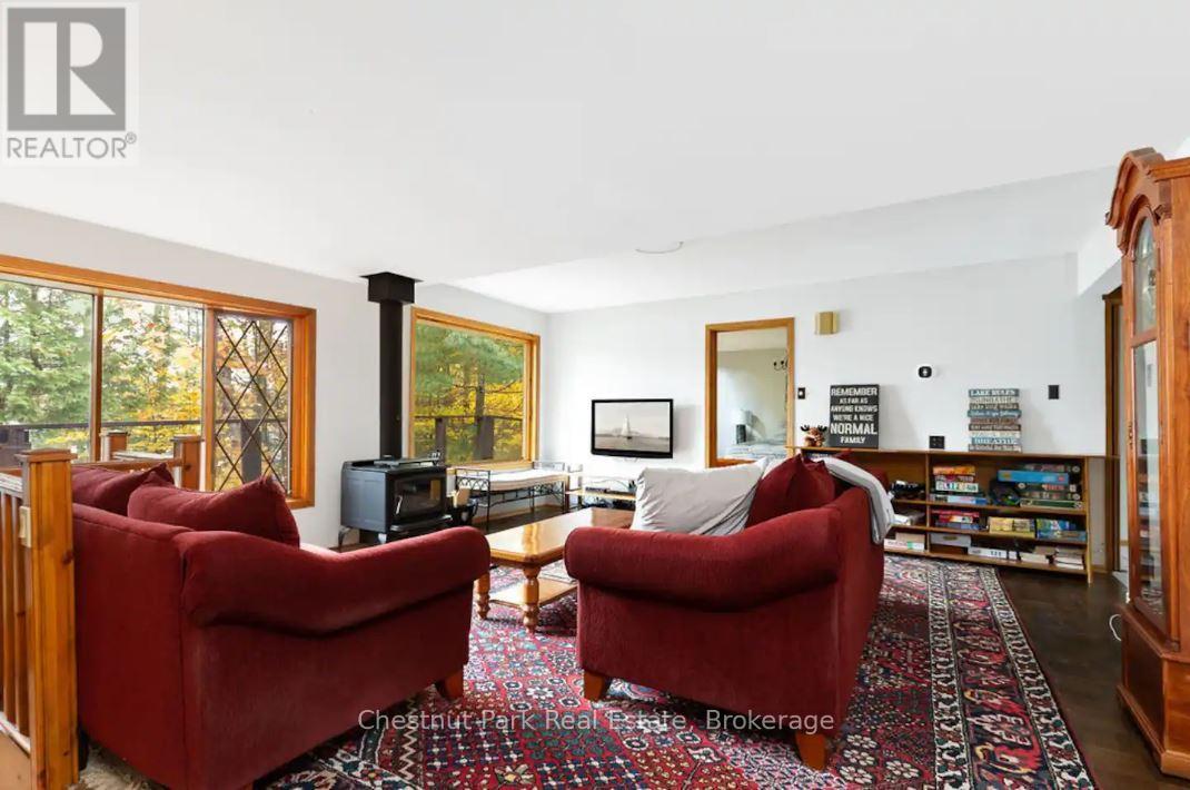 LAKE MENOMINEE - HIGHLY SOUGHT-AFTER & YEAR-ROUND! Less than 2.5 hours from the GTA, this exceptional four-bedroom, fully winterized lakehouse on beautiful Lake Menominee offers the perfect blend of privacy, comfort, and convenience. With over 3,300 sq. ft. of living space, this south-facing retreat enjoys all-day sun and serene views of untouched crown land across the lake.Inside, a spacious layout features multiple walkouts to the water from the kitchen, primary suite, and lower level. Thoughtfully designed for year-round living and entertaining, the home includes a sauna, screened-in gazebo, and cozy entertainment area.Outdoors, enjoy a gentle, hard-packed sand entry, dry boathouse on the shore, two storage sheds, stacked cords of wood, and an insulated double garage. Rarely available on this lake-there's no public boat launch, meaning you can launch directly from your own property. Located on a municipally maintained year-round road, just 15 minutes to downtown Huntsville, Hidden Valley Highlands Ski Area, and 20 minutes to Arrowhead Park, this property offers the best of Muskoka living with the convenience of modern amenities, including upgraded smart-home features, high-speed internet, and abundant storage.This Lake Menominee gem is ready for your family to move in and start making memories! (41906131)
