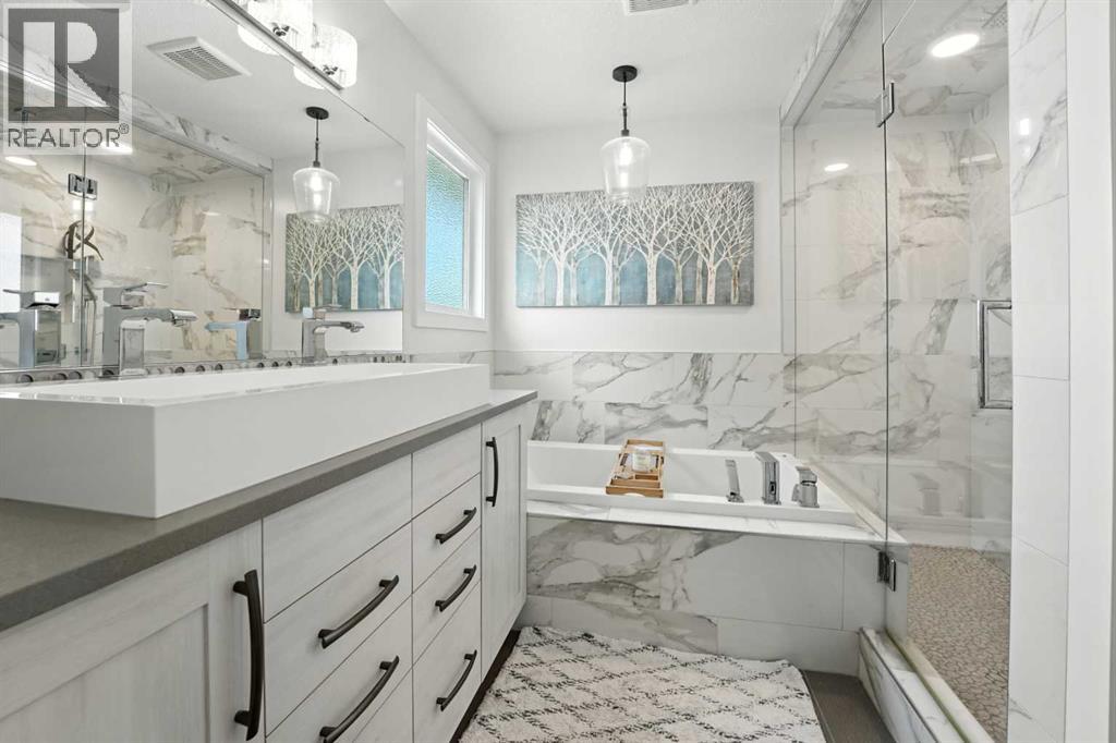 A completely renovated 2-storey on a close in the desirable mature Westpark Estates neighborhood. The front entryway greets you to the living room, which is flooded with natural light through the large front vinyl window. Two-toned kitchen cabinets are complemented by a large eating bar island, leathered granite counters, full tile brick backsplash, a gas stove, a Silgranite sink, stainless steel appliances, pot/pan drawers, a corner pantry, a garburator & pull-out cabinets including a spice drawer. The dining area has patio doors with built-in blinds to the back deck. Relax in the sunken living room that features a gas fireplace with a white brick surround. The home boasts a main floor laundry. Upstairs has a king-sized primary bedroom with a large walk-in closet complete with custom shelving/drawers, a makeup area & a 5-piece bathroom with a double faucet sink, a window, a tiled jet tub, a separate glass/Italian marble steam shower & a water closet. There is a second bedroom upstairs & a 4-piece tiled bathroom with quartz countertops. Follow the wrought iron railing stairs down to the basement that has 3 bedrooms (2 with walk-in closets), a 5-piece bathroom with double sinks, a makeup vanity, and quartz countertops. The large pie-shaped lot features a 2-tier deck with a hot tub, & rv parking. Front and back underground irrigation. The home was completely renovated in 2019, including but not limited to: a new exterior, windows, the interior was brought back to the studs with all new finishings/fixtures, a new furnace, hot water on demand. The best of both worlds with the trendy newer renovations in a mature location just steps away from the trail system and Red Deer river! The home has AC, an HRV system and a heated garage. (31507907)