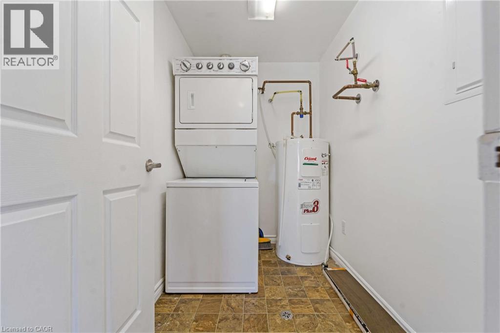 Laundry room featuring stacked washer / drying machine, water heater, and stone finish floors