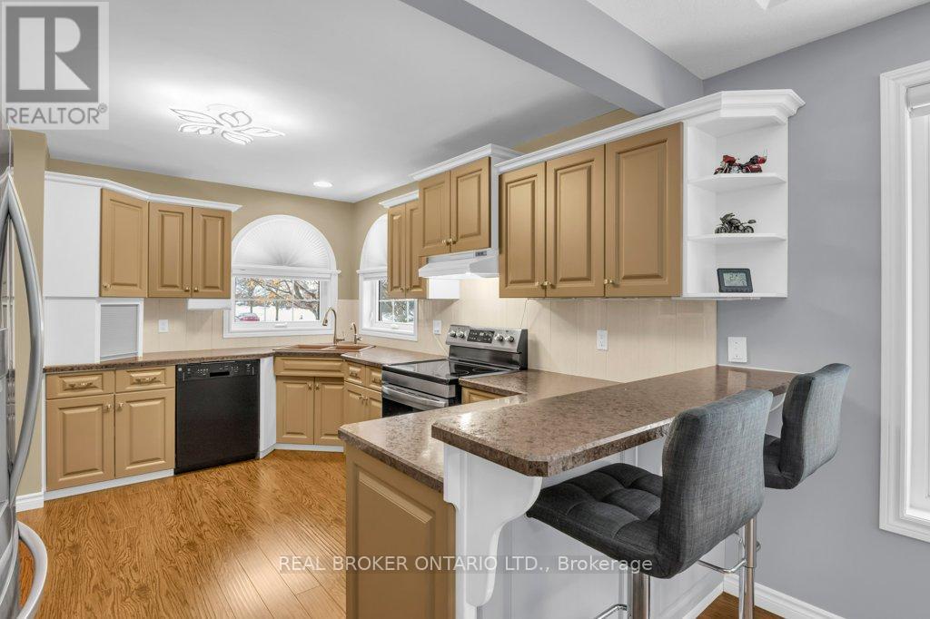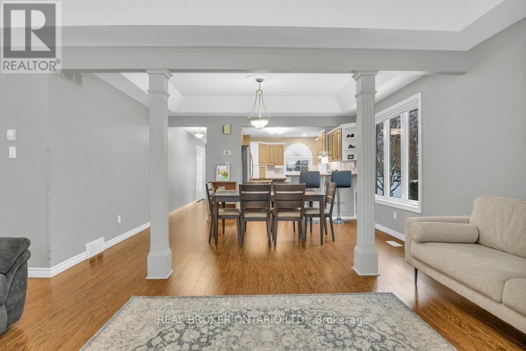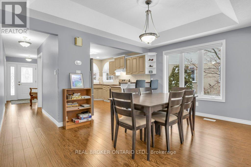 A stunning residence nestled in the highly sought-after, quiet community of South Parkwood Estates in Elmira. This 4-bedroom, 2.5-bathroom home offers the perfect blend of small-town tranquility and modern convenience, with easy access to the charming village of St. Jacobs and the bustling Kitchener-Waterloo area. As you step inside, you are greeted by a sizable foyer that sets an inviting tone. The main level features a desirable open-concept layout, anchored by a warm gas fireplace-the perfect focal point for hosting guests or enjoying quiet evenings. The spacious kitchen is a chef's delight, boasting ample counter and cabinet space. For ultimate accessibility, the primary bedroom is located on the main floor, featuring a large walk-in closet, alongside a dedicated main floor laundry room. The fully finished basement expands your living space significantly. Here, you will find three additional sizeable bedrooms, ideal for a growing family or a home office. The cozy rec room, complete with a woodstove, provides a rustic retreat for chilly Ontario winters. A standout feature is the walk-up access from the basement directly to the oversized 2-car garage, offering incredible functionality and potential for a secondary entrance. Step outside into a backyard that is truly a rare find. Professionally landscaped gardens surround a peaceful waterfall feature, creating a serene atmosphere. Backing onto a lush woodlot with no rear neighbors, you can enjoy ultimate privacy on the large deck or under the gazebo. The exterior is completed by a resurfaced driveway with plenty of parking for family and friends. Experience the best of Elmira living in this beautifully maintained and thoughtfully designed property. (41906998)