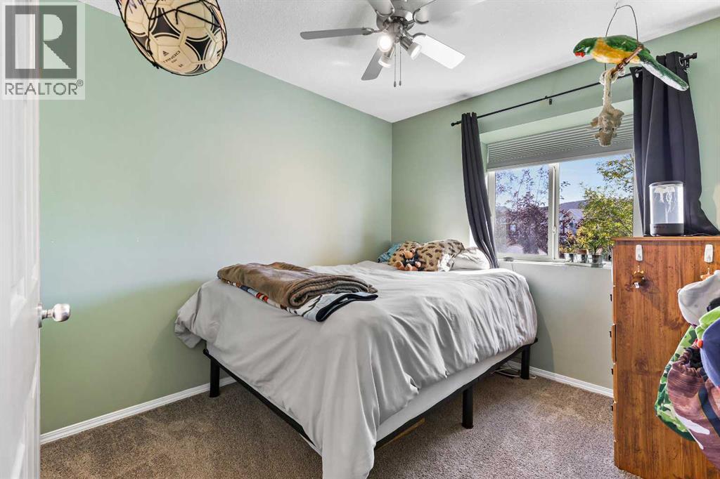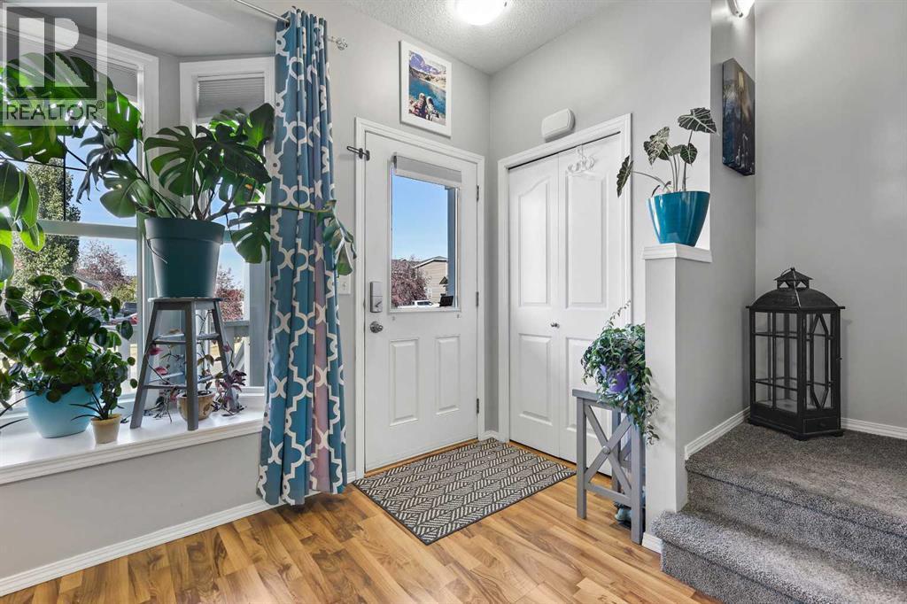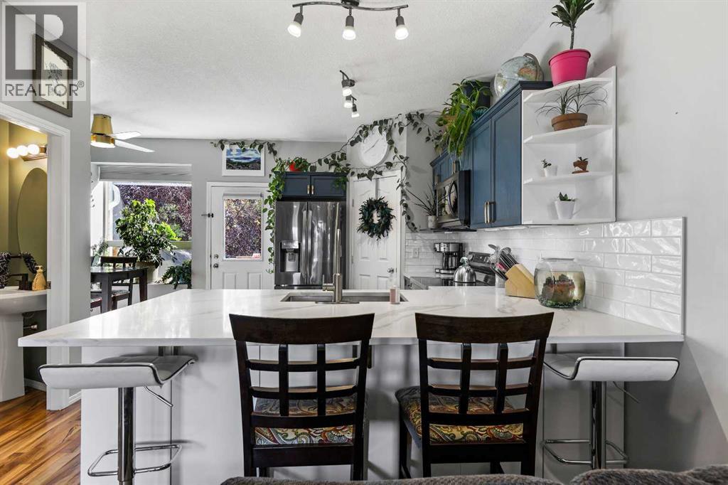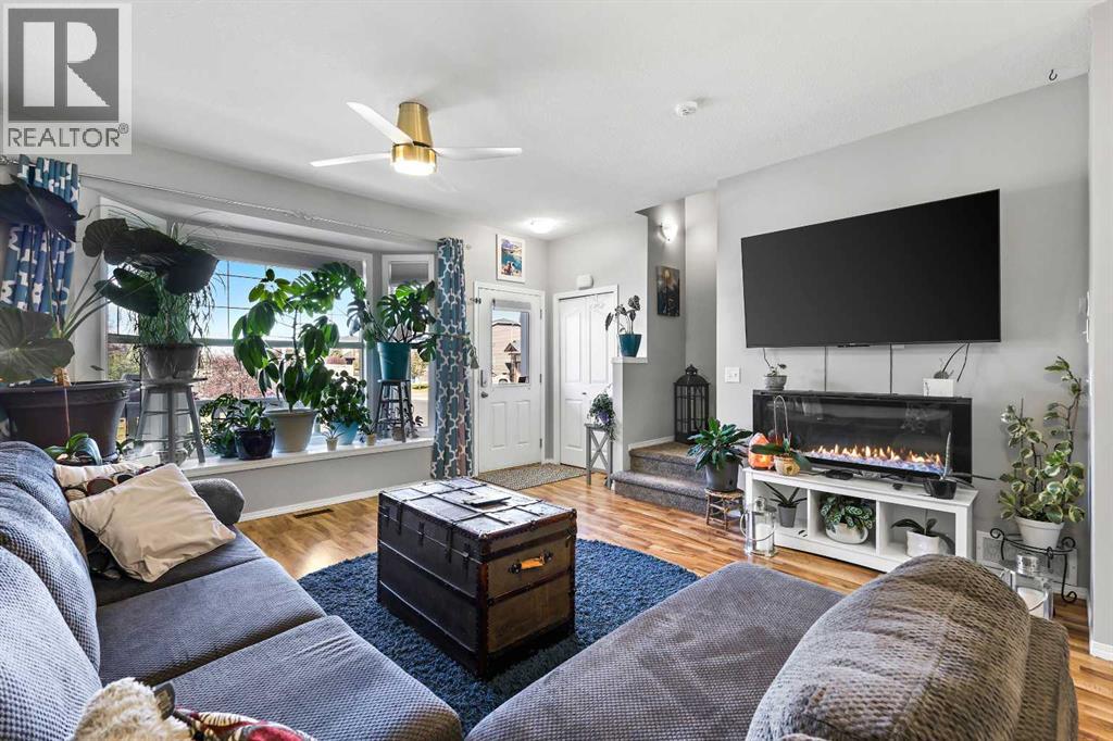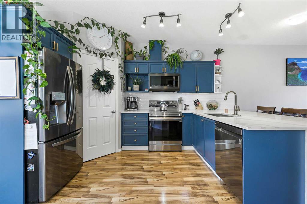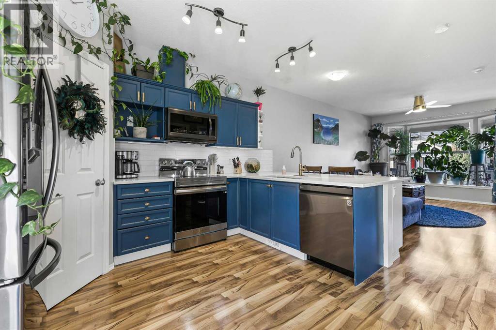 Step into stylish comfort in this beautifully maintained 3-bedroom, 2.5-bath 2-storey townhome located in the heart of family-friendly Luxstone. Boasting over 1,700 sqft of total thoughtfully designed living space with a fully finished basement, this home is the perfect fit for first-time buyers, growing families, downsizers, or savvy investors.The bright and inviting main floor features soaring 9’ ceilings, a large bay window that fills the living room with natural light, modern ceiling fans in both the living and dining areas, and rich laminate floors. The dining space opens to a sun-filled south-facing backyard with your very own private deck backing onto green space and pergola—perfect for summer barbecues or peaceful morning coffees.The refreshed kitchen is a true showstopper with striking navy blue cabinets accented by gold hardware, a sleek white tile backsplash, under-cabinet lighting, and designer granite countertops. A corner pantry, stainless steel appliances, USB-integrated outlets, and a flush eat-up island with added storage make this a modern kitchen ready for everyday function or entertaining.Upstairs, discover three generously sized bedrooms (each equipped with their own ceiling fan), the serene primary suite offers a large walk-in closet and a convenient cheater 4-pc ensuite. The finished basement provides a massive rec room, a full bathroom, separate storage room, and laundry tucked out of the way—ideal for play space, movie nights, or a home gym.Enjoy the two assigned parking stalls, with bonus street parking right in front of the townhome, and a fantastic location just steps from schools, parks, playgrounds, pathways, and everyday amenities. Peace of mind with a BRAND NEW WATER HEATER December 2025!This is your chance to own a move-in ready Airdrie townhome with charm, updates, and unbeatable value! (31508043)