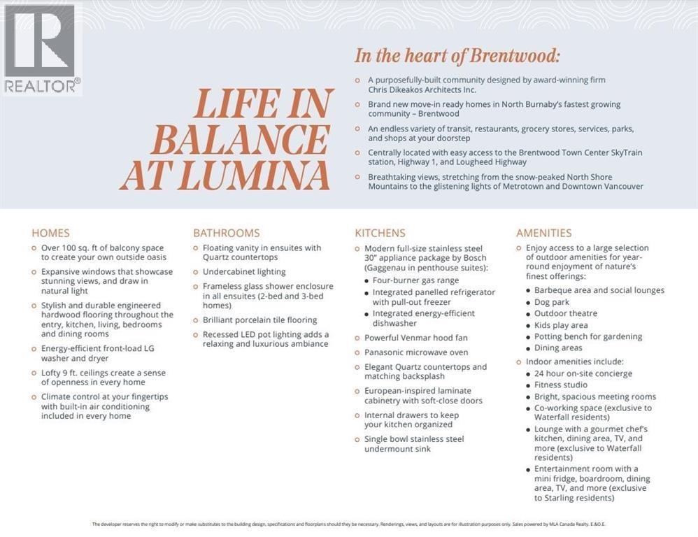 NW corner unit at Lumina Waterfall in the heart of Brentwood. This spacious 2 bed, 2 bath home offers an open layout with great natural light, NW exposure, mountain views, high ceilings, and an oversized balcony. Features include a gourmet kitchen with Bosch stainless steel appliances and air conditioning for year-round comfort. Exceptional amenities include a fitness centre, yoga, games and music rooms, outdoor social space, dog run, guest suites, and 24/7 concierge. 1 parking & 1 locker included. Steps to Brentwood SkyTrain, shopping mall, restaurants, groceries, and daily conveniences. Pet & rental friendly. Very motivated seller-bring your offer! (32307621)