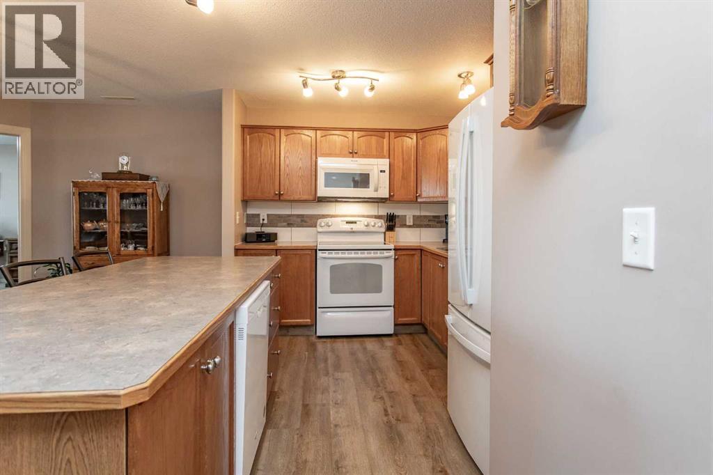 Chateau Lacombe offers an exceptional opportunity to own a condominium in one of Lacombe's premier adult living developments. Conveniently located within walking distance to downtown amenities, shopping, and walking trails, this centrally situated project provides both comfort and accessibility. This well-maintained second-floor unit features west-facing windows with attractive views of the surrounding residential neighborhood. Recent updates, including new flooring, backsplash, blinds, one year old refrigerator & microwave range hood , contribute to its modern appeal and present the unit at a high standard.Upon entering the building, residents and guests are greeted by thoughtful architectural details such as a spiral staircase and a consistently clean common area. Access to the second floor is available via elevator or stairs. The condo's open-concept layout offers abundant natural light and generous living space. The kitchen is equipped with a large island, ample cabinetry, and considerable countertop space. There is sufficient room for a dining table and china cabinet. The living area includes multiple windows and a garden door leading to a private deck.Accommodations include a spacious primary bedroom with a walk-through closet and three-piece ensuite, a second bedroom, a four-piece bathroom, and a combined laundry/storage room. The property also includes a titled underground parking stall and an assigned storage unit. Additional visitor parking is available on site. Residents have access to a shared party room, suitable for gatherings and social activities. The community promotes a maintenance-free lifestyle, eliminating the need for snow removal in the winter and yard work in the summer, and offers a welcoming environment near local amenities. (31509139)