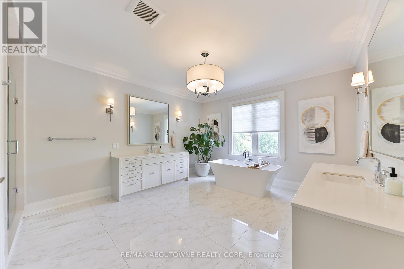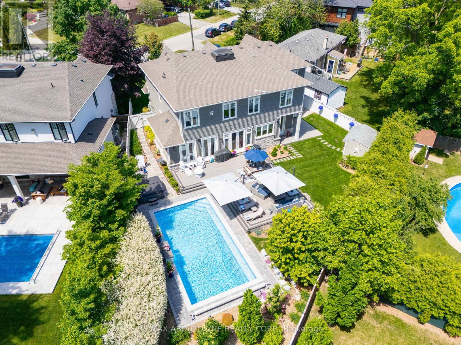 This custom-built residence combines timeless architecture, magazine-worthy interiors, and a resort-style backyard with over 6,100 sq. ft. of finished living space. Set on one of the largest pie-shaped lots in the neighbourhood (over 45% larger than average) and just 3km to Appleby College, it offers a rare sense of scale and privacy. Southwest-facing gardens showcase a heated saltwater pool, tiered lounging areas, ambient lighting, and mature hedging. Inside, 10' ceilings, wide-plank hardwood, and bespoke millwork create quiet sophistication. The open-concept kitchen and family room with gas fireplace and French doors connect seamlessly to the gardens. A formal living room, elegant dining area, and private office complete the main floor. Upstairs, the primary suite rivals a luxury hotel with spa-inspired ensuite and dressing room, complemented by 3 bedrooms and laundry. The finished lower level adds a rec room with wet bar, gym, sauna, bedroom, and bathroom, ideal for teens, guests, or multigenerational families. (41914019)