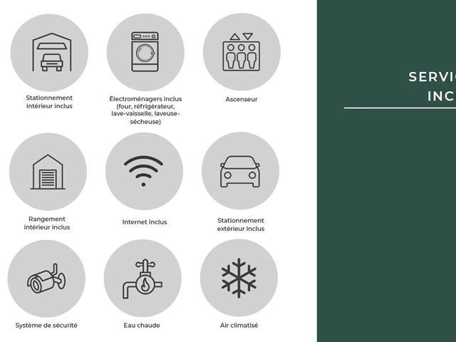Stationnement et rangement Les stationnements et le rangement varient selon l'unité choisie : Stationnement intérieur Stationnement extérieur Rangement intérieur. Inclusions 5 électroménagers Internet Eau chaude Ascenseur Thermopompe (46119844)