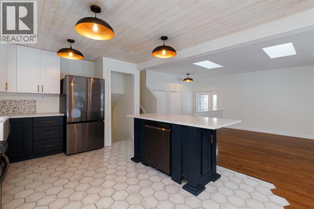Open House Sunday January 18 12:00-2:00 - Welcome to this stunningly transformed 4-level split in the heart of Queensland, where mid-century charm meets contemporary luxury. No expense was spared in this top-to-bottom renovation, offering 1,738 square feet of finished living space. The main floor is a showstopper, featuring an open concept layout with gorgeous hardwood flooring and a custom kitchen. The culinary space boasts sleek navy and white cabinetry, a large central island, quartz countertops, a classic farmhouse sink, and a unique hexagonal tile transition that seamlessly blends the kitchen and dining areas. Large windows and dual skylights flood the space with natural light, highlighting the modern wood plank ceiling and industrial-chic lighting. Relax in the expansive living room, anchored by a sleek, minimalist fireplace with a slate hearth. Retreat to the upper level where you will find three generously sized bedrooms, including the primary with two piece ensuite. The lower level provides even more versatility with a massive recreation room—perfect for a home theatre or play area—along with a fourth bedroom and a second full bathroom, making it an ideal space for guests or teenagers. The basement level houses the laundry and a large open space ensuring you’ll never be short of storage. A separate entrance walks up to the large private yard with mature trees and plenty of space to roam. An oversized double detached garage and parking space for your RV complete this property. This home is ideally located and is just minutes from schools, shopping, the ridge at Fish Creek Park, and an off leash dog park. Don’t miss your chance to own one of the most uniquely renovated homes in this established, quiet community! (31516148)