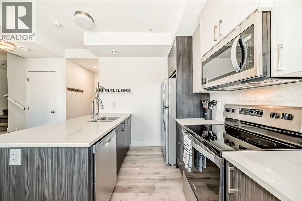 Like new 2 brdroom end unit townhouse backing onto wooded natural ravine and walking path. Really low condo fees ($149). This bright/open, pet-friendly, one level condo features a contemporary style, an abundance of natural light, large balcony, 9' ceilings, quartz counters, and breakfast bar. Plenty of storage room. Location is ideal: walking distance to stores and restaraunts and parks and playgrounds. Presigious community. Titled parking stall and visitor parking right outside your door. Well worth viewing - especially in the light of day! 35 Spring Creek Common SW. (31517217)