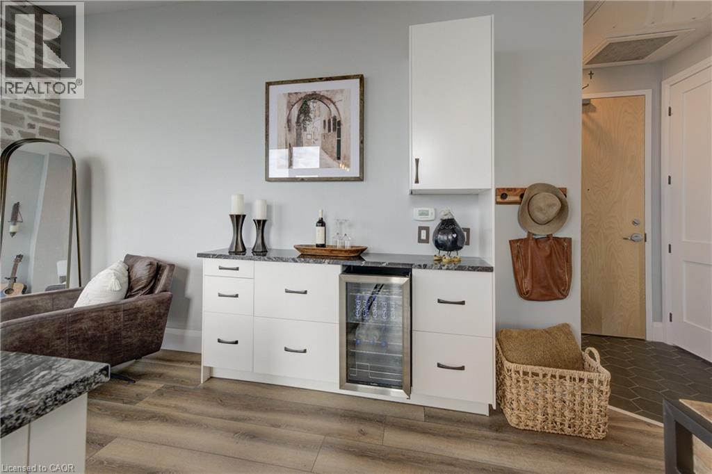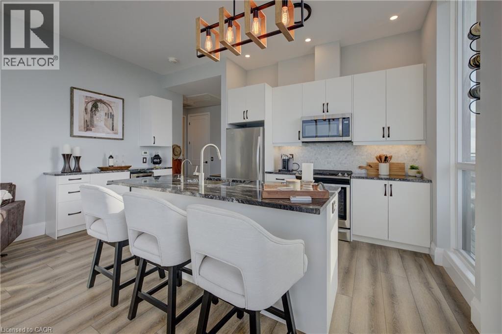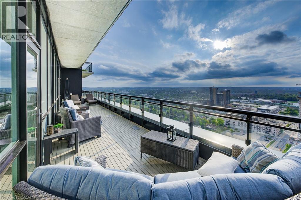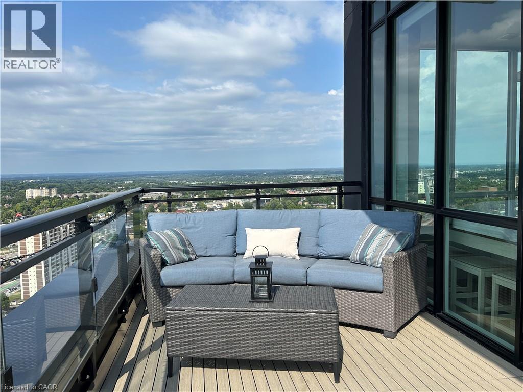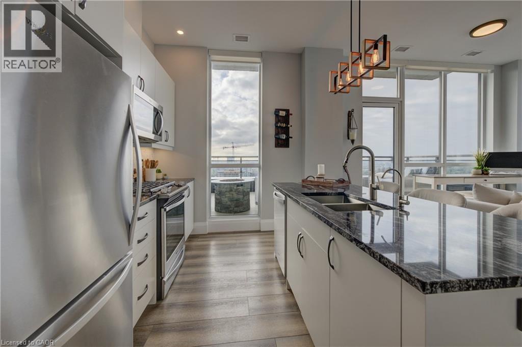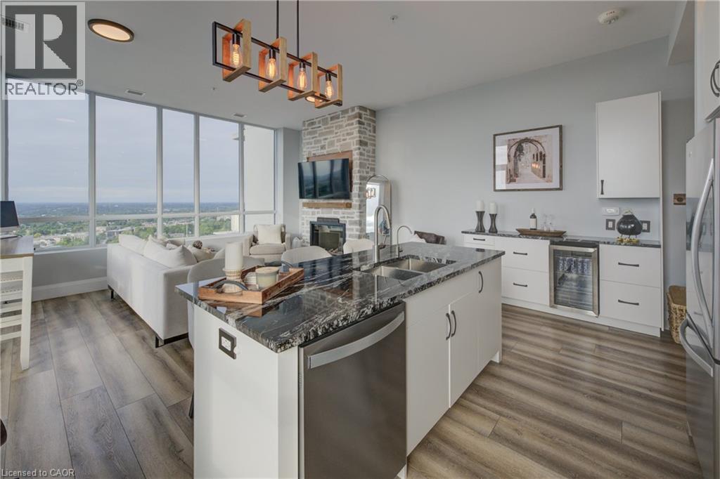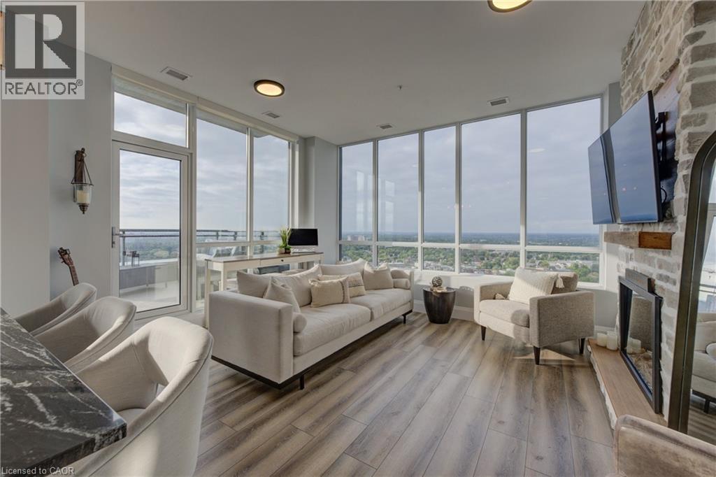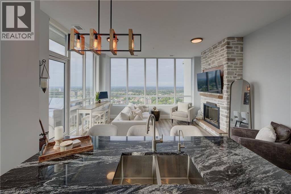 Penthouse living, done right. Welcome to a truly rare offering at Charlie West, part of the exclusive Scott McGillivray Collection. Perched high on the 29th floor, this one-of-a-kind penthouse delivers the space, finishes, and views you simply can’t replicate anywhere else in downtown Kitchener. Soaring 10-foot ceilings and floor-to-ceiling windows flood the home with natural light and frame sweeping panoramic views of the KW skyline. Step outside to your private 400 sq. ft. terrace—a true extension of the living space—perfect for sunset dinners, entertaining friends, or simply enjoying the quiet that only comes with being above it all. Inside, the finishes are crisp, modern, and thoughtfully curated: luxury vinyl tile flooring, premium hardware, electronic blinds with remotes, custom built-in closets, and a striking stone fireplace that anchors the living space. The chef’s kitchen is built for people who actually cook—granite countertops with extended prep space, a generous island with seating for three, gas stove, stainless steel appliances, wine fridge, under-cabinet lighting, and a timeless hex marble backsplash. Walk Score 99 Transit Score 66 Biker's Score 94 The primary suite offers a direct walkout to the terrace, a spa-inspired 3-piece ensuite, and ample closet space. A separate 4-piece bath provides comfort and privacy for guests. Residents enjoy full-service amenities including concierge with evening and weekend security, fitness centre and yoga studio, social lounges with catering kitchen, landscaped terrace with Broil King BBQs, guest suite, pet run and wash area, EV charging stations, and secure car and bike parking. All of this, just steps to the ION LRT, Victoria Park, City Hall, Google HQ, and downtown Kitchener’s best restaurants, cafés, and shops. This isn’t just a condo. It’s a statement. Luxury. Location. Lifestyle. Book your private showing today. (70036976)