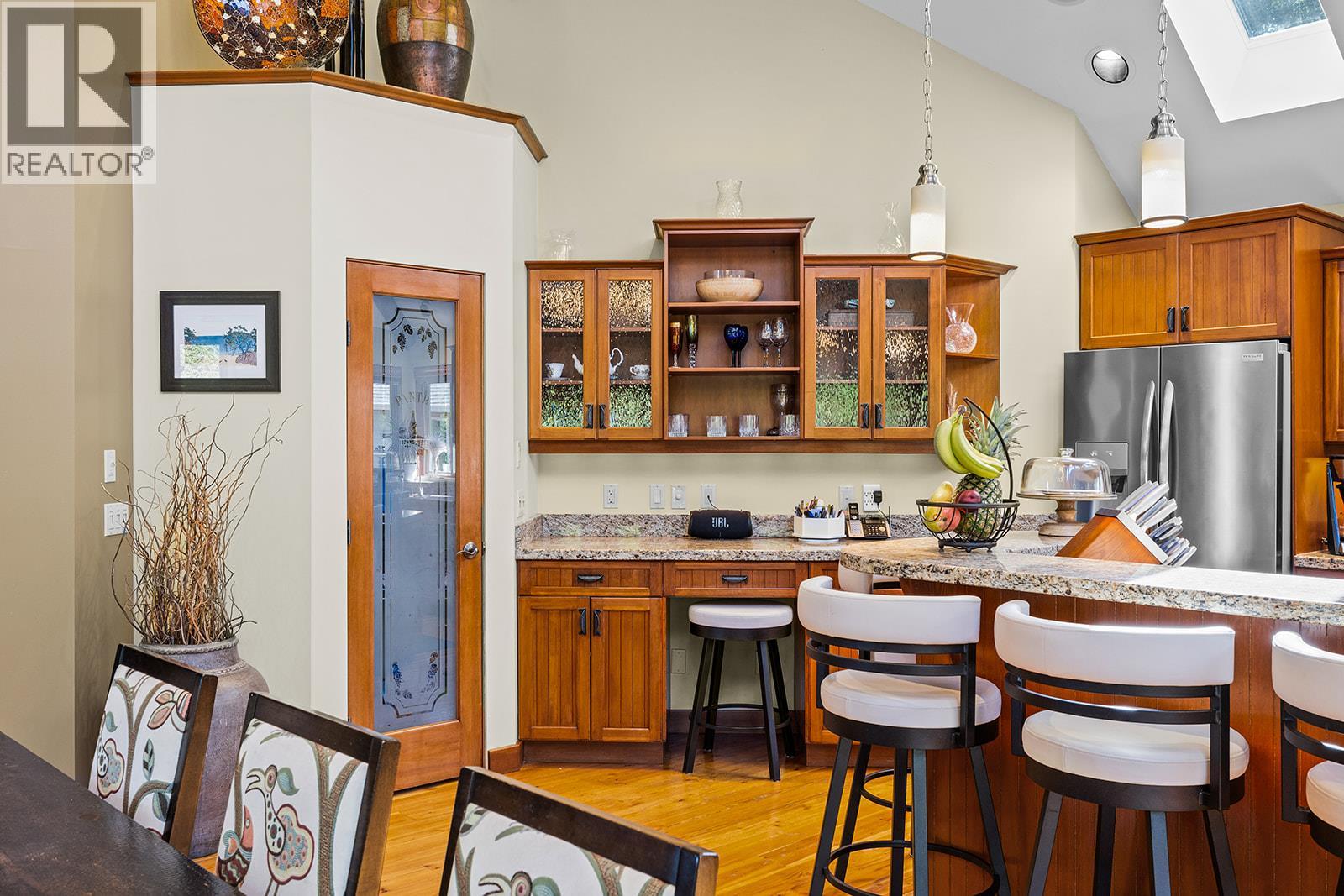 Experience true Okanagan living in Crawford Estates with your own private pool paradise. Featuring brand NEW roofs on both the main home and detached garage, this 6-bedroom, 6-bathroom home seamlessly blends timeless craftsmanship with modern comfort on a private, beautifully landscaped 0.4-acre lot. The striking exterior showcases timber and stone accents with dramatic rooflines that set the tone for the elegance within. Step inside to soaring vaulted ceilings, oversized windows, and a bright, open-concept design that fills the home with natural light. The chef-inspired granite kitchen features built-in appliances, a massive island, and abundant storage perfect for everyday living and entertaining. The spa-like primary suite offers a jetted tub, luxurious finishes, and tranquil views of the surrounding landscape. The walkout basement is an entertainer’s dream, complete with a custom bar, media lounge, and direct access to your private backyard oasis featuring a heated saltwater pool, hot tub, rock waterfall, and lush gardens. A detached, heated two-level garage/workshop adds versatility with its own bathroom, sauna, and wine cellar, ideal for hobbies, guests, or additional living space. With four covered parking spots, RV space, and ample room for family and visitors, this home perfectly balances function and sophistication. Nestled in one of Kelowna’s most desirable neighborhoods, Crawford Estates is known for its proximity to parks, trails, and top-rated schools. (39612733)