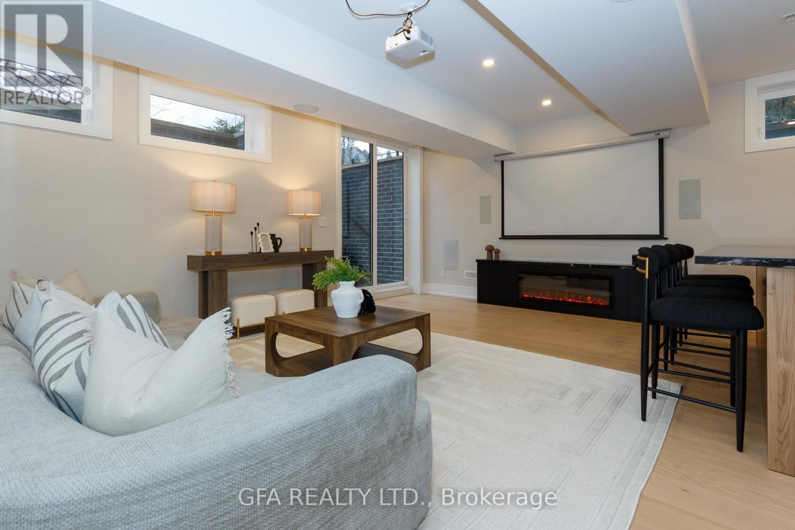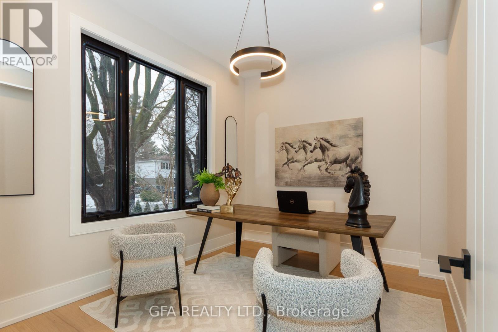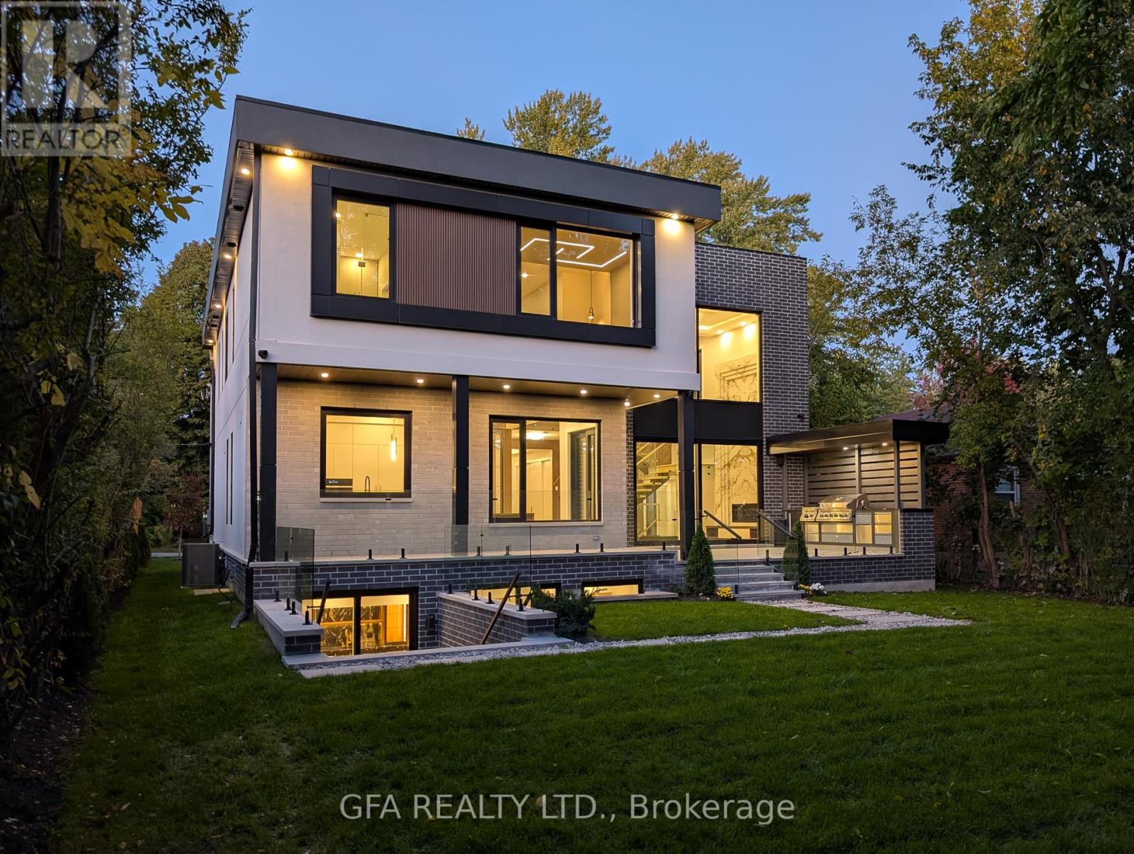 Exquisite custom-built luxury home available for lease in the prestigious Mineola neighbourhood, meticulously designed by Hilal Company & Inspiration Design, and crafted by Eaglecrest New Homes Inc.This breathtaking 5,500+ sq ft residence perfectly combines timeless elegance, modern sophistication, and superior craftsmanship. Every detail has been thoughtfully curated, from the grand entrance to the bespoke millwork, artisan paneling, and striking feature walls that define the interiors.Step into the main floor to experience soaring 20-foot ceilings and floor-to-ceiling windows that flood the space with natural light. The dramatic 17-foot porcelain fireplace serves as a stunning focal point for the open-concept family and living areas. A chef-inspired kitchen, featuring integrated Jenn Air appliances, luxurious countertops, Italian porcelain, and a dedicated breakfast area, seamlessly connects to formal dining and entertaining spaces. A bright home office, ultra-modern powder room, and mudroom with side entrance complete the main level with thoughtful functionality.The upper level offers a serene primary suite retreat, featuring a spa-inspired ensuite and expansive walk-in closet. Three additional bedrooms each include private ensuites and walk-in closets, ensuring comfort and privacy for every family member. A full laundry room adds convenience and efficiency to the upper level. The fully finished lower level is designed for entertainment and wellness, with a vast recreation room featuring a home theatre, granite wet bar with wine display, and walk-up access to the backyard. A dedicated gym and wellness area includes a spa bathroom with jetted tub, while a private in-law suite offers a kitchenette, living space, bathroom, and walk-in closet. Additional storage and laundry complete this level. Step outside to a beautifully landscaped outdoor oasis with covered and open-air decks, built-in BBQ, natural stone patio, and integrated outdoor speakers. (41931278)