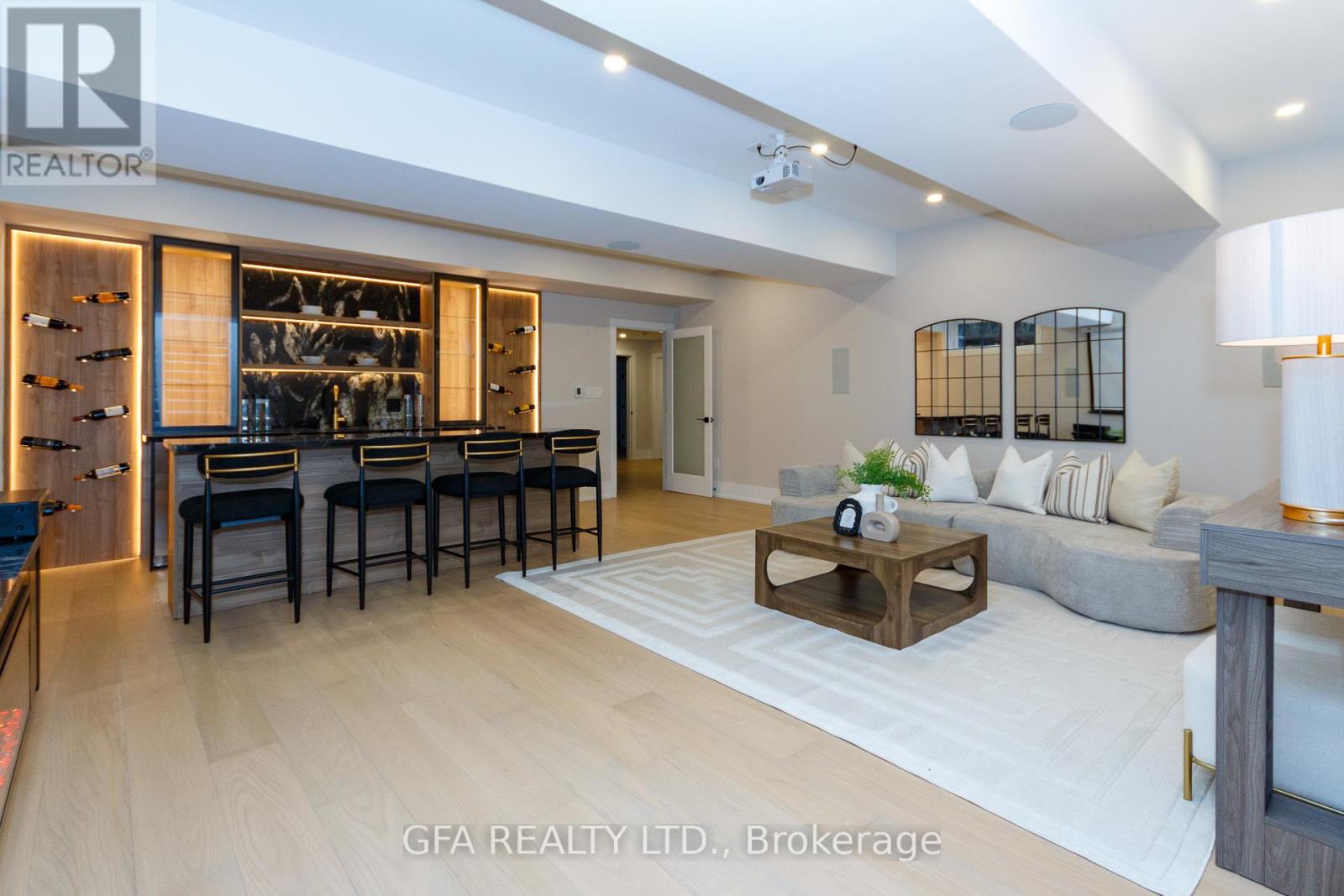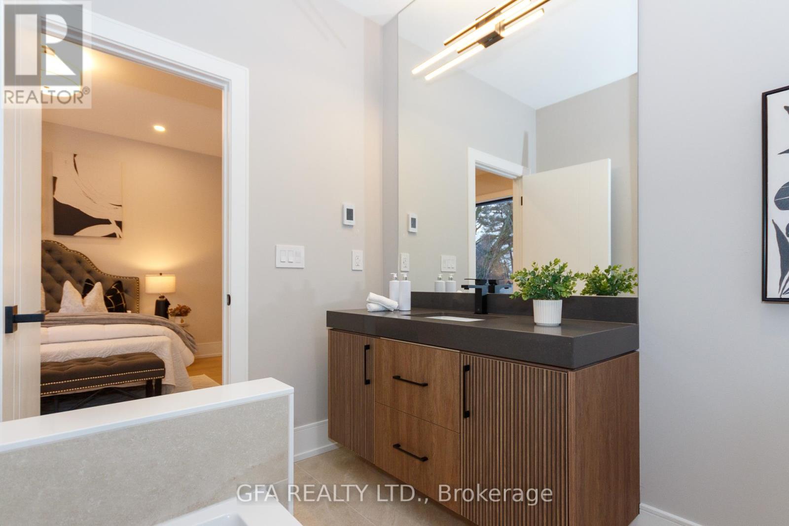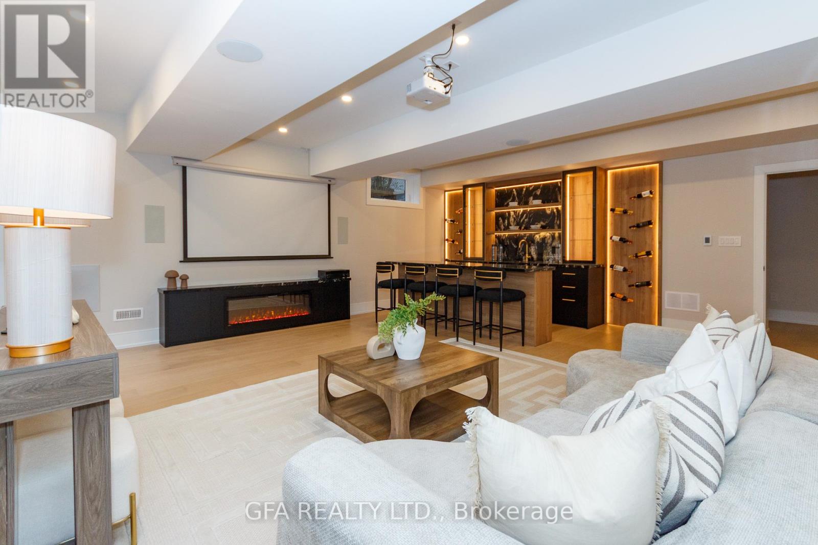 Exquisite custom-built luxury home available for lease in the prestigious Mineola neighbourhood, meticulously designed by Hilal Company & Inspiration Design, and crafted by Eaglecrest New Homes Inc.This breathtaking 5,500+ sq ft residence perfectly combines timeless elegance, modern sophistication, and superior craftsmanship. Every detail has been thoughtfully curated, from the grand entrance to the bespoke millwork, artisan paneling, and striking feature walls that define the interiors.Step into the main floor to experience soaring 20-foot ceilings and floor-to-ceiling windows that flood the space with natural light. The dramatic 17-foot porcelain fireplace serves as a stunning focal point for the open-concept family and living areas. A chef-inspired kitchen, featuring integrated Jenn Air appliances, luxurious countertops, Italian porcelain, and a dedicated breakfast area, seamlessly connects to formal dining and entertaining spaces. A bright home office, ultra-modern powder room, and mudroom with side entrance complete the main level with thoughtful functionality.The upper level offers a serene primary suite retreat, featuring a spa-inspired ensuite and expansive walk-in closet. Three additional bedrooms each include private ensuites and walk-in closets, ensuring comfort and privacy for every family member. A full laundry room adds convenience and efficiency to the upper level. The fully finished lower level is designed for entertainment and wellness, with a vast recreation room featuring a home theatre, granite wet bar with wine display, and walk-up access to the backyard. A dedicated gym and wellness area includes a spa bathroom with jetted tub, while a private in-law suite offers a kitchenette, living space, bathroom, and walk-in closet. Additional storage and laundry complete this level. Step outside to a beautifully landscaped outdoor oasis with covered and open-air decks, built-in BBQ, natural stone patio, and integrated outdoor speakers. (41931278)