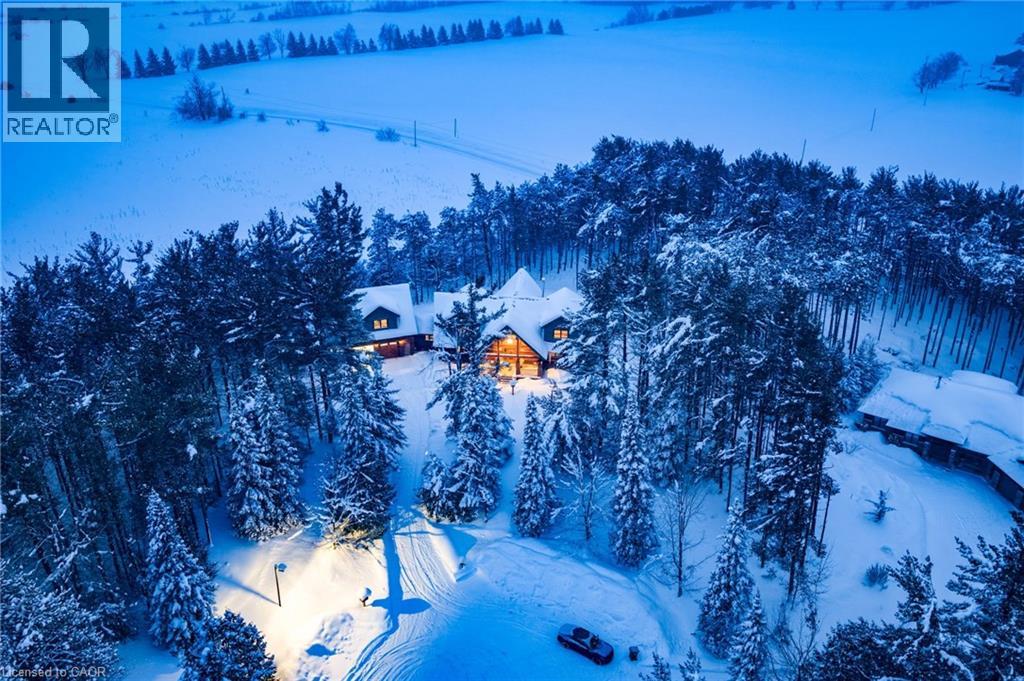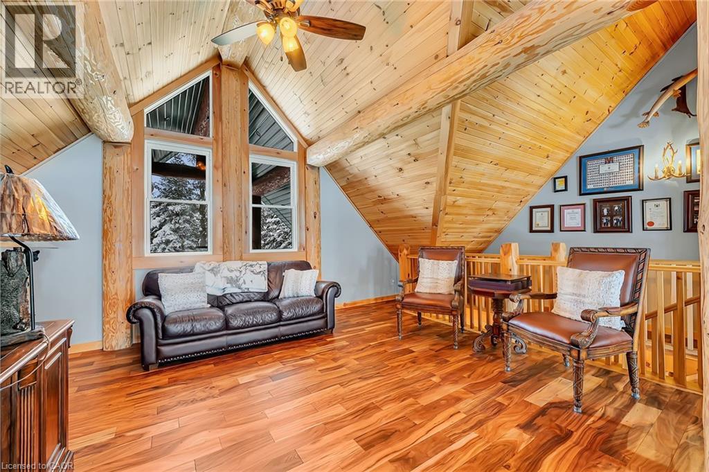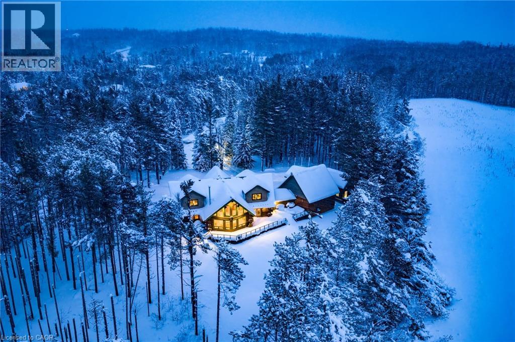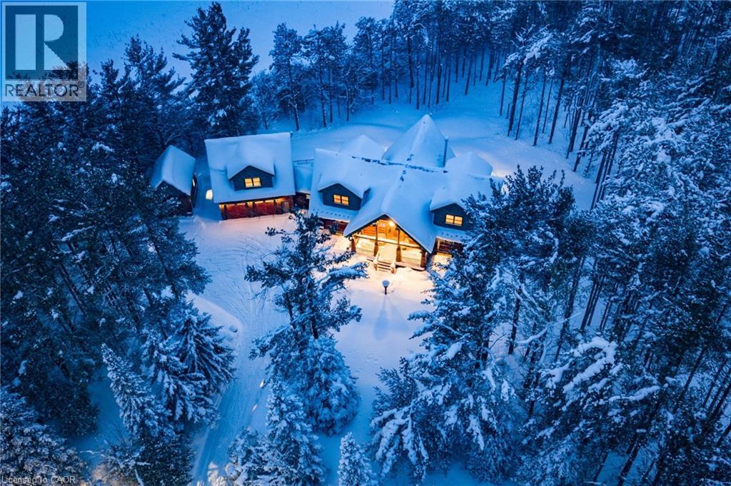 Set apart by timeless craftsmanship and natural beauty, this one-of-a-kind custom-built log home is privately situated at the end of a quiet cul-de-sac on 2.1 acres of mature, tree-lined grounds. This exceptionally unique residence boasts nearly 6,000 SF of refined living space that blends rustic elegance with modern comfort. Designed for both grand entertaining and everyday living, the home features 6 bedrooms and 4.5 bathrooms, complemented by an energy-efficient geothermal system and the low-maintenance beauty of hand-peeled Western Red Cedar. The stunning great room showcases soaring vaulted ceilings and a dramatic stone fireplace. This space flows seamlessly into a chef-inspired kitchen with granite countertops, stainless steel appliances, alongside a welcoming dining area ideal for intimate meals or large gatherings. The main-level primary suite features a private retreat complete with a walk-in closet and spa-like ensuite. Additional highlights include an upper-level den with scenic treetop views, beautifully appointed ensuite bedrooms for family and guests, and a radiant-heated lower level perfect for year-round entertaining or relaxation. An attached heated garage with smart openers is enhanced further by an impressive 650 SF loft making it ideal for a home office, studio, creative space or additional storage. Embrace the sights and sounds of the outdoors on the new 1,100 SF deck which spans the entire rear side of the home. The well-appointed grounds showcase professionally landscaped armour stone walkways and gardens as well as a detached 3rd garage. Delivering the perfect balance of privacy and convenience, this year-round retreat is located just a short drive from Barrie and only one hour from Toronto. With easy access to nearby lakes, trails, Horseshoe Valley Ski Resort, Vetta Spa, and other seasonal recreation destinations, this extraordinary property delivers an unparalleled lifestyle of comfort, beauty, and tranquility. (70039044)