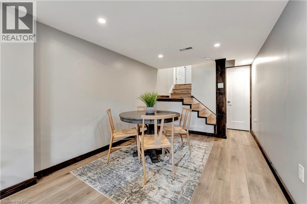 Dining space featuring stairway, light wood-style flooring, and recessed lighting