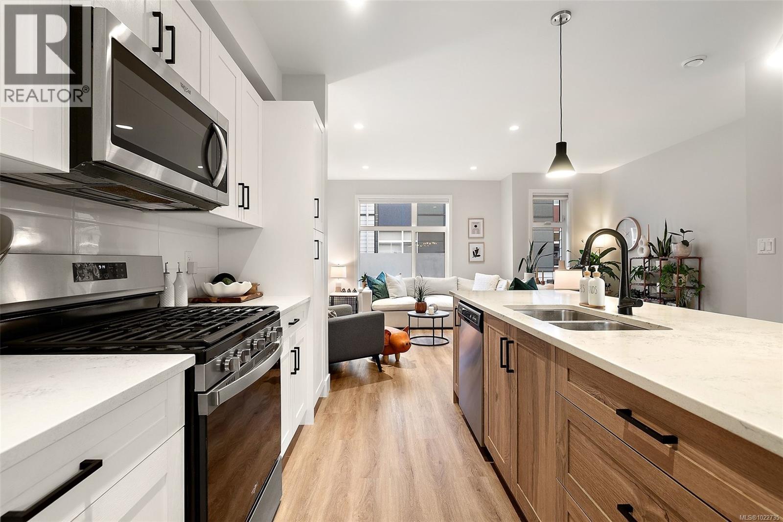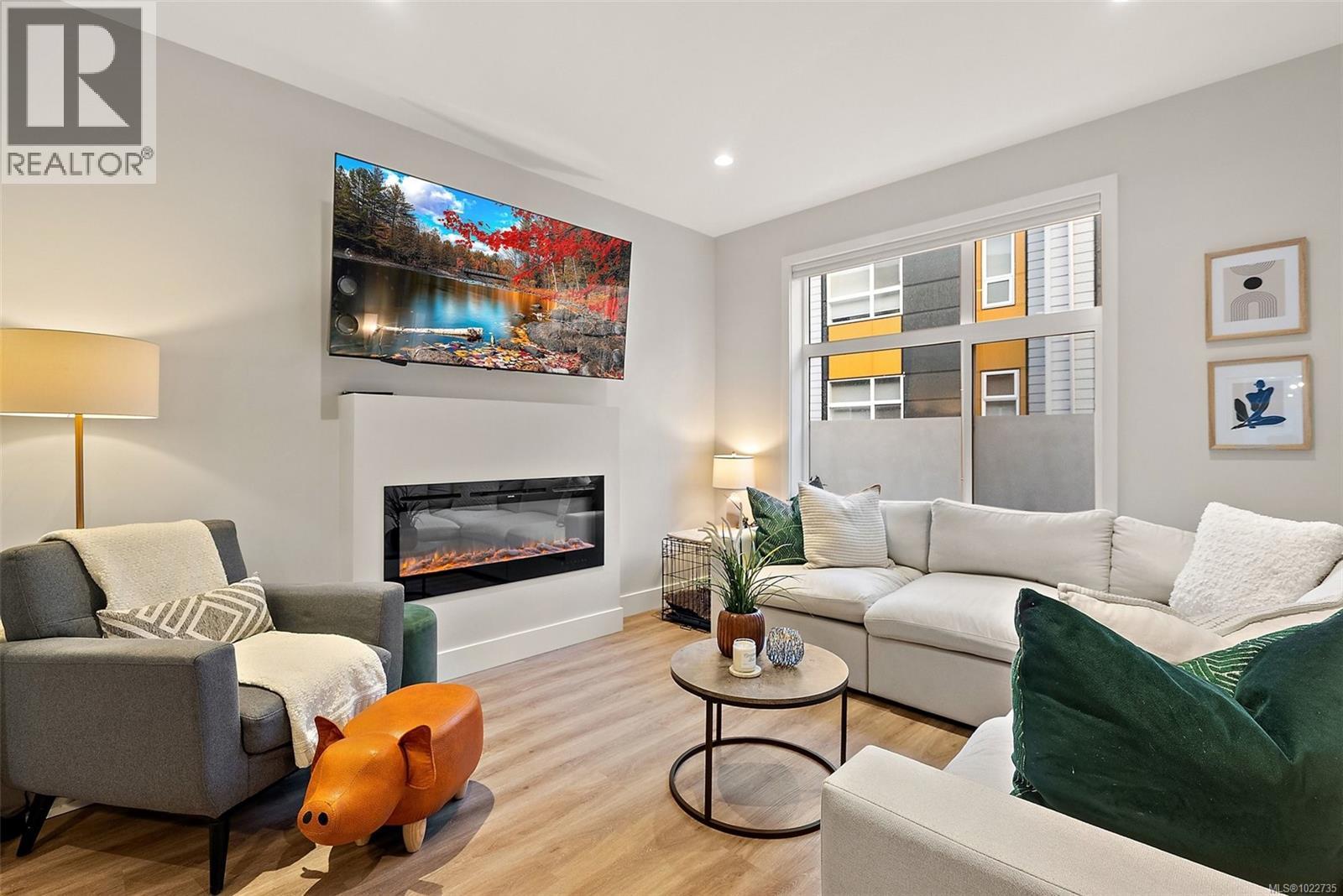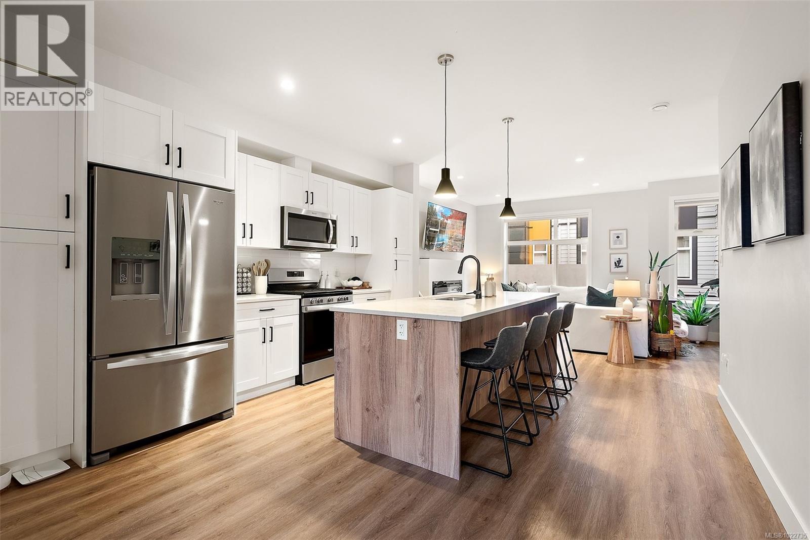 Welcome home to this bright, well-appointed 3-bedroom, 3-bathroom home offering 1,450 sq ft of comfortable living space plus an oversized 532 sq ft garage. The main level features an open layout with 9-ft ceilings, electric fireplace, and a chef-inspired kitchen complete with quartz countertops, stainless steel appliances with gas range, soft-close cabinetry, full-height pantry, tile backsplash, and a large island ideal for everyday living and entertaining. Added comforts include air conditioning, on-demand hot water, and cordless blinds throughout. Upstairs, the primary bedroom offers a walk-in closet and 4-piece ensuite, with two additional bedrooms nearby. Outside, enjoy a sunny south-facing deck and fully fenced yard—perfect for kids, pets, or hosting. Conveniently located near Red Barn Market, Olympic View Golf Course, and the Galloping Goose Trail. Rentals permitted, pets welcome with no weight restrictions, and remaining 2-5-10 home warranty. Call today for private showing 250-589-6995 (30268553)