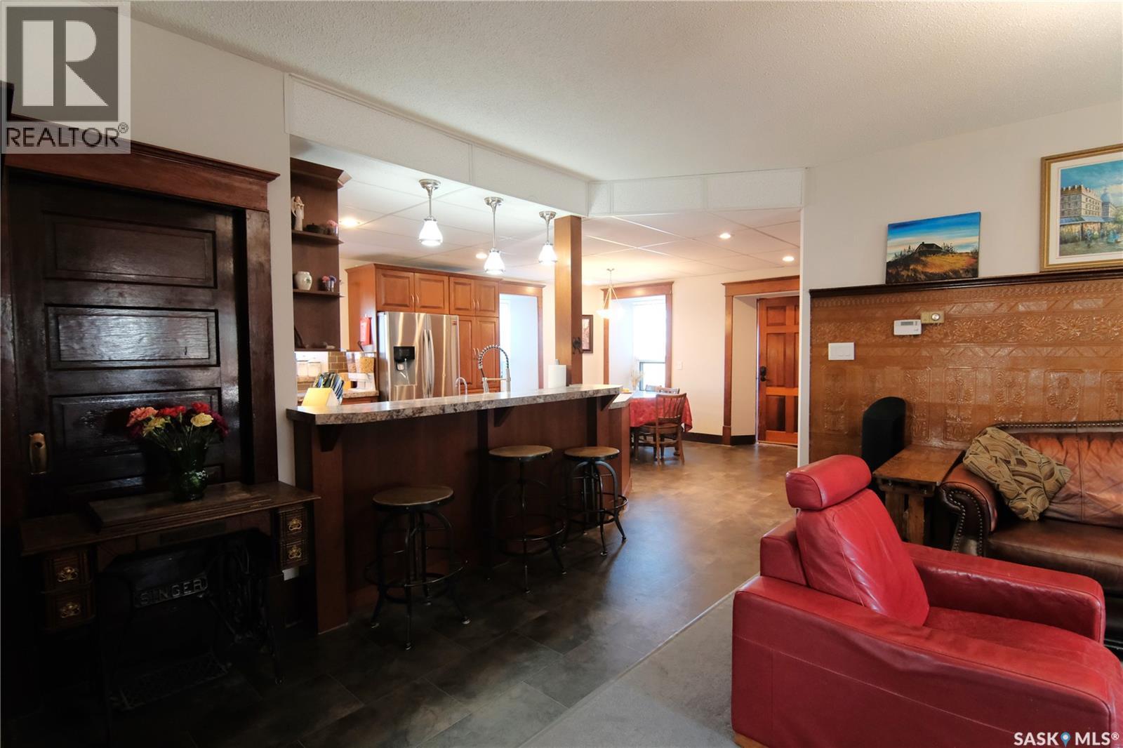 Steeped in more than a century of family legacy, this remarkable 10-acre homestead offers a rare opportunity to own a true piece of prairie history. The impressive 3,697 sq ft stone home welcomes you with a spacious vestibule and features 5 bedrooms, 3 bathrooms, an updated kitchen, a large second-floor laundry room, and a beautiful third-floor primary suite with stunning sunrise views. The well system includes a softener, iron removal, and reverse osmosis. The iconic 100' x 36' barn, complete with an architectural metal roof, remains a community landmark whose upper loft once hosted gatherings and celebrations for neighbours from miles around. Historical tack will remain, and the barn is equipped with a cistern for rainwater collection and a manual water feeder leading to the fenced pasture. Additional features include an original outhouse, metal and plastic play structures, and a heated 1972 shop with gas heat and 220V power. Ten usable acres provide ample space for livestock, gardening, recreation, or simply enjoying the peace of rural living. Located just 13 km from Wolseley, with K–12 schools and the charm of small-town Saskatchewan life nearby. (29272884)