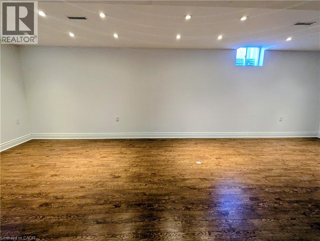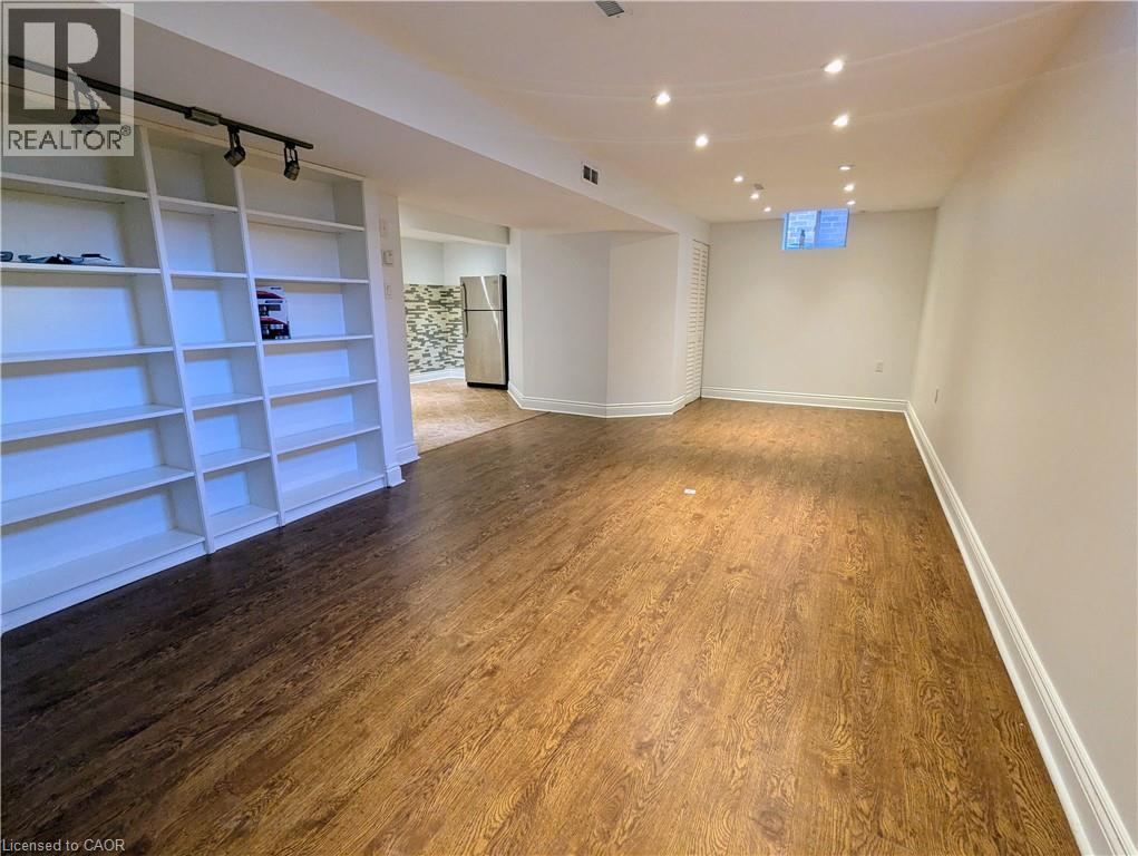 Basement with dark wood finished floors and recessed lighting