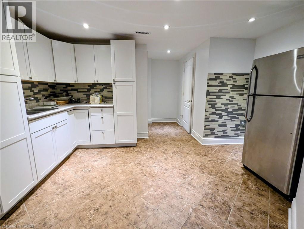 Kitchen featuring freestanding refrigerator, white cabinets, tasteful backsplash, and recessed lighting