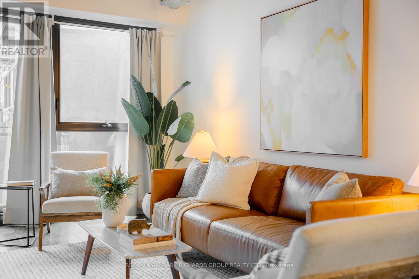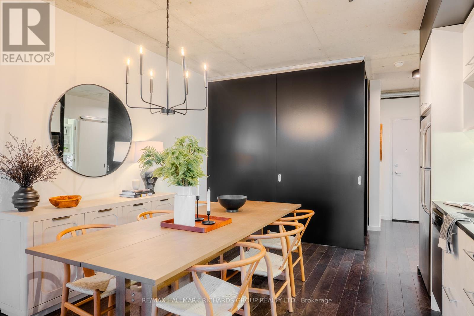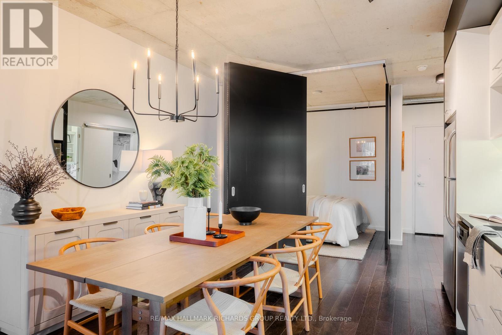 A thoughtfully designed loft-style residence that delivers exceptional flexibility, natural flow, and a lifestyle-forward setting in the heart of the Canary District. This open-concept one-bedroom plus den offers a rare level of versatility, with a generously sized den that comfortably functions as a true second bedroom. A collapsible wall allows the space to open seamlessly for entertaining or close off for privacy, work-from-home needs, or guests. Concrete ceilings and warm hardwood floors create a modern, architectural backdrop, while the kitchen integrates effortlessly with the living and dining areas for everyday ease and hosting alike. Storage is both abundant and intentionally planned, highlighted by an oversized walk-in closet located in the front hall, making it ideal as additional storage for a second bedroom or den setup. The semi-ensuite, dual-access bathroom is complemented by extended cabinetry and linen storage above a brand new washer/dryer combo (2025) for added functionality. Step outside to an open balcony overlooking the landscaped courtyard and outdoor pool, offering a resort-like atmosphere that truly shines in the warmer months. Surrounded by some of downtown Toronto's most thoughtfully planned green space, including the expansive Corktown Commons just steps away, perfect for morning walks, sunset runs, or relaxed afternoons outdoors. Enjoy downtown living without the chaos, while in close proximity to the Distillery District, St. Lawrence Market, Riverside, and Leslieville, with easy TTC access to King and Queen streetcars and seamless connectivity to the DVP, Lakeshore, and Bayview Extension. Everyday conveniences abound, from parks and trails to fitness centres, grocery options, dog-friendly cafes, and standout dining destinations such as The Broadview Hotel rooftop. A well-managed building with 24/7 security and impeccably maintained common areas completes the offering - a refined, flexible home designed for modern urban living. (41938627)