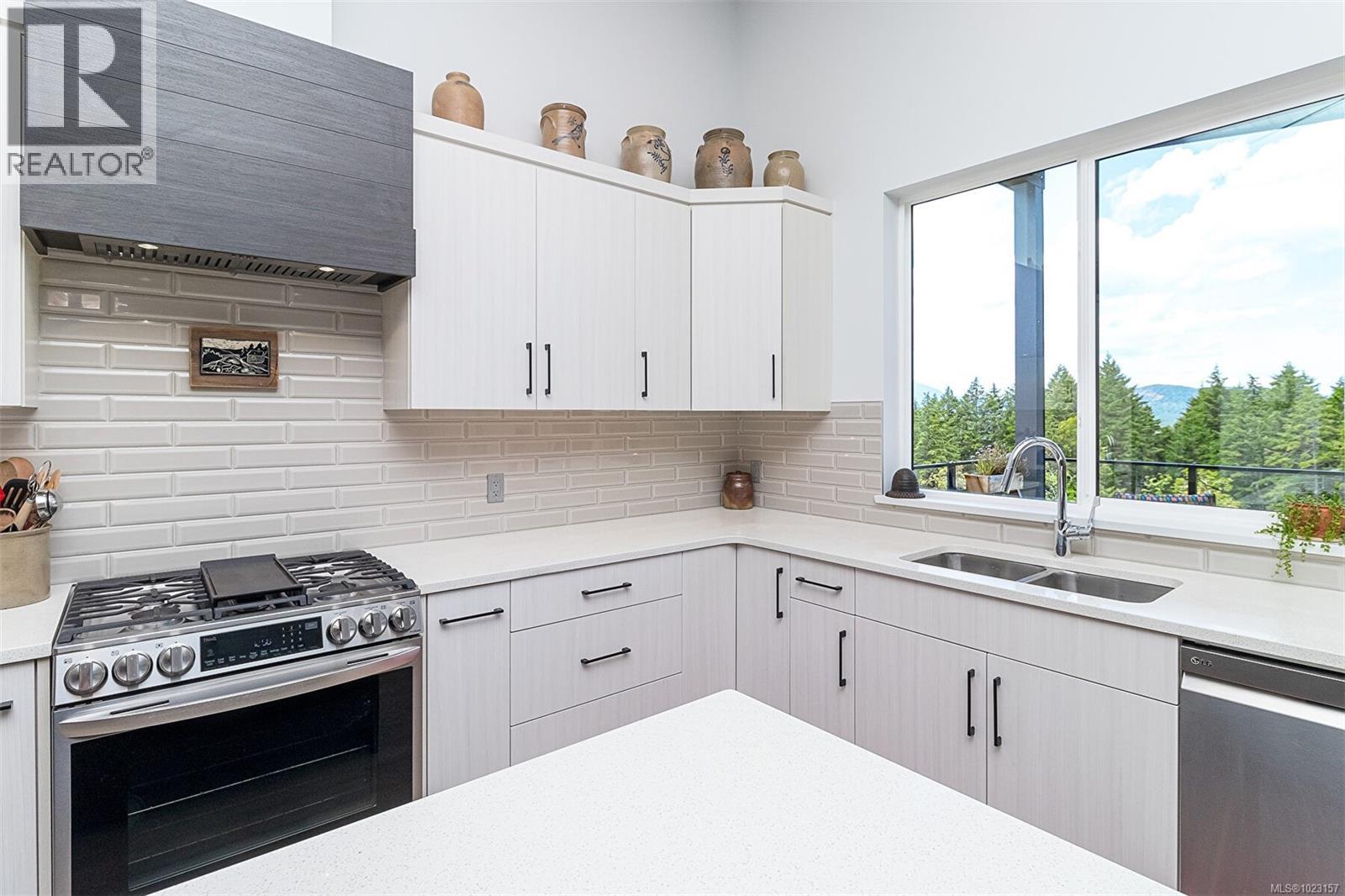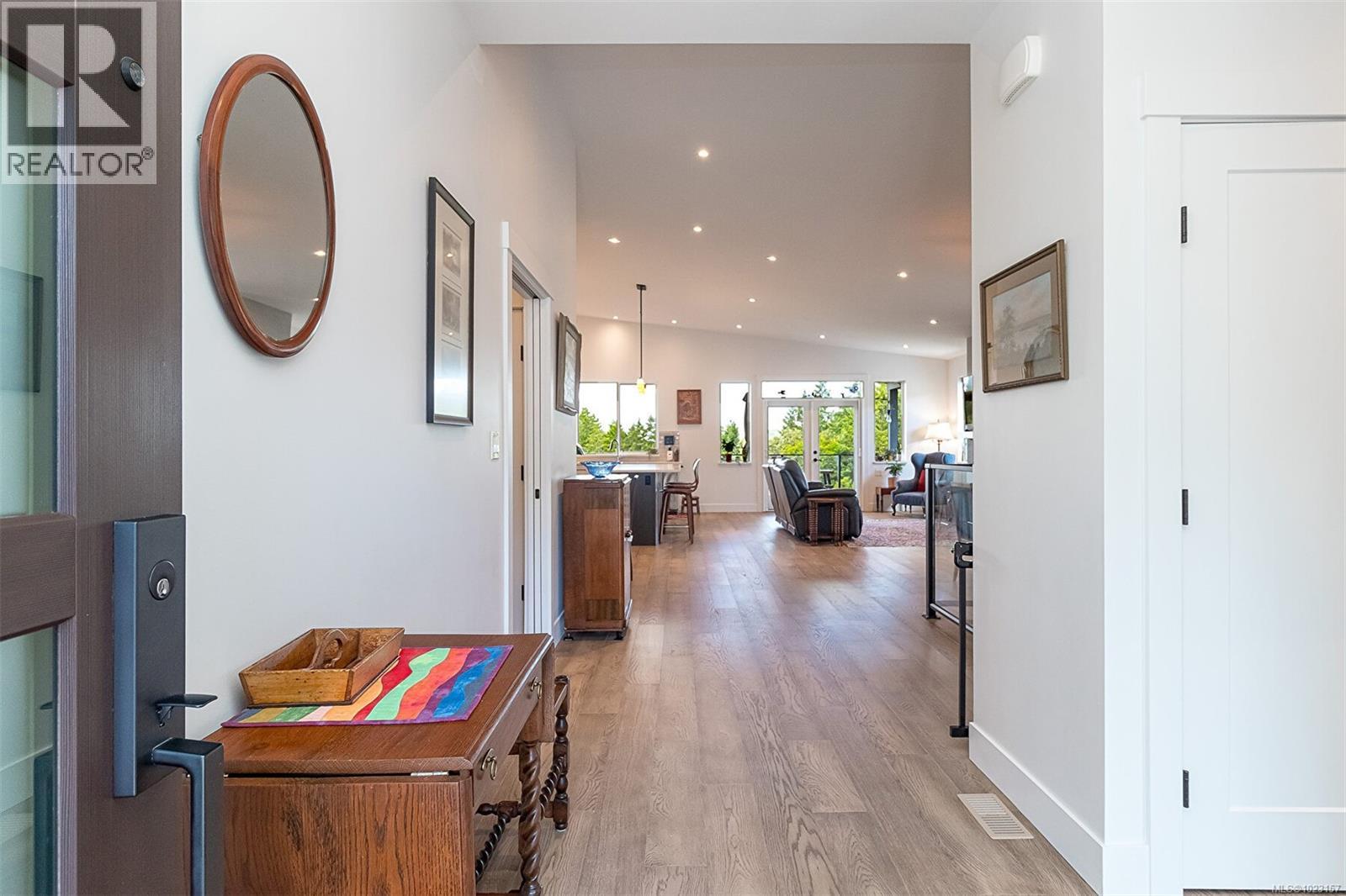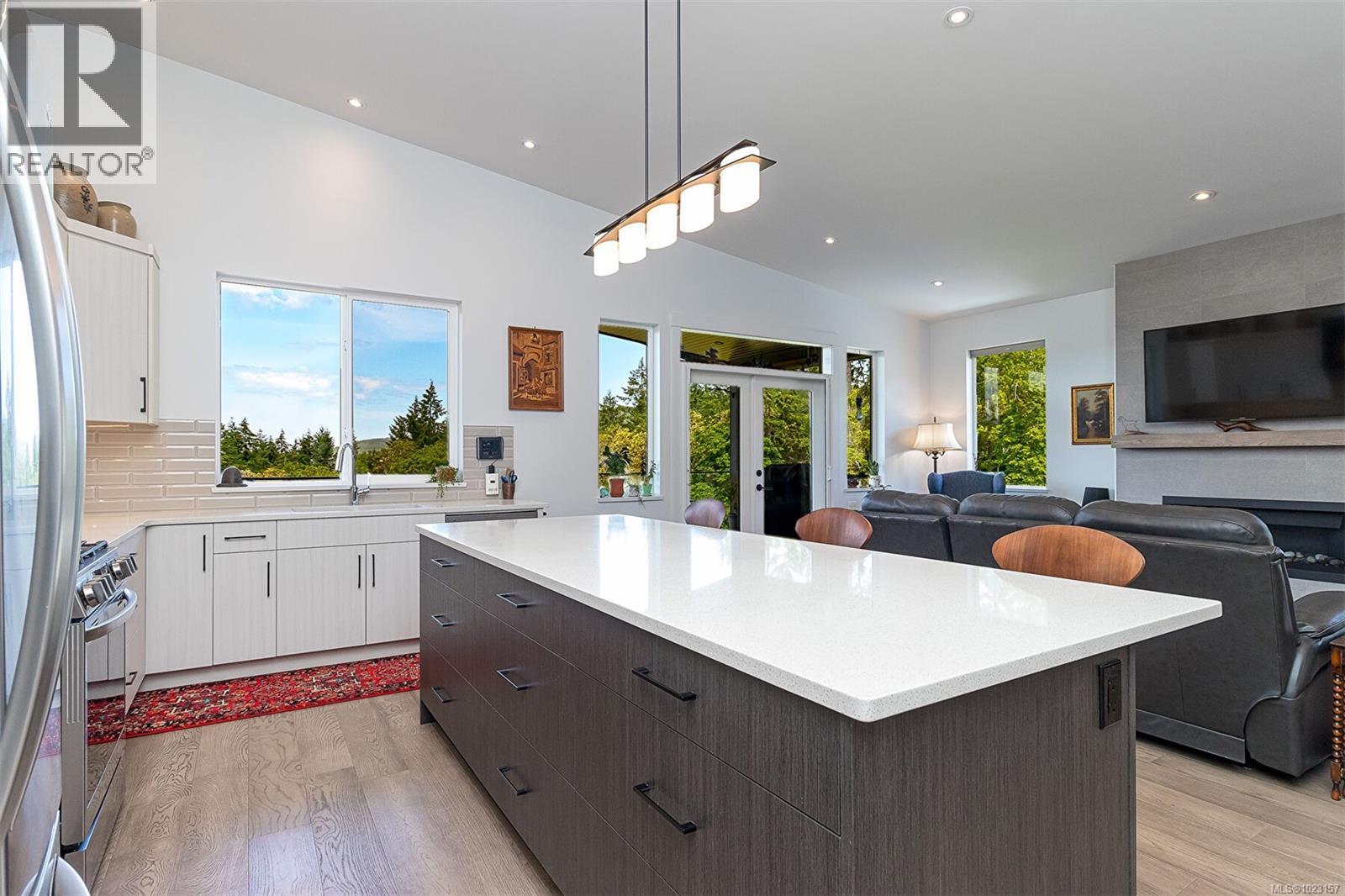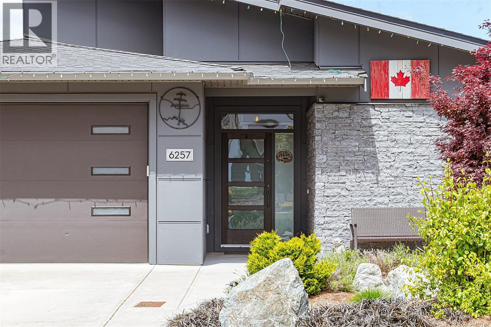Welcome to Maple Bay in the Cowichan Valley. 6257 Highwood Drive is a 2022 custom built home by Elmworth Construction. This contemporary home is built with energy efficiency and minimal resource usage. The solar panels generate enough electricity to cover all but the service delivery costs of the home ( $111.00 for 2025 ). The gardens are native, drought tolerant plants with drip irrigation, which means low water bills and easy care maintenance and included backyard fencing. The backyard leads out to Garry Oak meadows and accessible green space. This home is bright & thoughtfully designed with amazing privacy and views. Featuring a newly installed solar roof, wood shed, fencing and professional landscaping with native plants and irrigation system. Main level living includes a bright, spacious kitchen with custom cabinetry & quartz countertops, adjacent open area with gas fireplace & double patio doors leading to an all-seasons covered deck. The large primary bedroom is complemented with double sinks, custom tile shower, luxurious soaker tub & walk-in closet. The second bedroom on the main floor could be used as an office. The lower level offers a large media room, 4 piece bath, 2 more bedrooms and family room. The bonus is an additional 1 bedroom suite with private entrance and it has been created with a modern, open concept design. The oversized double garage has room for 2 vehicles, EV Charging & storage. (30270031)