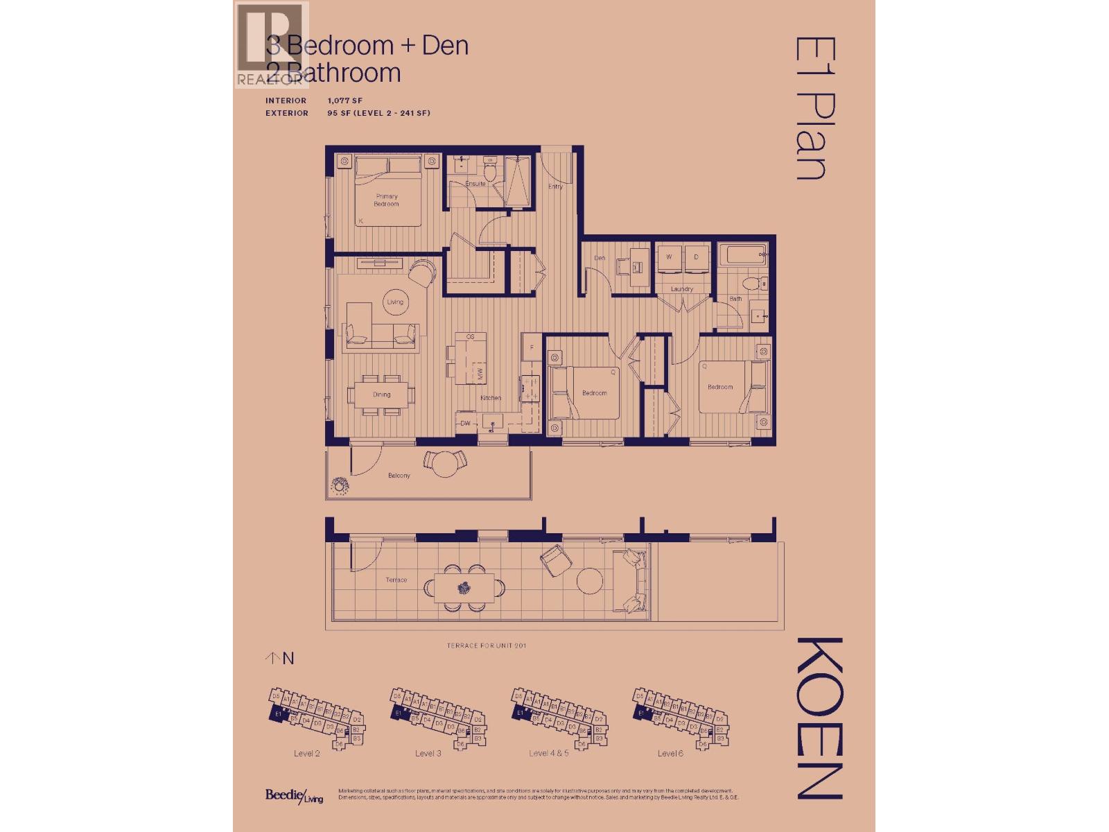 Discover this spacious 3-bed + den, 2-bath home at Koen by Beedie Living. With over 1,000 sf of home space, enjoy a private south-facing balcony perfect for outdoor relaxation. The primary bedroom fits a king-sized bed and features a walk-in closet and private ensuite. The flex-use den adapts to your needs - perfect for a home office. The chef's kitchen is outfitted with a premium Porter & Charles appliance package, while the convenient laundry space features a side-by-side washer and dryer. Residents can enjoy access to premium amenities including an entertainment lounge, outdoor lounge with BBQ and fire table, interactive children's play area, fitness centre and more. At Koen, live just minutes from Metropolis at Metrotown, Station Square, and Royal Oak SkyTrain Station. (32326138)