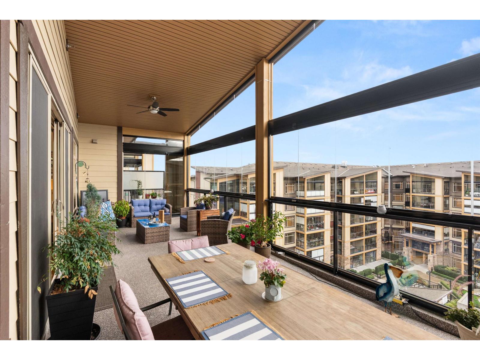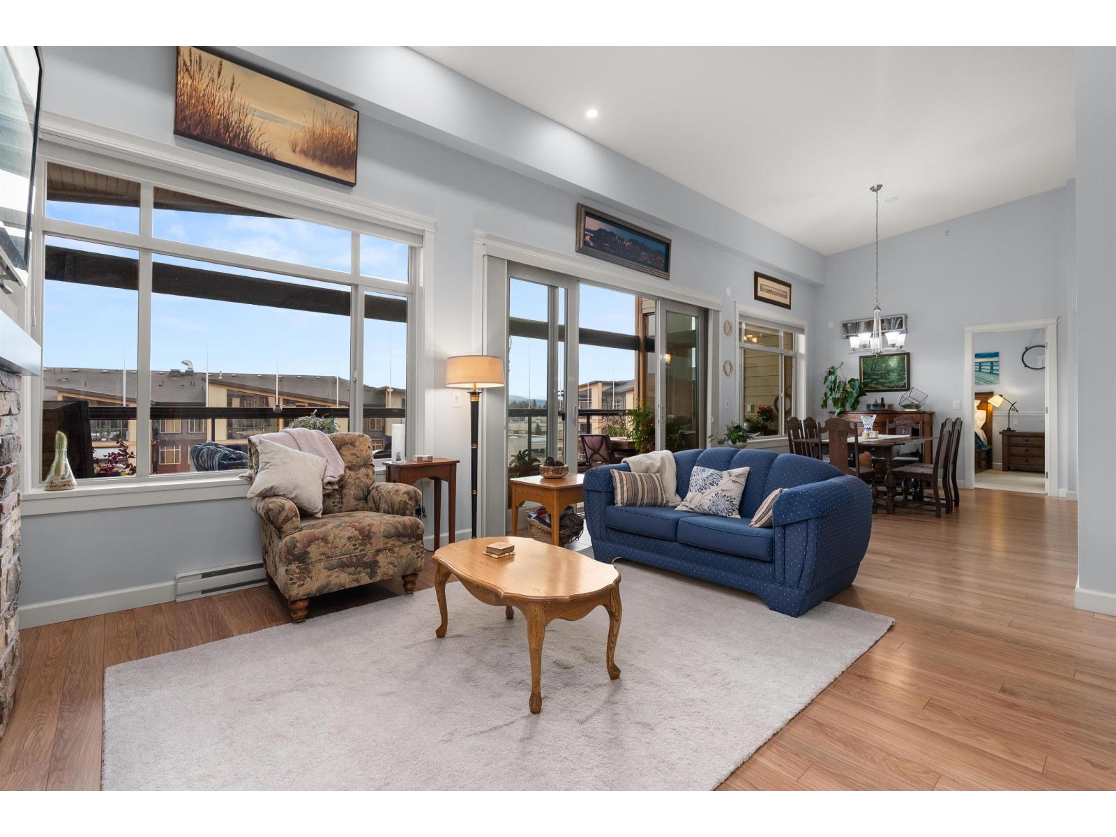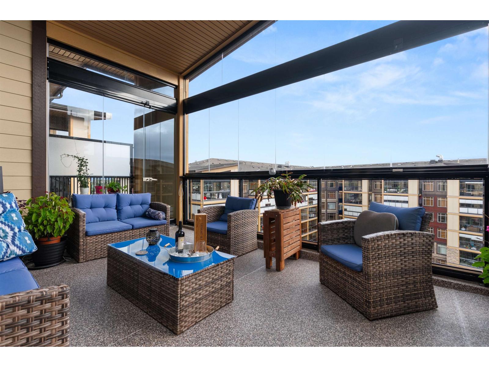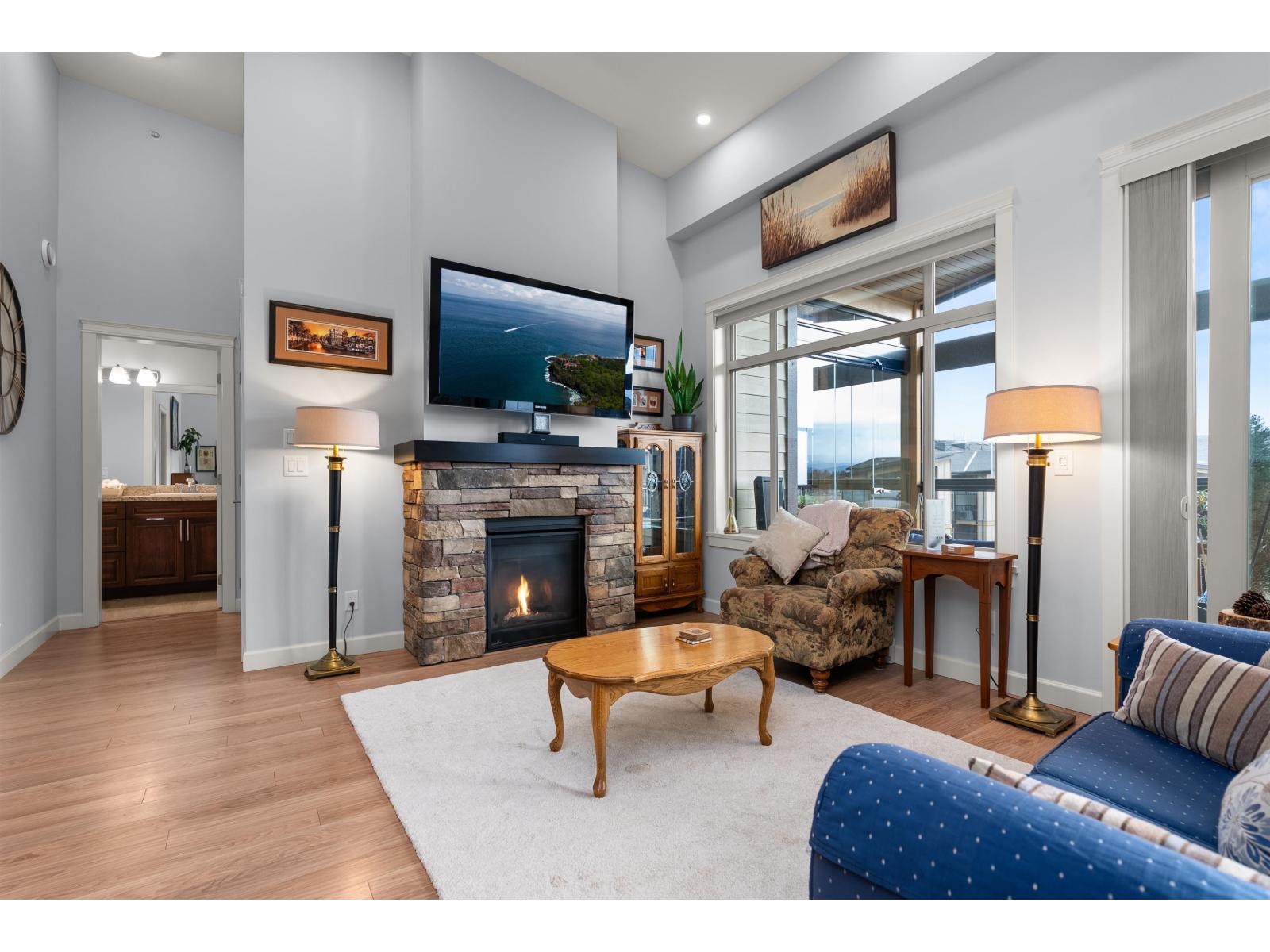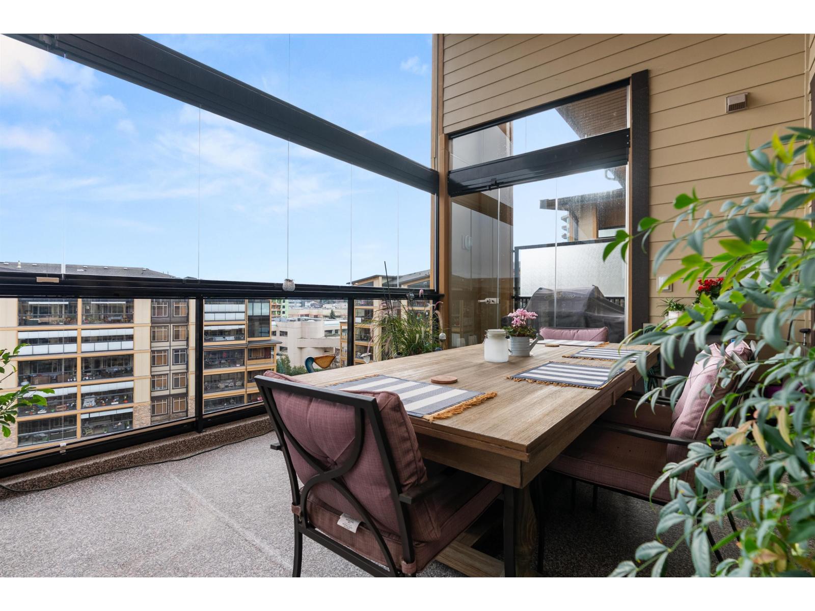 La Galleria Penthouse - Welcome to this exceptional residence in one of Abbotsford's most sought-after, quality-built buildings. Ideally located in the heart of the city, with most amenities just steps away. This bright, open-concept home features hardwood floors, a gas fireplace, and an abundance of natural light. Enjoy the expansive patio with retractable glass and gas BBQ hookups, perfect for year-round use. Offering two bedrooms plus a den that easily functions as a third bedroom, this home is tastefully decorated and impeccably maintained. Includes four parking stalls and two large private storage lockers. Courtyard-facing with lovely views. The perfect opportunity to downsize without compromise. (32326247)