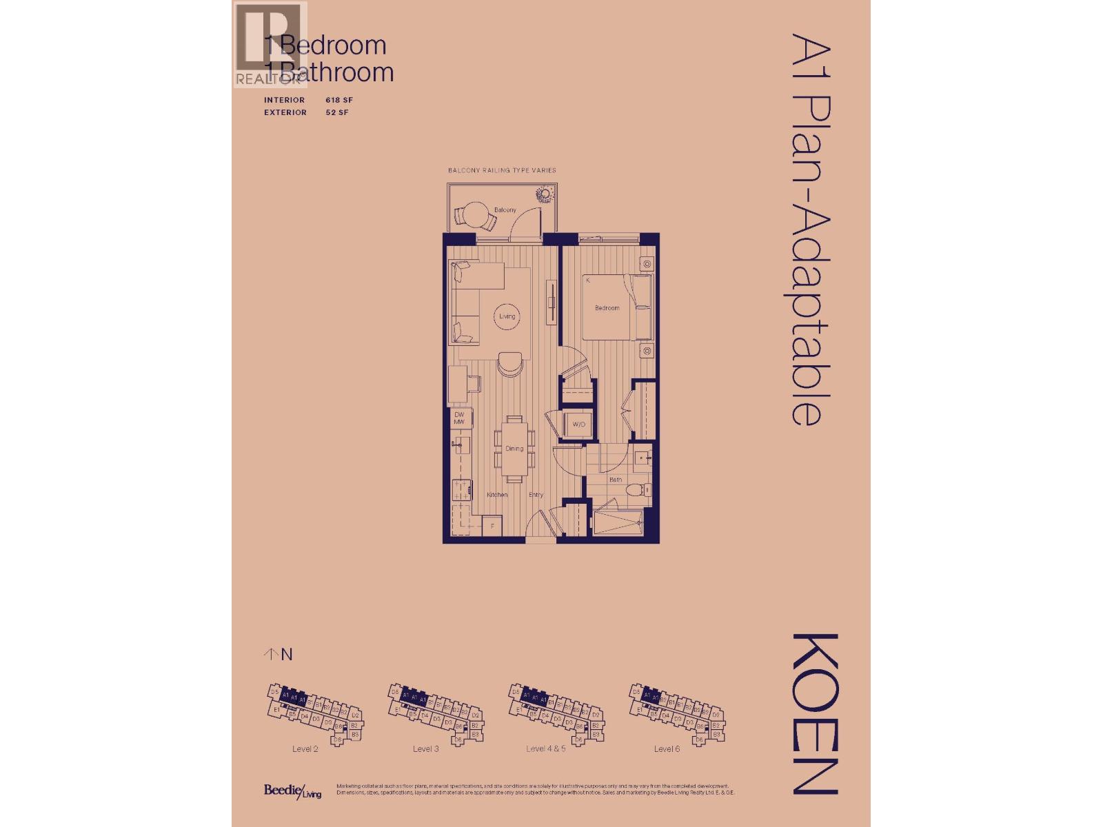Welcome to Koen by Beedie Living. This stylish 1-bedroom, 1-bath home offers over 600 sf of well-planned living space. Enjoy a private balcony and an open kitchen, living, and dining area. The spacious bedroom fits a king-sized bed and offers direct access to the bathroom for added convenience. The modern kitchen features smart storage, including tiered pull-out shelving and a concealed eco-recycling hub, complemented by a high-performance Porter & Charles appliance package. Residents can enjoy access to premium amenities including an entertainment lounge, outdoor lounge with BBQ and fire table, interactive children's play area, fitness centre and more. At Koen, live just minutes from Metropolis at Metrotown, Station Square, and Royal Oak SkyTrain Station. (32326488)
