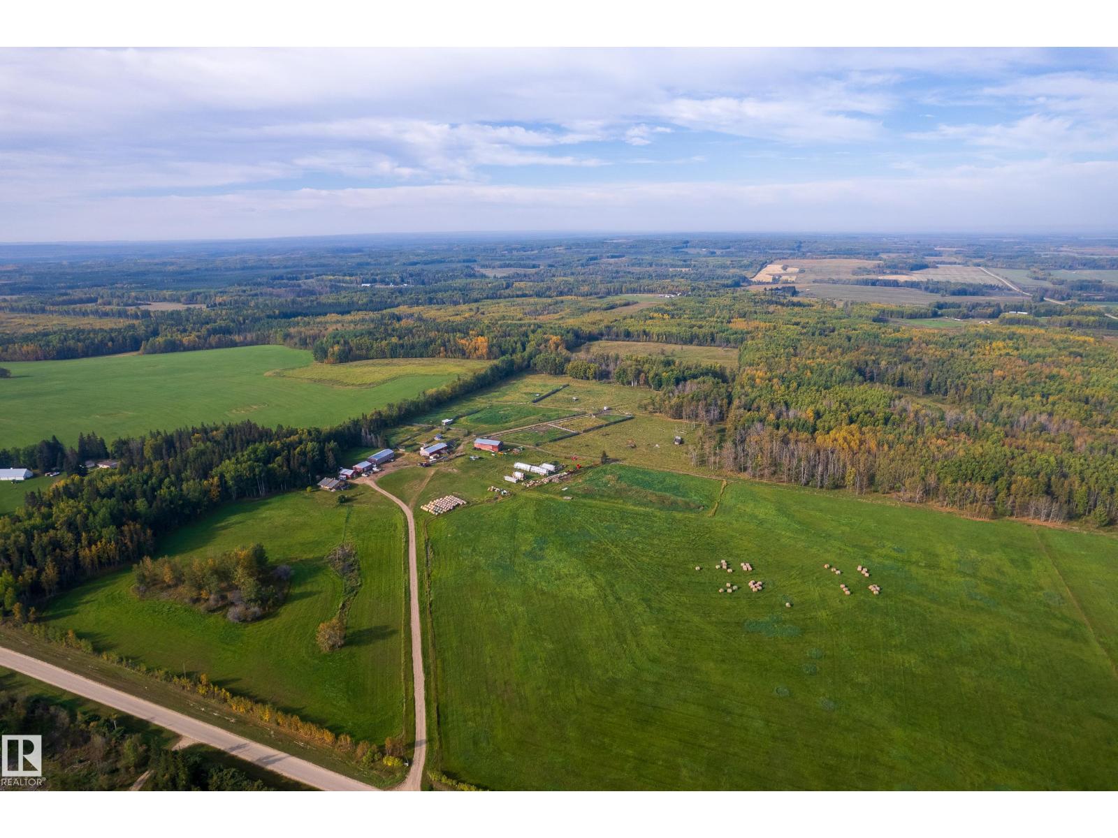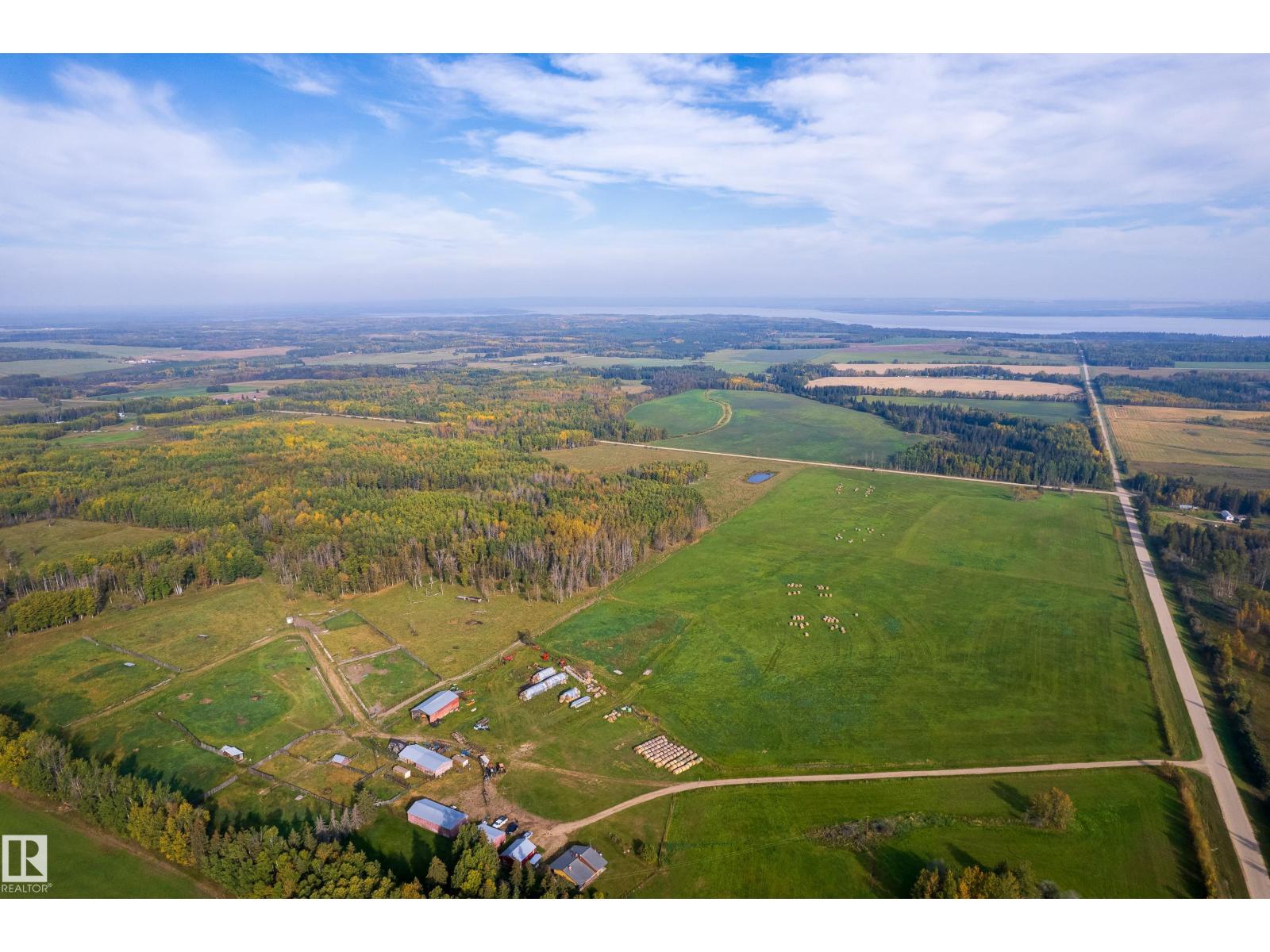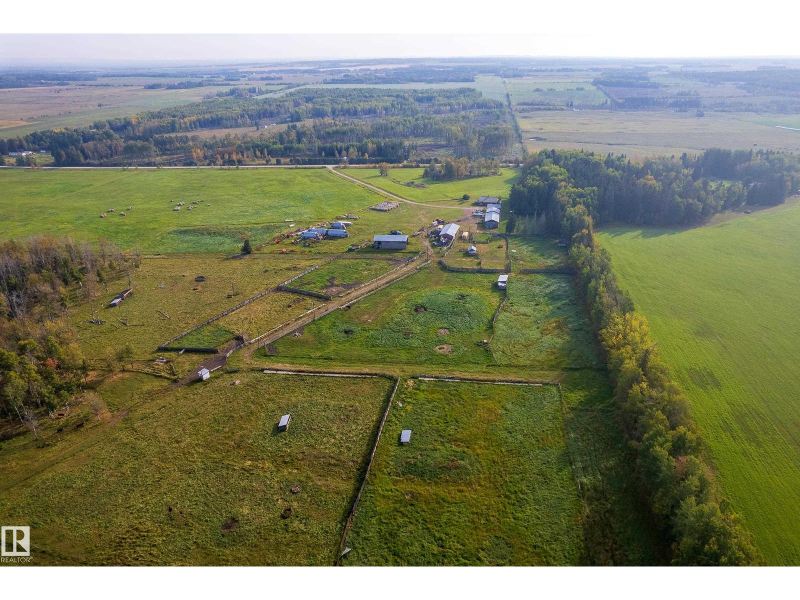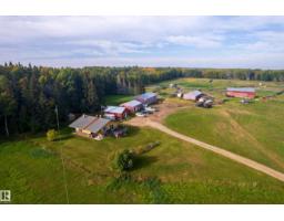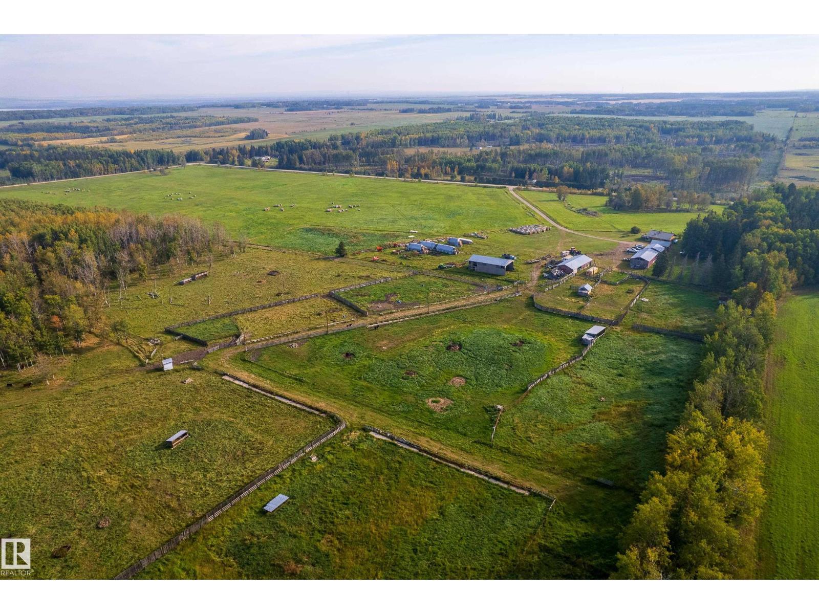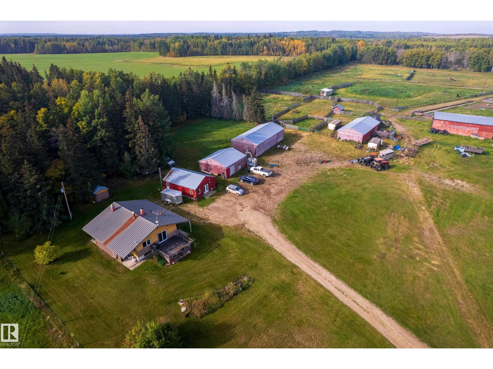 1/4 Section with a split level country style family home. Main level features open concept kitchen and living area with wood vaulted ceilings. Patio doors lead to the deck with sweeping views overlooking Chip lake. Main level has 3 beds and 4 piece bath. Lower level features 4th bed, large family room, wood burning stove, utility and cold storage rooms. Outside, there is a sheltered fire pit area and plenty of room to establish a garden. Outbuildings include 2 shops, hayshed and barn, partially insulated. There is a smaller heated shop, currently in use as on farm store. Sorting corrals at the barn, as well as larger feedlot pens with multiple livestock waterers. Property has multiple water wells. Full perimeter fencing and cross fencing with a mix of grazing pasture/hay and woodland. Ideal for the horse enthusiast or just the outdoor lover with ample game and serene peace and quiet. Currently set up as cow/calf operation. On a no through road with easy access to highway 16. 10 minutes to Wildwood. (33717947)