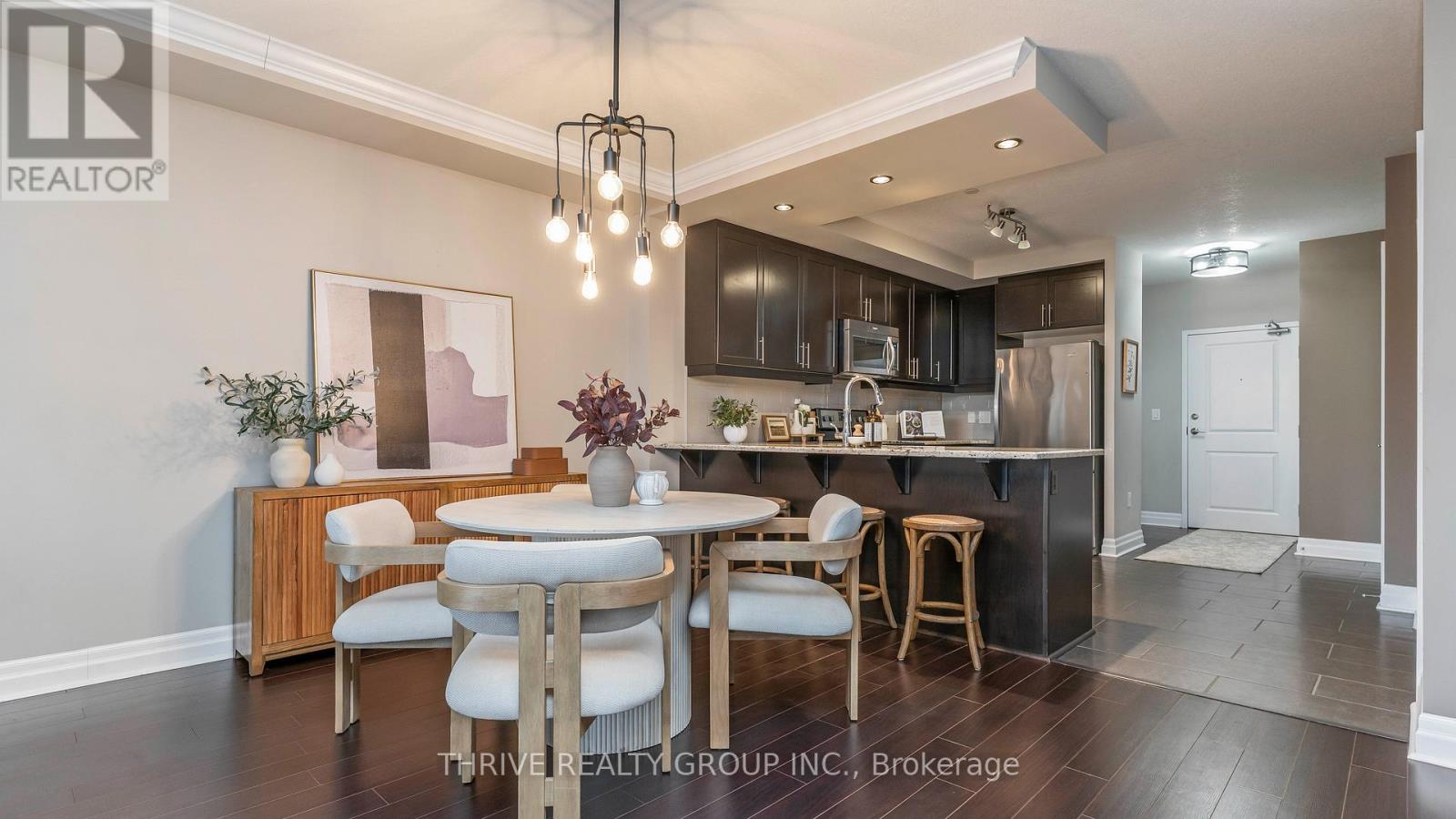 Elevate your lifestyle in this meticulously maintained 1 bedroom plus den unit located in the highly sought-after Village North community. Thoughtfully designed with a north-facing view, this well-laid-out unit features clean, modern finishes and is completely carpet-free. The open-concept kitchen boasts granite countertops, stainless steel appliances, an oversized subway tile backsplash, warm cabinetry, and flows seamlessly into the dining area - perfect for everyday living and entertaining. The living room offers a cozy fireplace, creating a welcoming space to relax. The spacious bedroom includes a walk-in closet and a 4-piece bathroom adjacent to it. Additional highlights include in-suite laundry, ample storage, and a conveniently located underground parking spot close to the elevator. Enjoy an exceptional list of building amenities, including a heated pool, fitness centre, golf simulator, billiards room, private dining room, theatre, and guest suite. Ideally located just steps to shopping and dining at Sunningdale and Richmond, including Longevity Lounge, Pastry Culture, Hanabi Sushi, and more! Don't miss the opportunity to view this impressive unit and everything this outstanding building has to offer - book your showing today! (41943302)