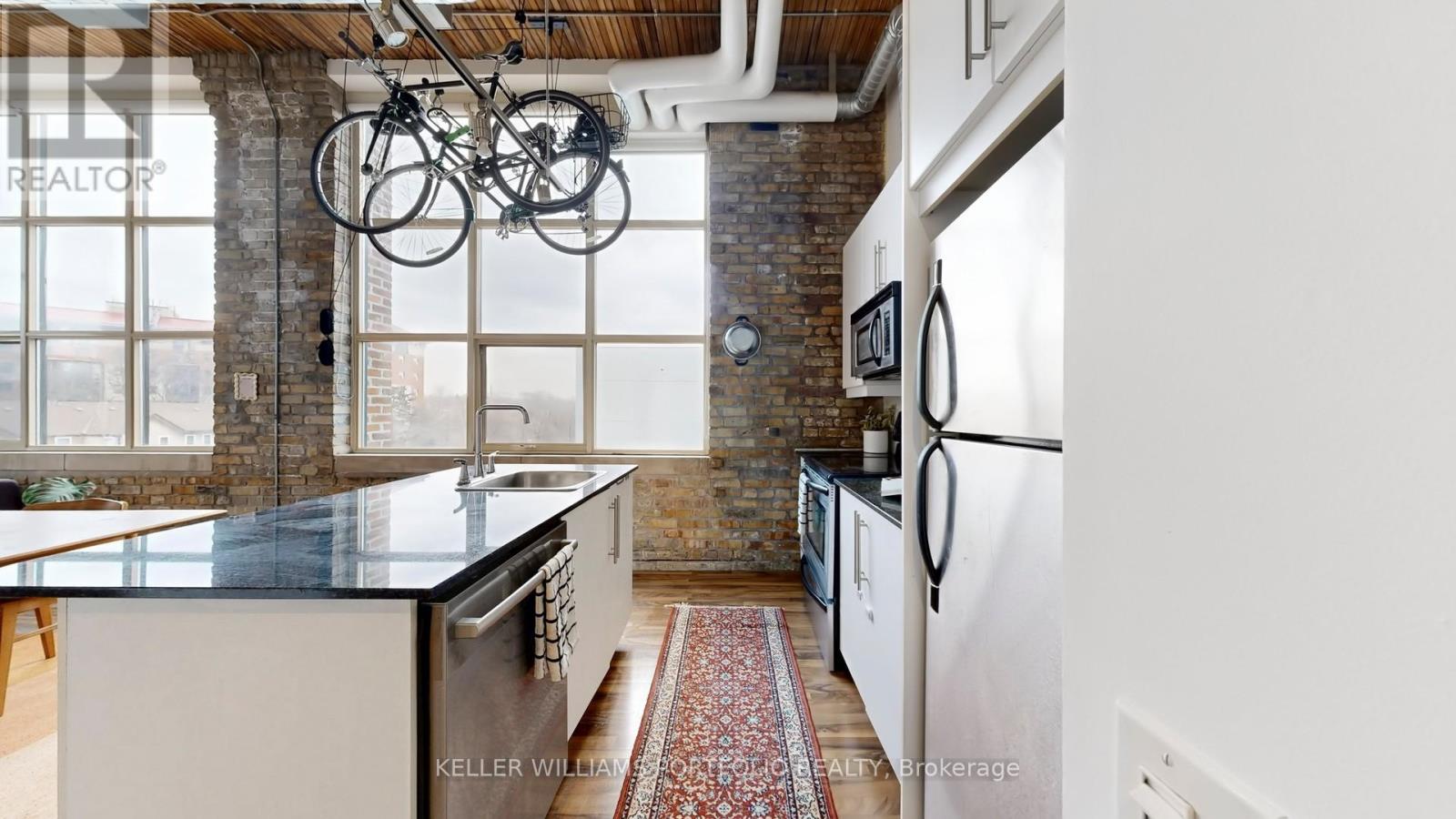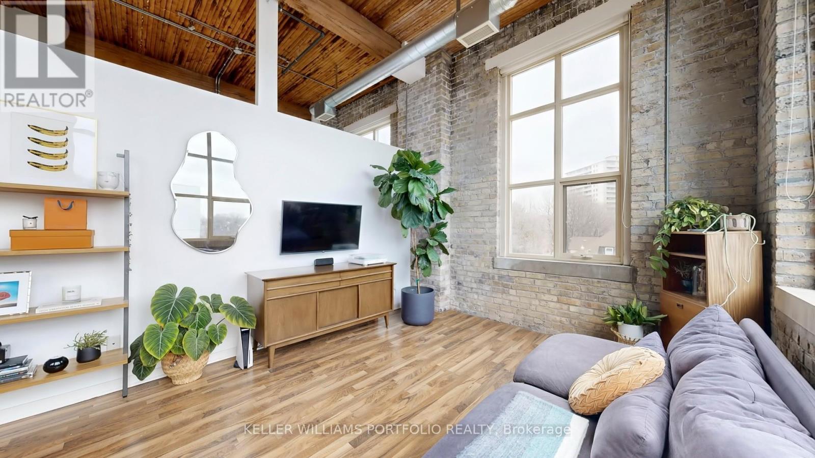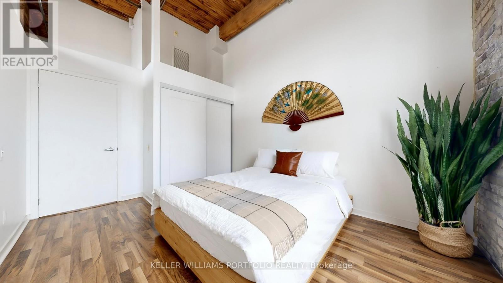 Hard loft lovers, this one's for you. Welcome to Tannery Lofts, a 731 sq ft corner showpiece. Original exposed brick, wood slat ceilings, soaring 13-foot timber beams and ductwork create an unbeatable wow factor. Oversized loft windows flood the 1-bedroom with natural light-a plant lover's dream-while the open-concept layout is perfect for entertaining, creating, or working from home. The kitchen features granite counters and stainless steel appliances, while the renovated bathroom includes updated fixtures and a modern stand-up shower. The generous bedroom with custom built-ins keeps things organized without sacrificing loft style. Tannery Lofts prioritizes character, community and location over flashy amenities. Locker and parking available for rent. Steps from Regent Park Aquatic Centre and Daniels Spectrum, close to bike lanes, minutes to Leslieville, Riverdale, Distillery District, downtown, and the DVP for fast access everywhere. (41943282)