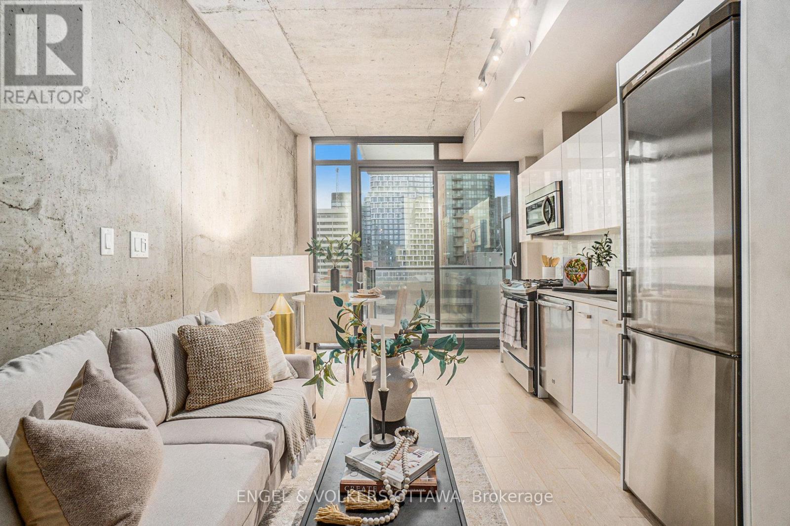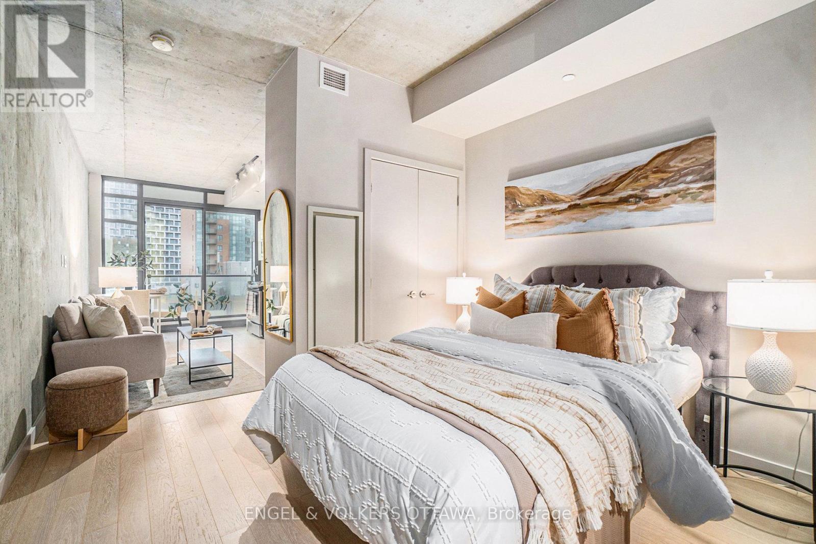 Welcome to Gotham, one of Ottawa's most striking and contemporary condominiums, designed by Lamb Development Corporation. This sophisticated studio suite combines sleek modern finishes with an unbeatable downtown location - perfect for professionals, investors, or anyone seeking a vibrant urban lifestyle. The unit offers a bright open-concept layout with floor-to-ceiling windows, hardwood flooring, and 9ft exposed concrete ceilings that create a modern, loft-inspired aesthetic. Step outside to your private balcony, perfect for relaxing with city views. Residents of Gotham enjoy premium amenities, including 24-hour concierge service, a stylish party room with full kitchen and outdoor terrace, BBQ area, and bike storage. Located in the heart of Centretown, Gotham places you steps from Lyon LRT Station, Parliament Hill, LeBreton Flats, and the Rideau Canal. Enjoy Ottawa's best cafés, restaurants, and shops within walking distance, along with excellent walk, bike, and transit scores. This well-managed building blends architectural style with urban convenience - offering the perfect balance between downtown energy and private retreat. Whether as a first home or investment, this studio delivers modern design, lasting value, and an unbeatable location in the heart of Ottawa. *426sqft + 43 sqft balcony (41944354)