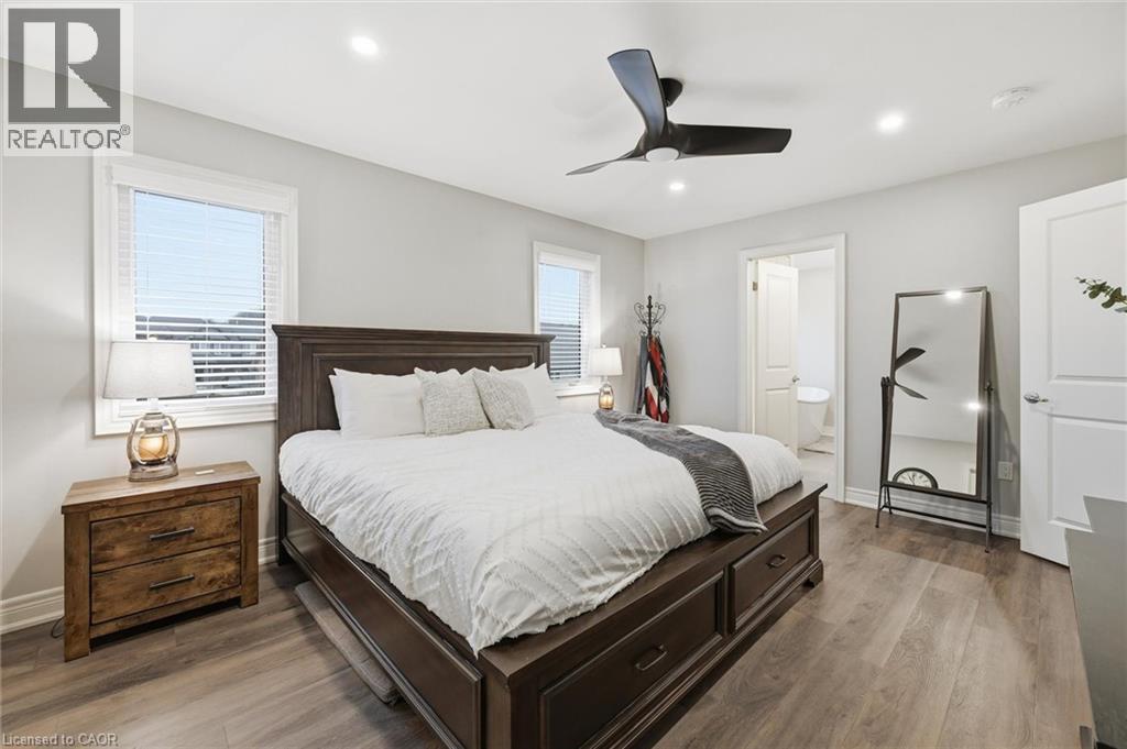 Bedroom with wood finished floors, a ceiling fan, recessed lighting, and ensuite bath