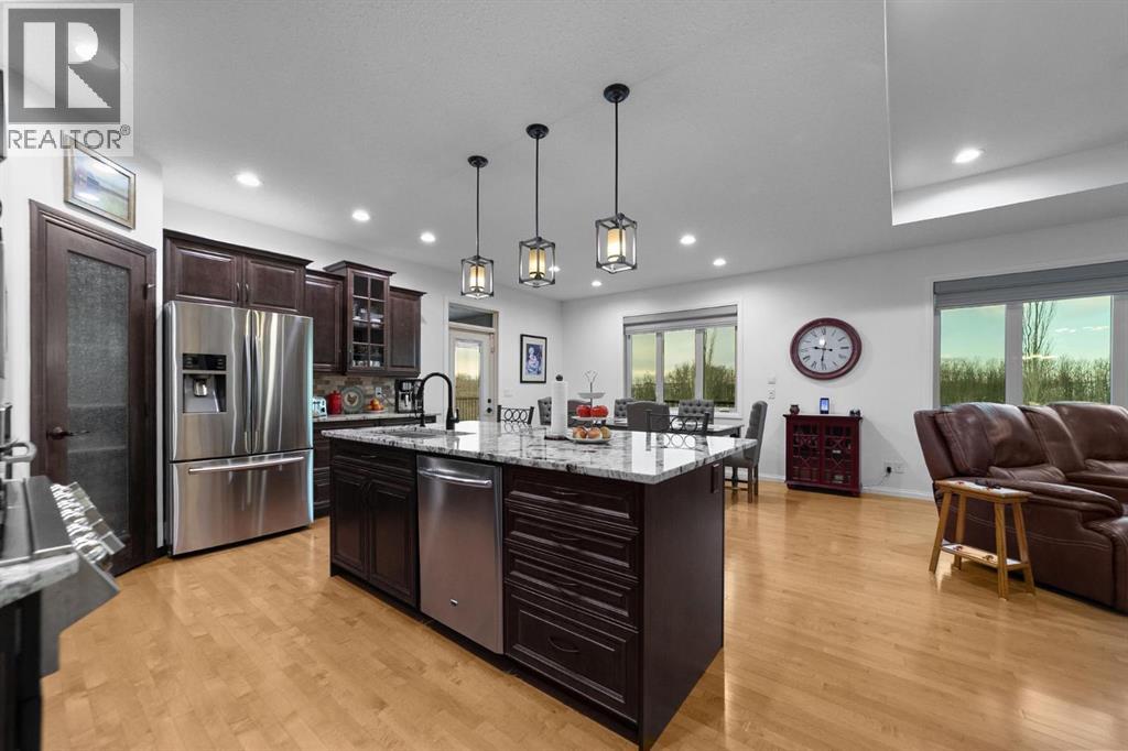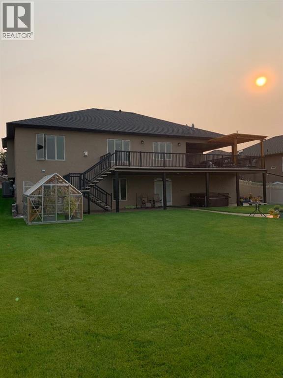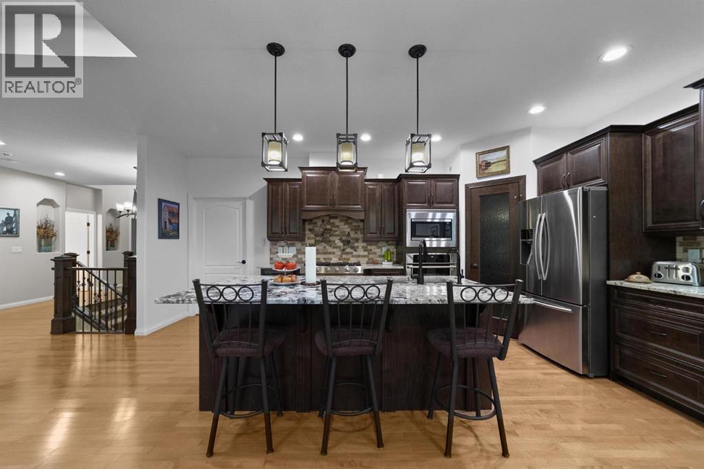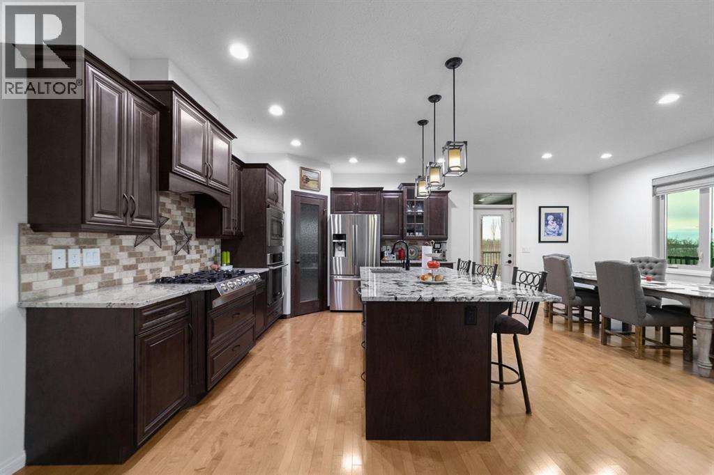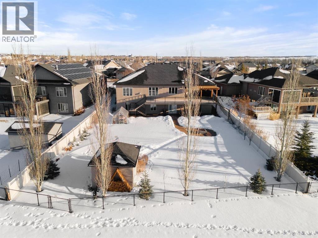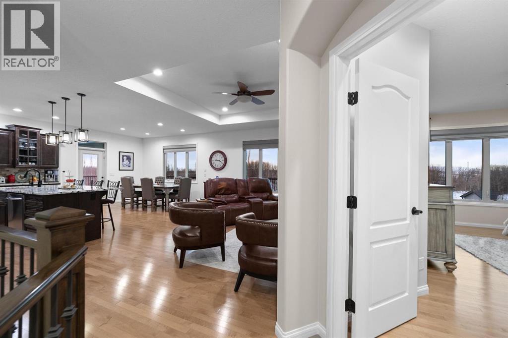Experience unmatched views and exceptional craftsmanship in this stunning custom-built walkout bungalow, perfectly positioned in Valleyview overlooking the breathtaking valley landscape. Offering 3 bedrooms, 3 bathrooms, this home blends elegance, comfort, and thoughtful design across a bright, open-concept floor plan. Expansive windows flood the space with natural light—complemented by coffered ceilings, motorized blinds, and rich hardwood flooring. The impressive great room showcases a striking stone fireplace and open staircase framing panoramic views. The chef-inspired kitchen features granite countertops, a large entertaining island, 36” gas cooktop, built-in oven and microwave, and a spacious walk-in pantry. The adjoining dining space extends to a wrap-around covered deck, offering year-round enjoyment and remarkable valley scenery. The luxurious primary suite is a private retreat complete with spa-style ensuite and walk-in closet, with main-floor laundry and air conditioning adding everyday convenience. The fully finished walkout basement is designed for living and entertaining—featuring in-floor heat, a generous media/games area, additional bedroom and den, and a second stone fireplace. Step outside onto the covered patio with hot tub and firepit, perfect for unwinding or hosting guests. Sitting on a beautifully landscaped oversized lot with full irrigation, greenhouse, and storage shed, this home also includes an oversized heated 4-car garage with epoxy flooring. Exterior CHIC Permanent Stucco Protection offers lasting peace of mind with warranty. A rare opportunity to own a premier walkout bungalow with incredible views, premium finishes, and every detail considered—welcome home. (31527479)
