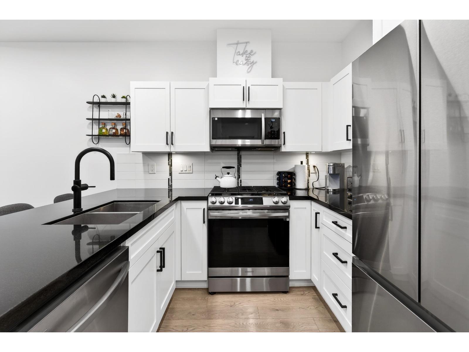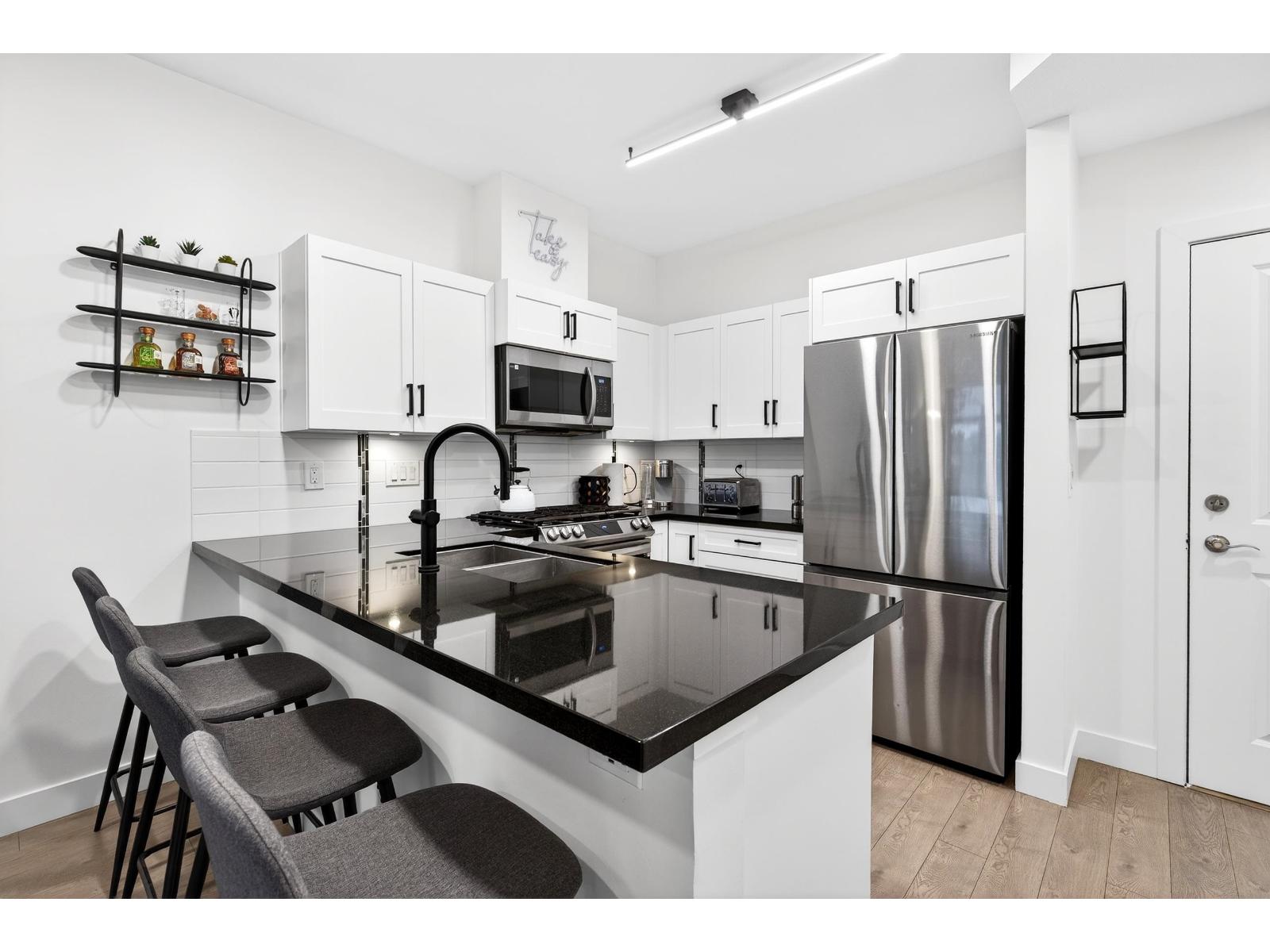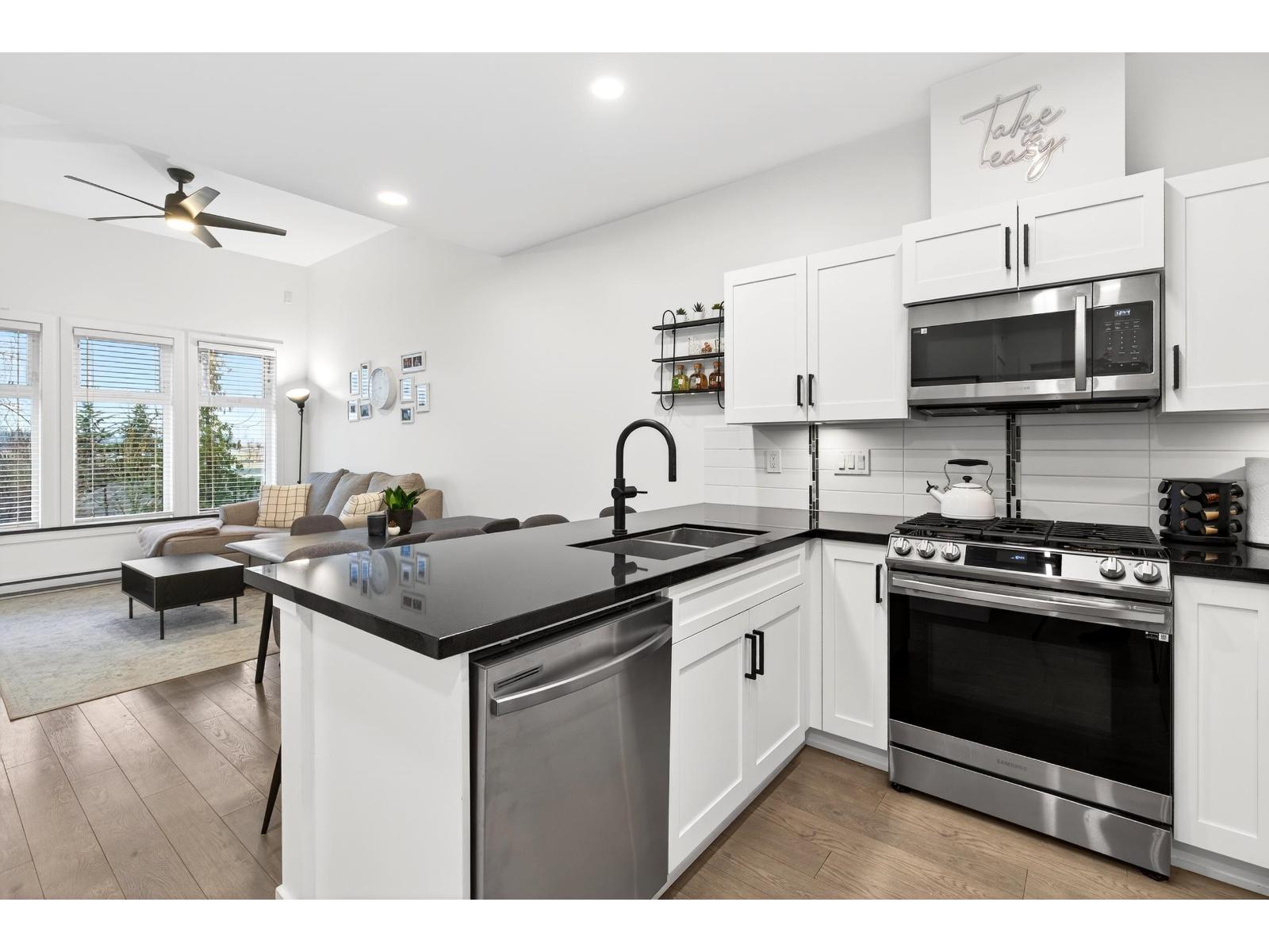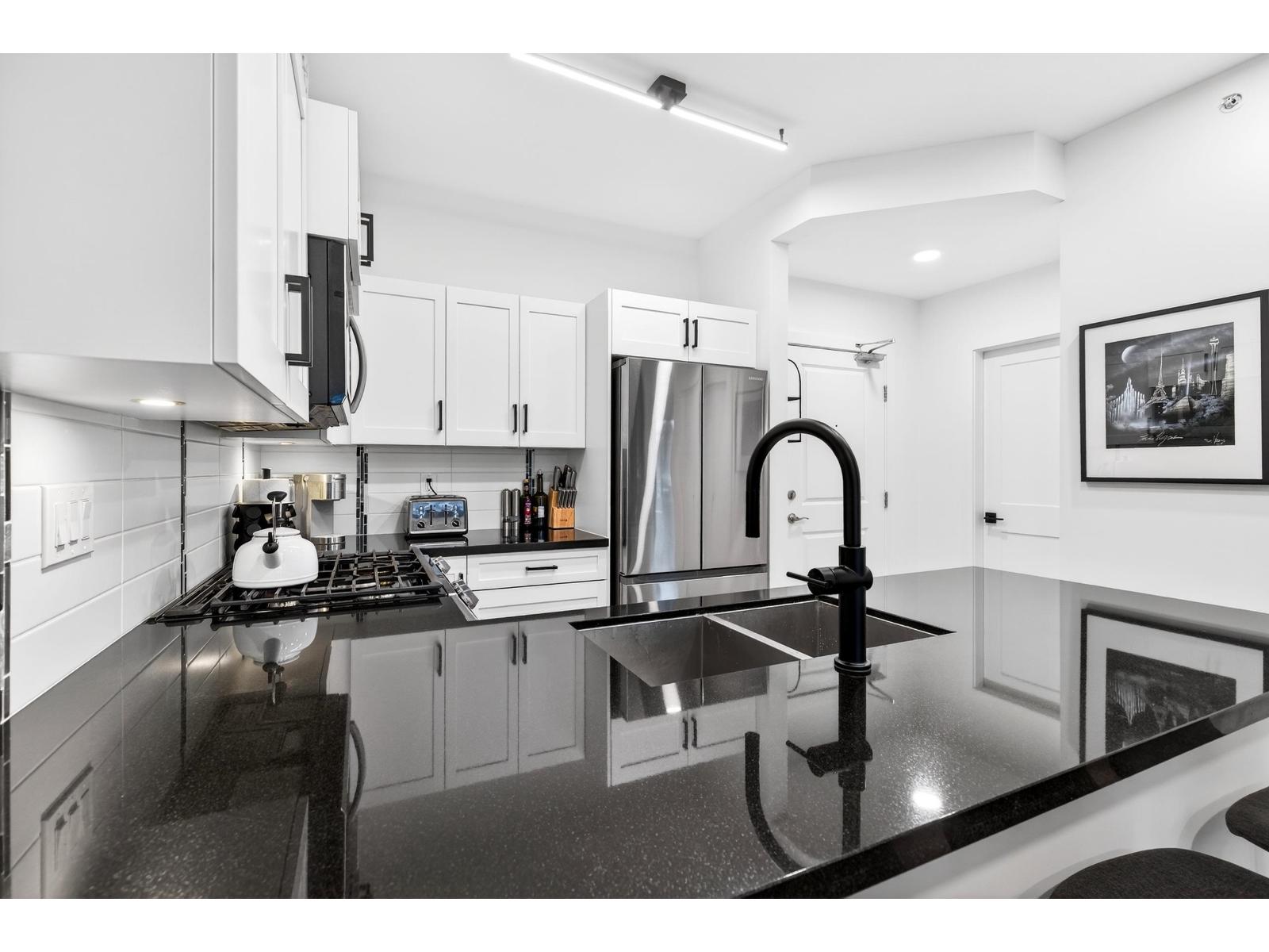 Stunning TOP FLOOR home in the highly sought-after Varsity, overlooking greenery and the North Shore mountains with beautiful sunset VIEWS. This bright, open-concept unit features vaulted ceilings, oversized windows, an updated kitchen, brand-new washer & dryer, plus all new interior doors throughout. The spacious bedroom offers a walk-through closet and cheater ensuite, an ideal one-bedroom layout. Enjoy your private balcony with gas hookup, perfect for year-round use. Unbeatable location near the future Surrey-Langley SkyTrain extension, and just steps to Willowbrook Shopping Centre, transit, restaurants, schools, and daily conveniences. Pet-friendly (2 dogs or cats, no size restriction). Includes 1 underground parking stall and 1 storage locker. Call now to view! (32329885)