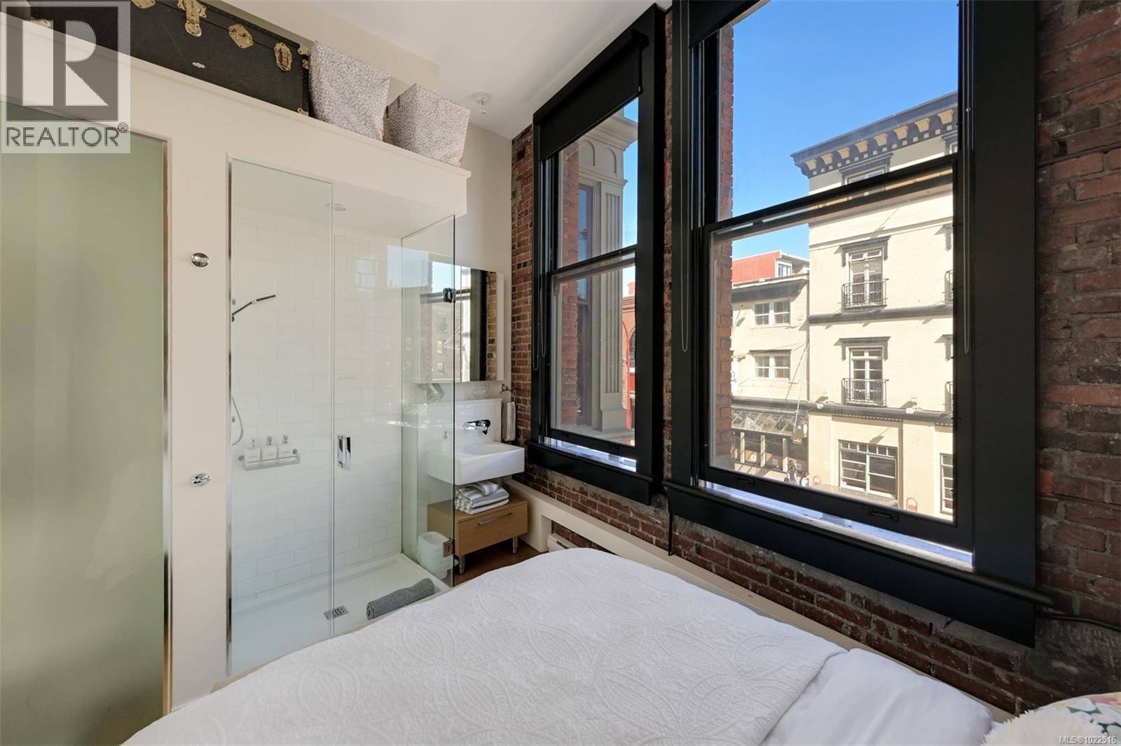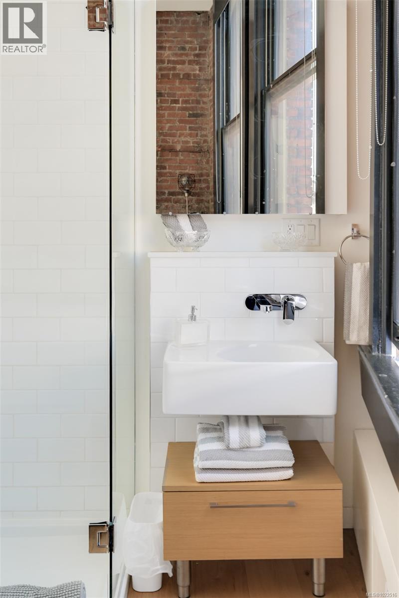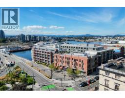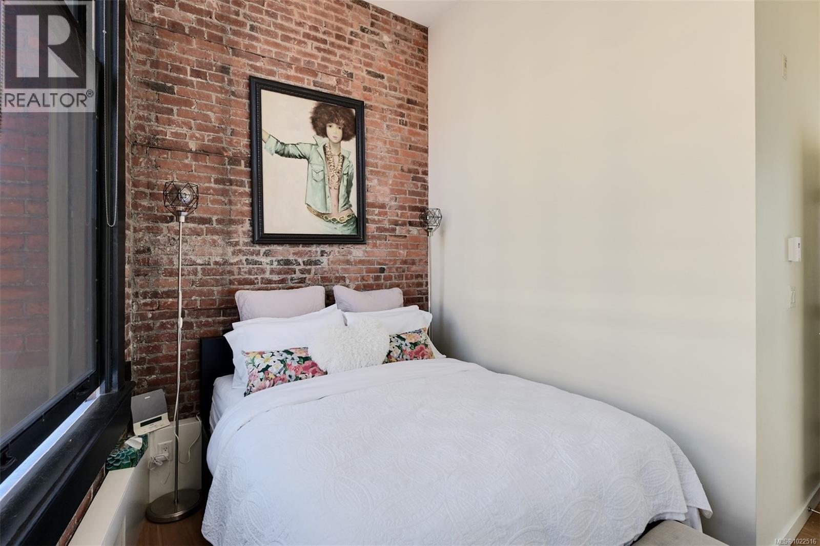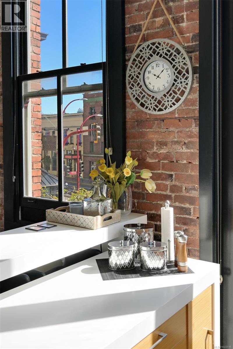 Experience urban living in the iconic Janion building, where heritage charm meets modern style. This bright south-facing 2-bedroom features original exposed brick, oversized windows, and views of the bustling city and Inner Harbour. Designed with efficiency in mind, it offers a built-in wall bed, integrated storage, engineered oak flooring, quartz countertops, a hidden-drawer dishwasher, refrigerator, freezer, and in-suite washer & dryer. Enjoy in-floor heating in the bathroom for added comfort. The Janion boasts premier amenities: rooftop terrace with BBQ and kitchen, fitness centre, conference room, bike/kayak storage, and internal beach access. Located in the heart of Downtown Victoria, steps to shops, dining, and the waterfront. Ideal for students, digital nomads, or snowbirds as it's fully furnished; this New York style condo is your gateway to the best of the city. Location, lifestyle, and iconic views—this is modern living at its finest. (30275261)