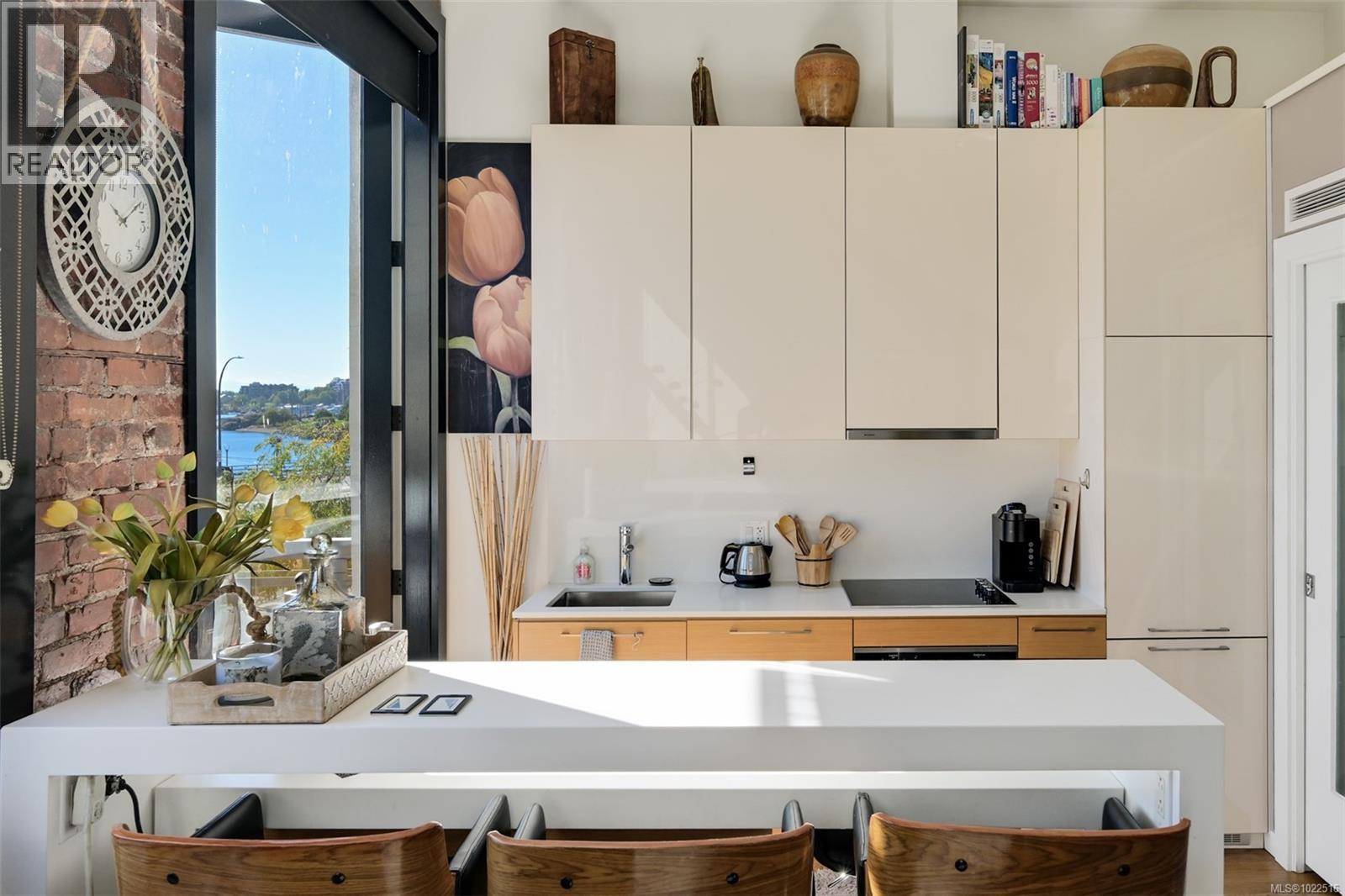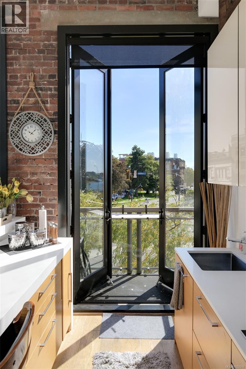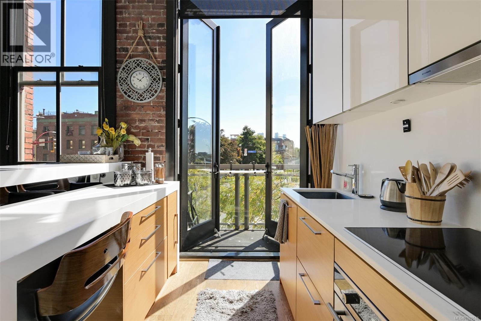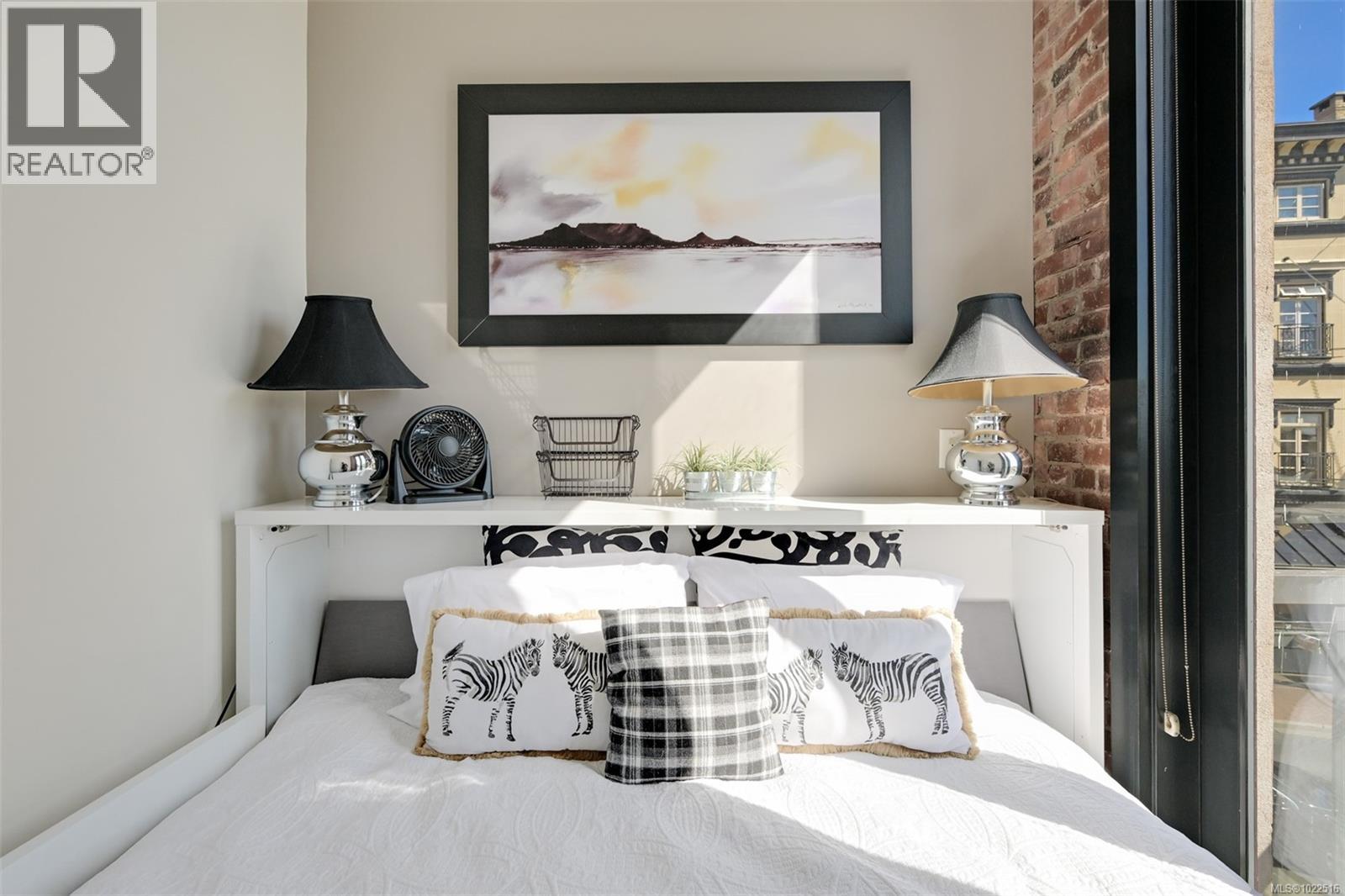 Experience urban living in the iconic Janion building, where heritage charm meets modern style. This bright south-facing 2-bedroom features original exposed brick, oversized windows, and views of the bustling city and Inner Harbour. Designed with efficiency in mind, it offers a built-in wall bed, integrated storage, engineered oak flooring, quartz countertops, a hidden-drawer dishwasher, refrigerator, freezer, and in-suite washer & dryer. Enjoy in-floor heating in the bathroom for added comfort. The Janion boasts premier amenities: rooftop terrace with BBQ and kitchen, fitness centre, conference room, bike/kayak storage, and internal beach access. Located in the heart of Downtown Victoria, steps to shops, dining, and the waterfront. Ideal for students, digital nomads, or snowbirds as it's fully furnished; this New York style condo is your gateway to the best of the city. Location, lifestyle, and iconic views—this is modern living at its finest. (30275261)