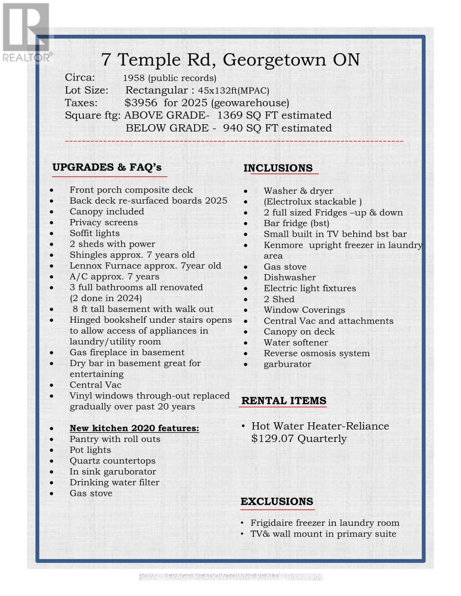 Very few homes come up for sale on Temple Street... Georgetown's friendliest street! Organized neighbourhood events and everyone looks out for each other offering a safe haven & a community you can call home. Deceptive from the street-this home is MUCH larger than it looks. This 4 bedroom 3 full bath home with a walk out basement(8ft tall) has been renovated top to bottom and sits on a 132 ft deep lot. Arrive at the charming front porch with composite decking with sunny street views. Gorgeous chef's kitchen installed in 2020 features pantry with roll outs, pot lights, quartz countertops, gas stove and additional serving station with extra storage built into the bay window area. Dining area allows for table extension for large family gatherings & is open concept to the living room which feature pot lights as well. 4 pc bath on main level was renovated in 2024. 4th bedroom on main floor. Upper level offers 3 bedrooms including a huge primary suite with large closet and ensuite bath. The lower level is fabulous for entertaining with additional kitchen cabinets (no stove) and bar area- large TV area and gorgeous 3 pc bath reno'd in 2024. The walk out brightens the space and combined with the tall ft ceilings- it sure doesn't feel like a basement! The expansive deck with canopy, BBQ, lighting and privacy screens provide ample entertaining space for large crowds and a surprising amount of privacy. There are 2 additional sheds-both with power to take care of your storage/workshop needs. This turn key home is offered for a buyer who does not want a "to do" list. A home you will love is waiting for you at 7 Temple Rd. FAQ's: shingles approx 7 years old, Lennnox Furnace and a/c approx 7 years old. 2 renovated baths in 2024, vinyl windows throughout replaced gradually over the past 20 years. Water softener is owned. Tank is rented. Driveway paved Nov 2025 (41950590)