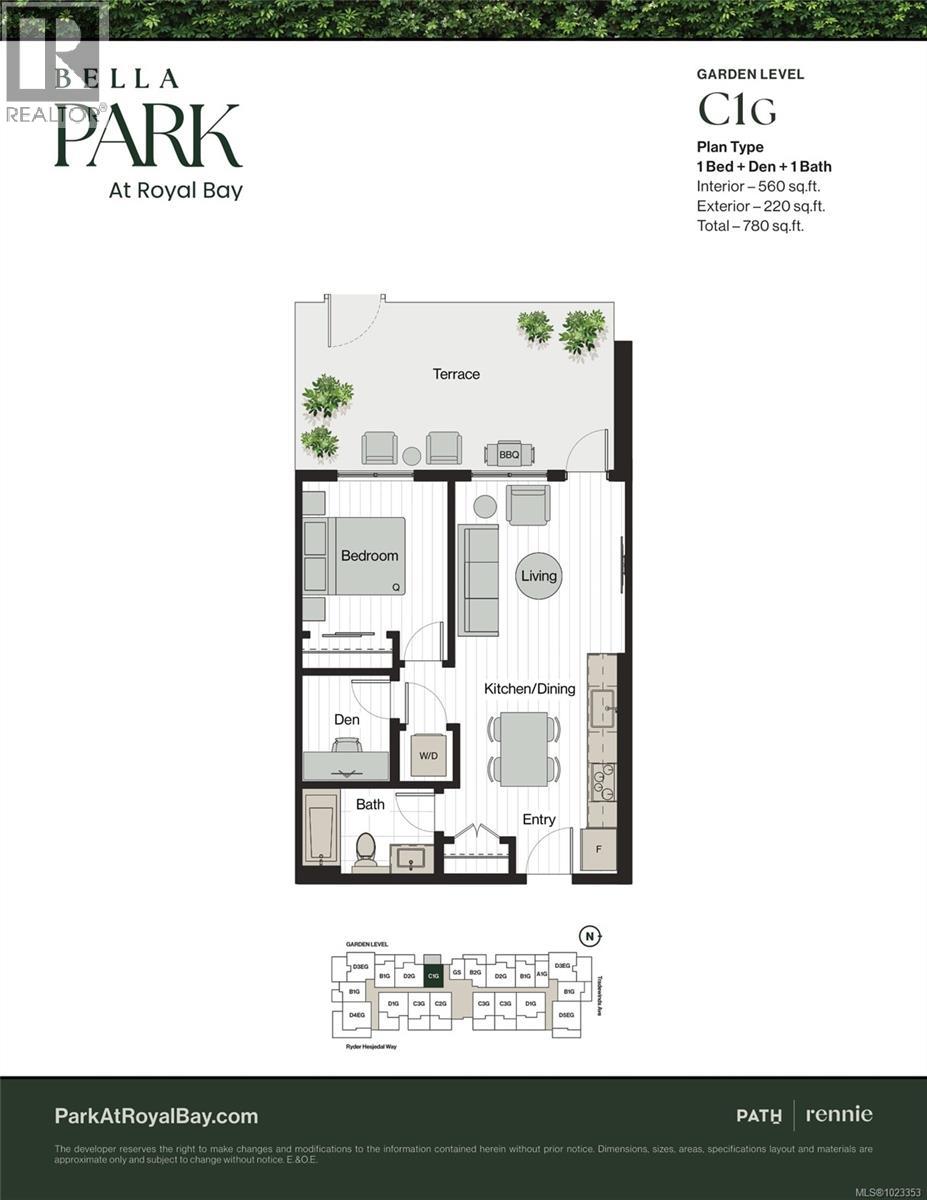 Discover the essence of living at Bella Park, crafted by the award-winning PATH. This thoughtfully designed 1-bedroom plus den, 1-bath west-facing condo seamlessly blends style and functionality. With over-height ceilings and a spacious walk-out patio providing convenient secured in-and-out access - perfect for pet owners. The modern kitchen features quartz countertops, stainless steel appliances, an induction cooktop, and ample storage. Residents have exclusive access to a Clubhouse with a lounge, a fully-equipped fitness centre, and a yoga space. Unwind in the outdoor hot tub, sauna, cold plunge, and outdoor shower. The community boasts over 2 acres of green space, a bocce court, and more. Practical amenities like EV-ready parking, two guest suites, and close proximity to parks and the beach enhance your living experience. Situated just steps from the urban conveniences at the Commons, this oceanside community at Royal Bay offers a serene and vibrant atmosphere. Price + GST (30276605)